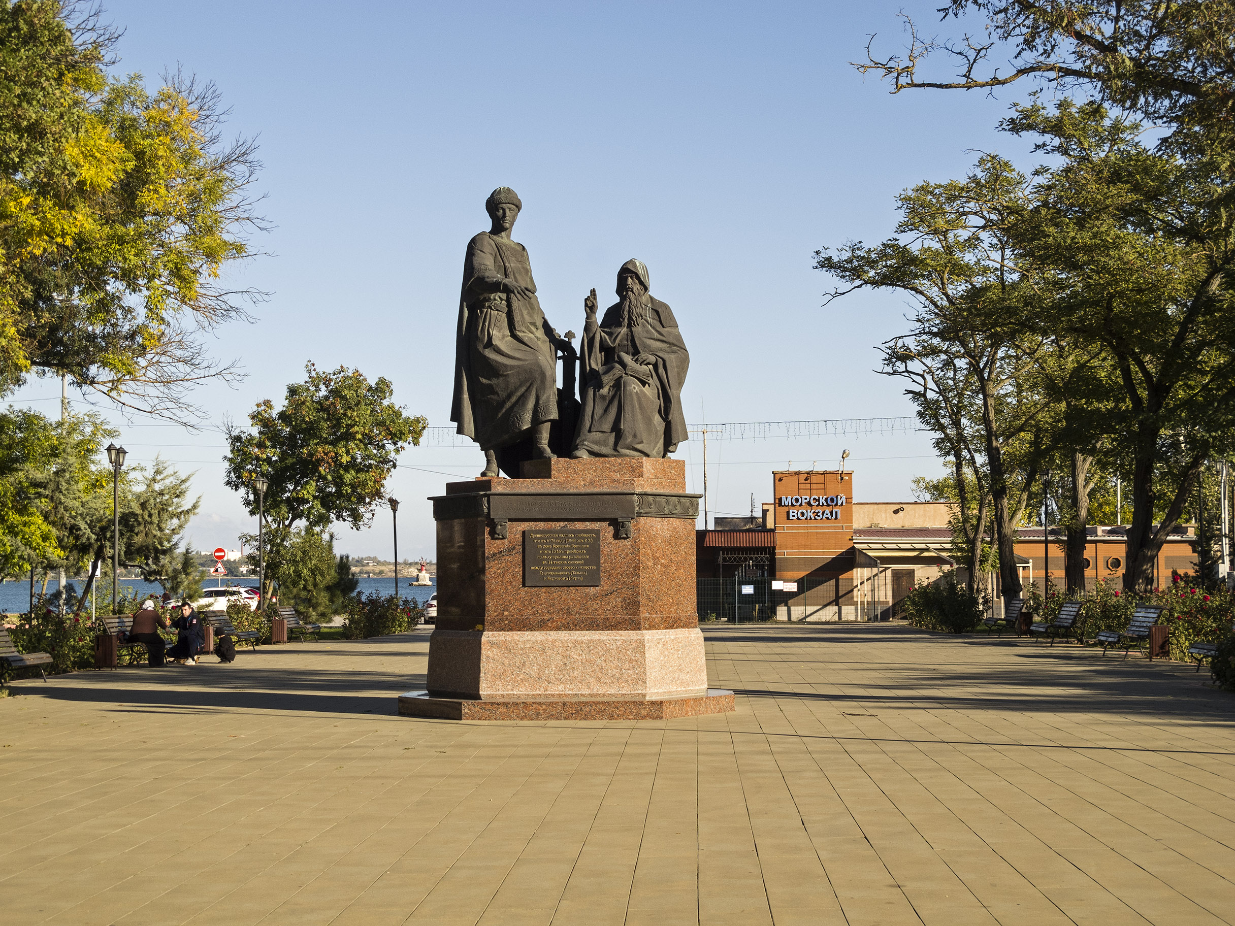Город-герой Керчь встретил меня прекрасной погодой: тихо, безоблачно и довольно тепло (). Перейдя по пешеходному мосту на другую сторону, я удачно подсел на автобус, и через 20 минут был в центре города (). После заселения на Театральной, 22 пошёл на прогулку, и первым делом зашёл в спортивный магазин и купил там трек-палки - ведь мне предстояли довольно продолжительные пешие прогулки по холмам и горам Крыма.