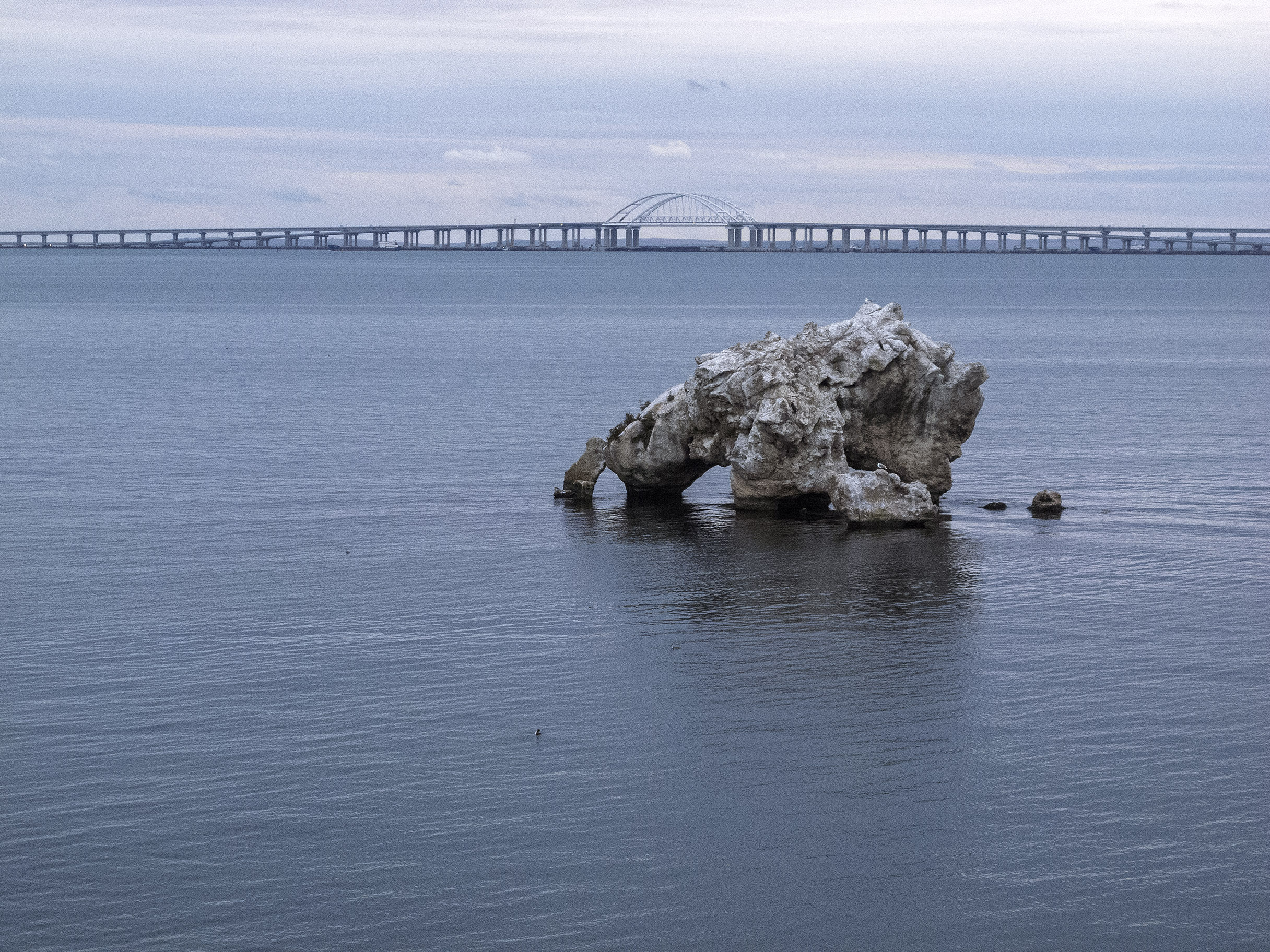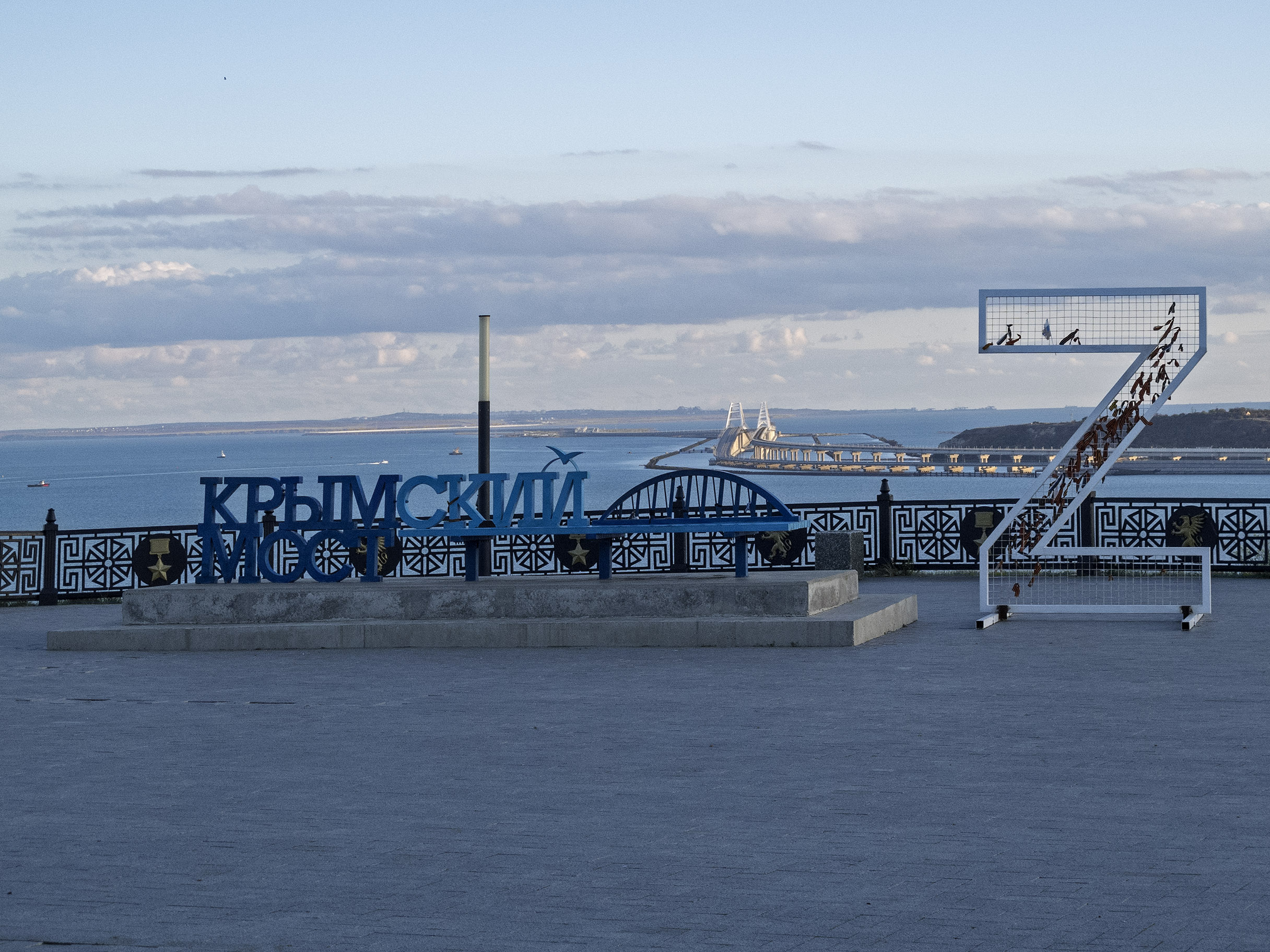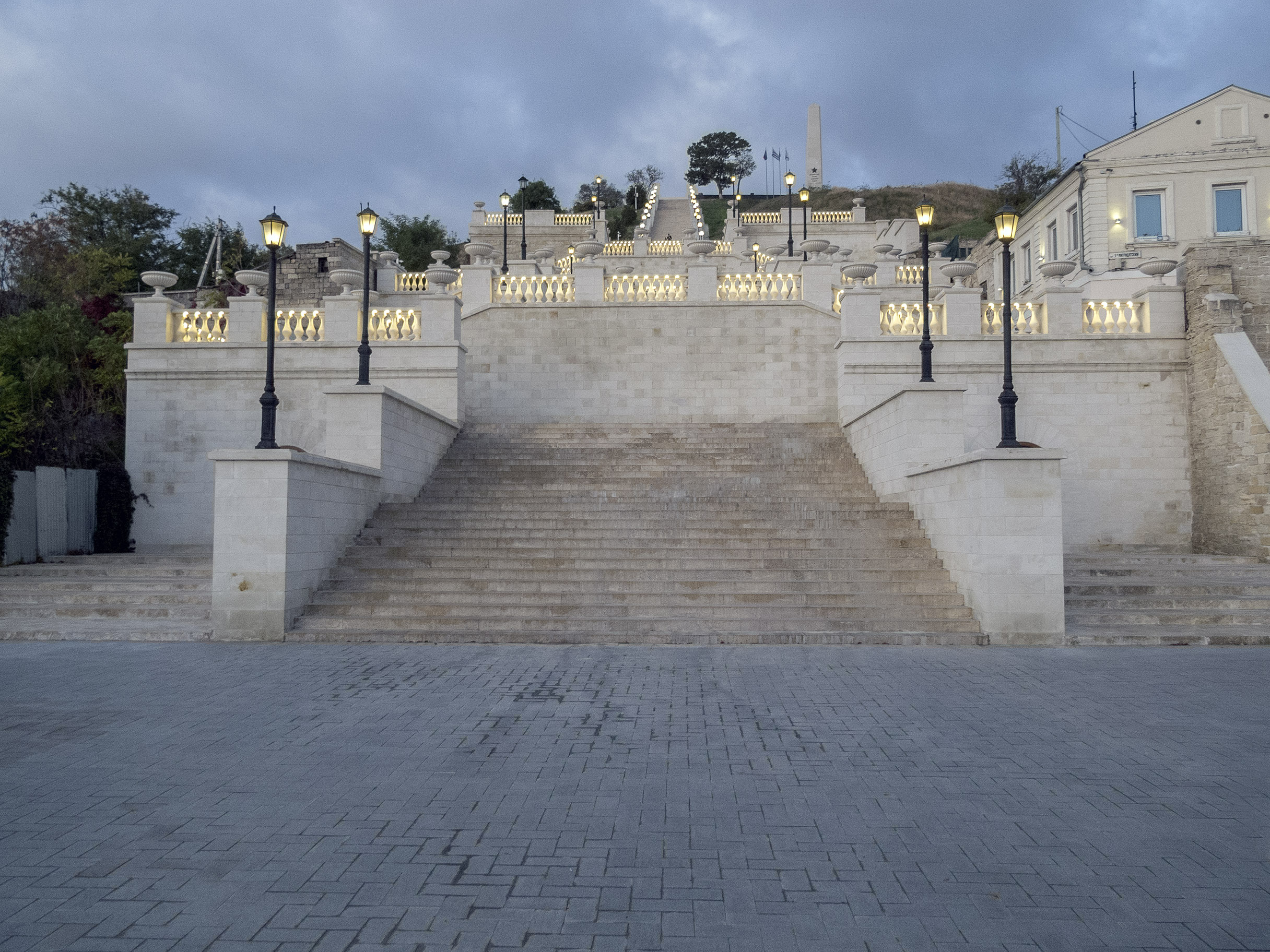 Вечером поднялся на гору Митридат, благо, она была в непосредственной близости от моего жилья. Последний раз я поднимался на гору в 2016 году, и то не по лестнице, а по серпантину, так как тогда я был на велосипеде. А теперь мне предстояло пешком преодолеть 425 ступенек. Надо заметить, что за эти годы Большую Митридатскую лестницу полностью отремонтировали, а на вершине установили памятную скамейку с надписью: «Крымский мост» (). Обелиск славы красиво подсвечивался лучами заходящего солнца (). Но светило вскоре спряталось за горизонт, краски поблекли, стало заметно холодать (всё-таки осень!) - я спустился вниз, немного погулял по вечерним улицам и вернулся на квартиру.