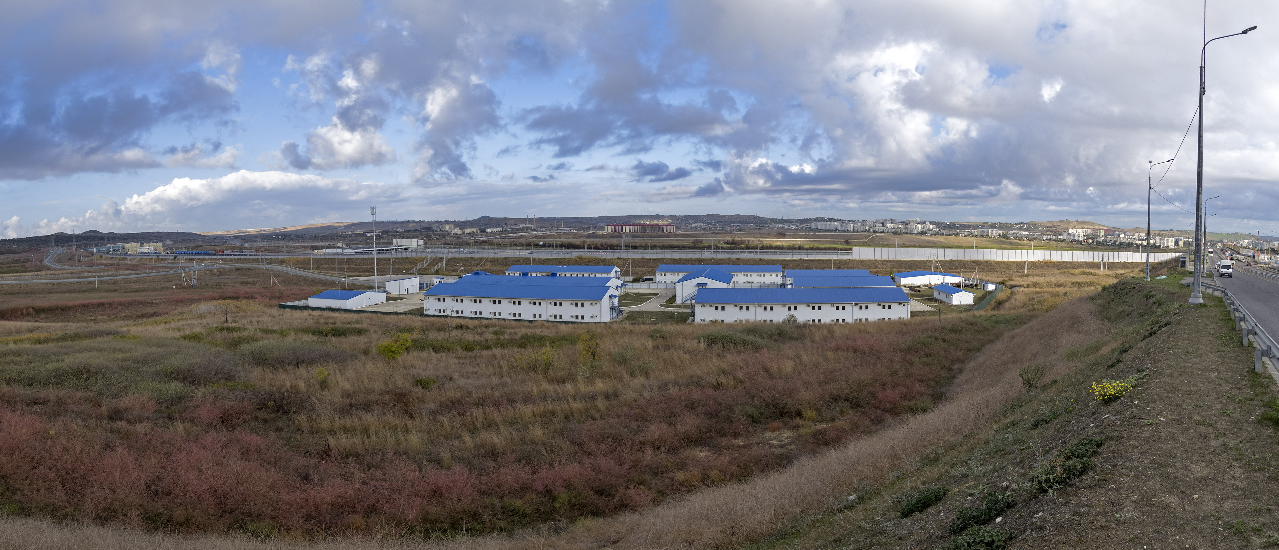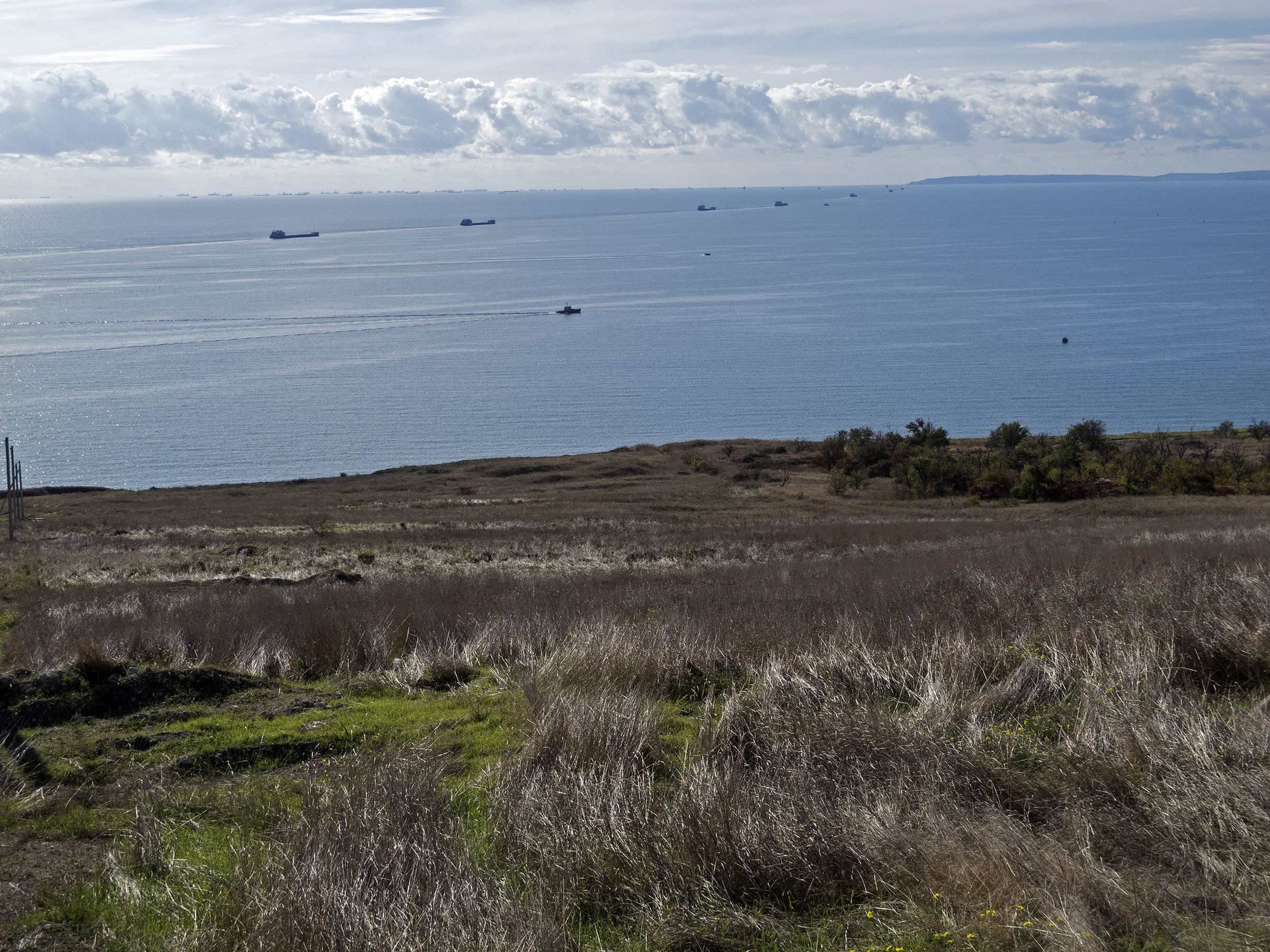 На следующий день было запланировано посетить несколько объектов. Это крепость Керчь, Аджимушкайские каменоломни и руины древнего города Мирмекий. Вначале я направился к крепости, так как там должна быть экскурсия в 10 часов. Чтобы добраться туда вовремя, надо было выйти рано утром, дойти до автобусной остановки на ул. Пирогова и дождаться автобуса №40, который следует до улицы Олега Кошевого. А там уже надо идти пешком. Дойти-то я дошёл, но выяснилось, что экскурсия была отменена... Отдохнув на скамейке двадцать минут, мне ничего не оставалось делать, как вернуться обратно в город. На прощанье сфотографировал часть крепости (то, что можно было увидеть от ограждения), а также вереницу барж, идущих по фарватеру Керченского пролива ().