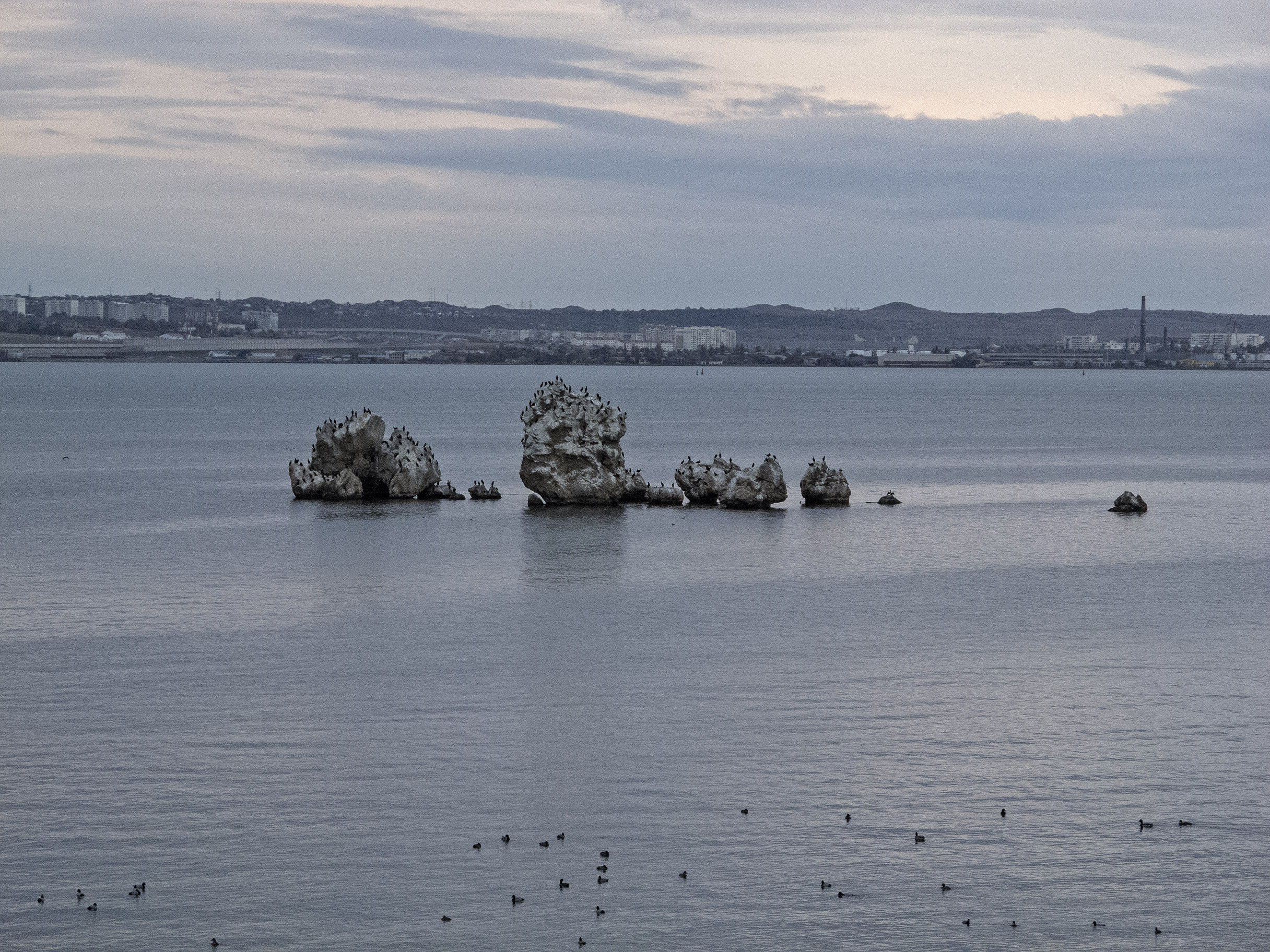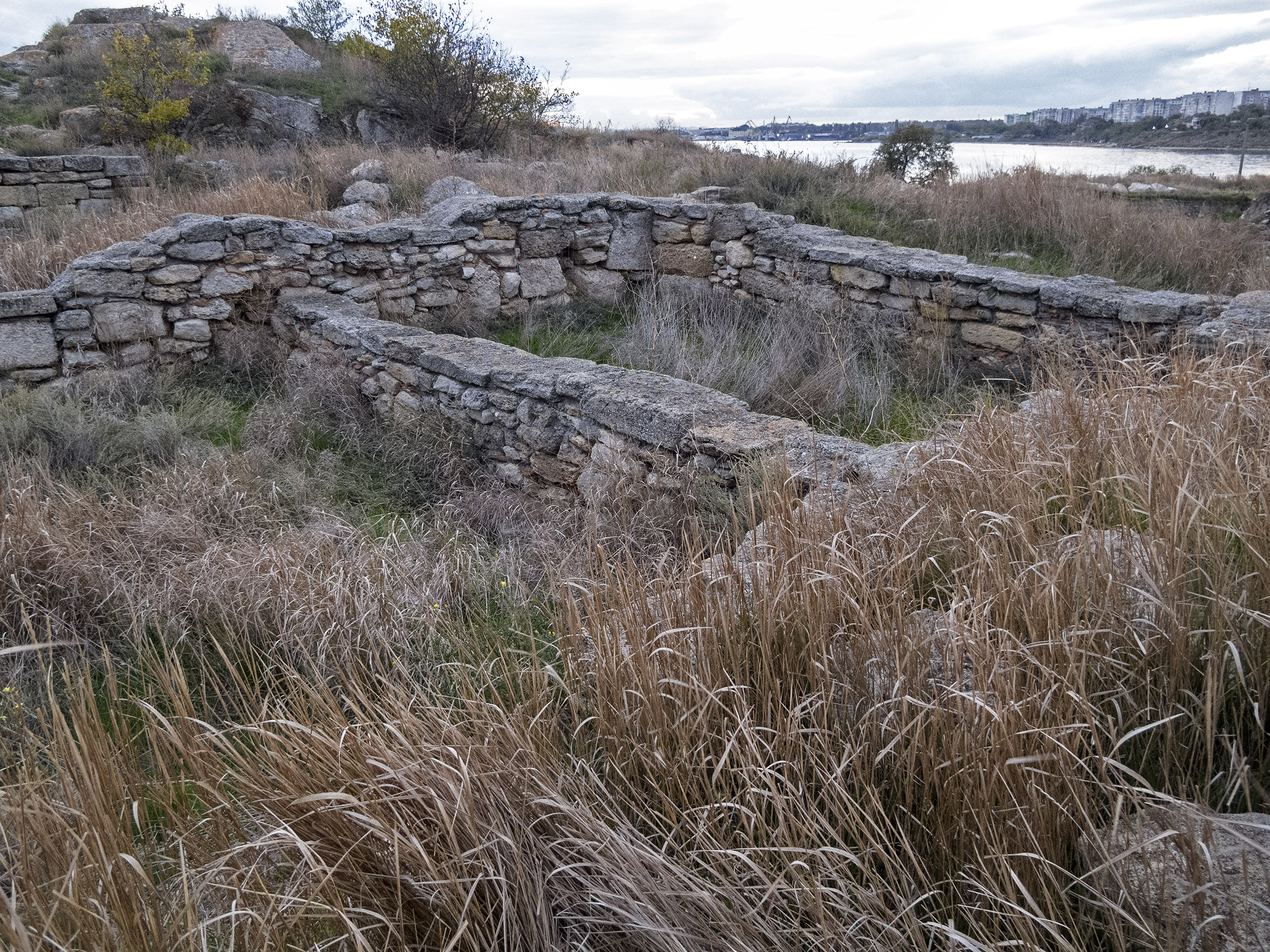 После посещения каменоломен пришла пора подкрепиться, и удачно подъехавший всё тот же автобус №4 вернул меня в центр города, где я и отобедал в неплохом баре под названием «Инки» (). До темноты ещё оставалась пара часов, и я решил прямиком отправиться на осмотр городища Мирмекий. Для этого воспользовался маршруткой №19, которая доставила меня до парка имени Войкова. Правда, сам парк, как и главная улица Керчи - улица Войкова - в данный момент находились в стадии ремонта, но передвигаться это не мешало (), и вскоре я вышел на обрывистый берег бухты, откуда открывался великолепный вид на море (). В воде множество скальных островков, среди которых наиболее известна скала «Бегемот» (). А вот и само городище... Надо заметить, что от него мало что осталось (). Наверное, такие места более интересны археологам, а у меня эти руины не вызвали восторга, тем более что уже начинало темнеть, а фонарика, как нарочно, я с собой не взял - надо выбираться к остановке автобуса ().