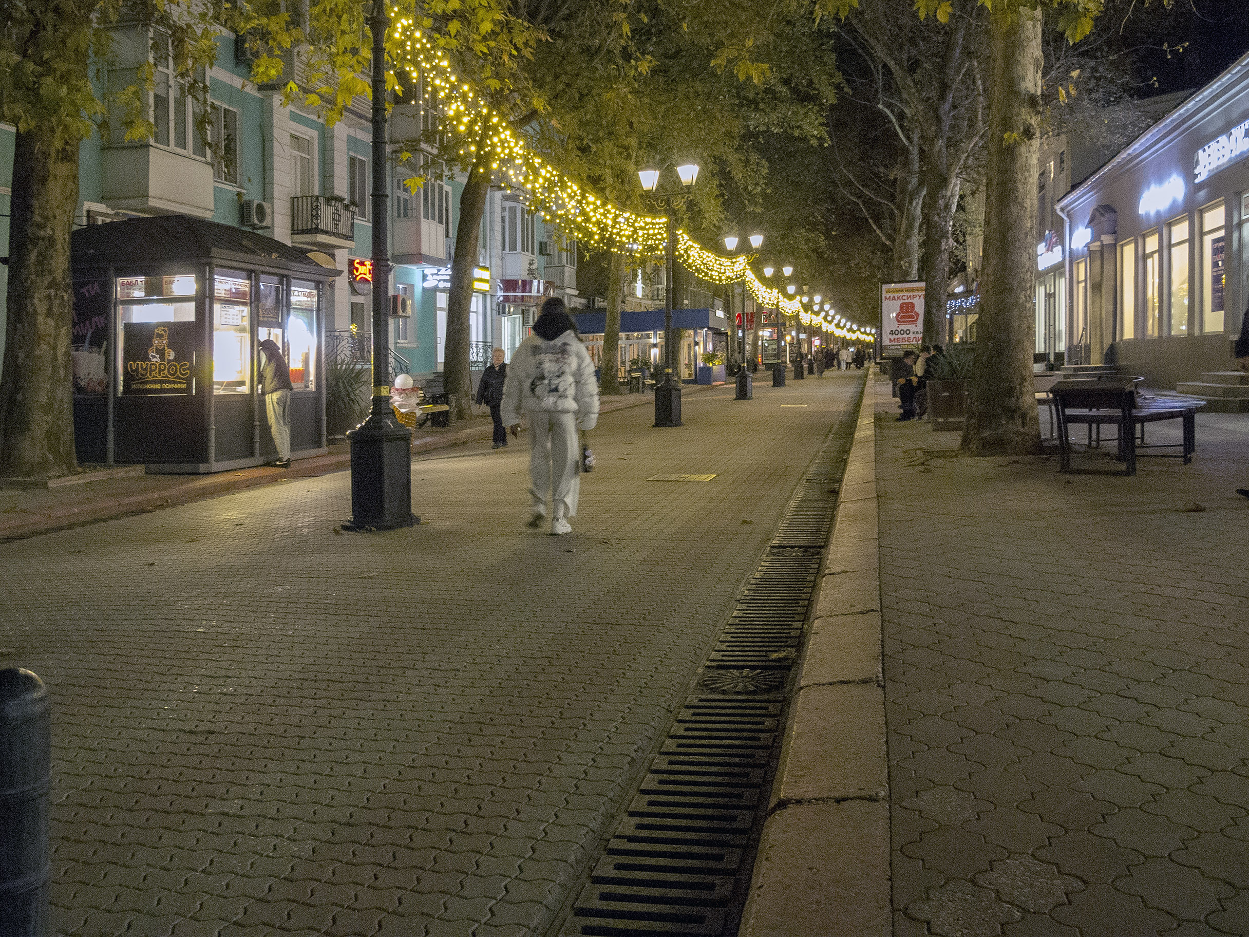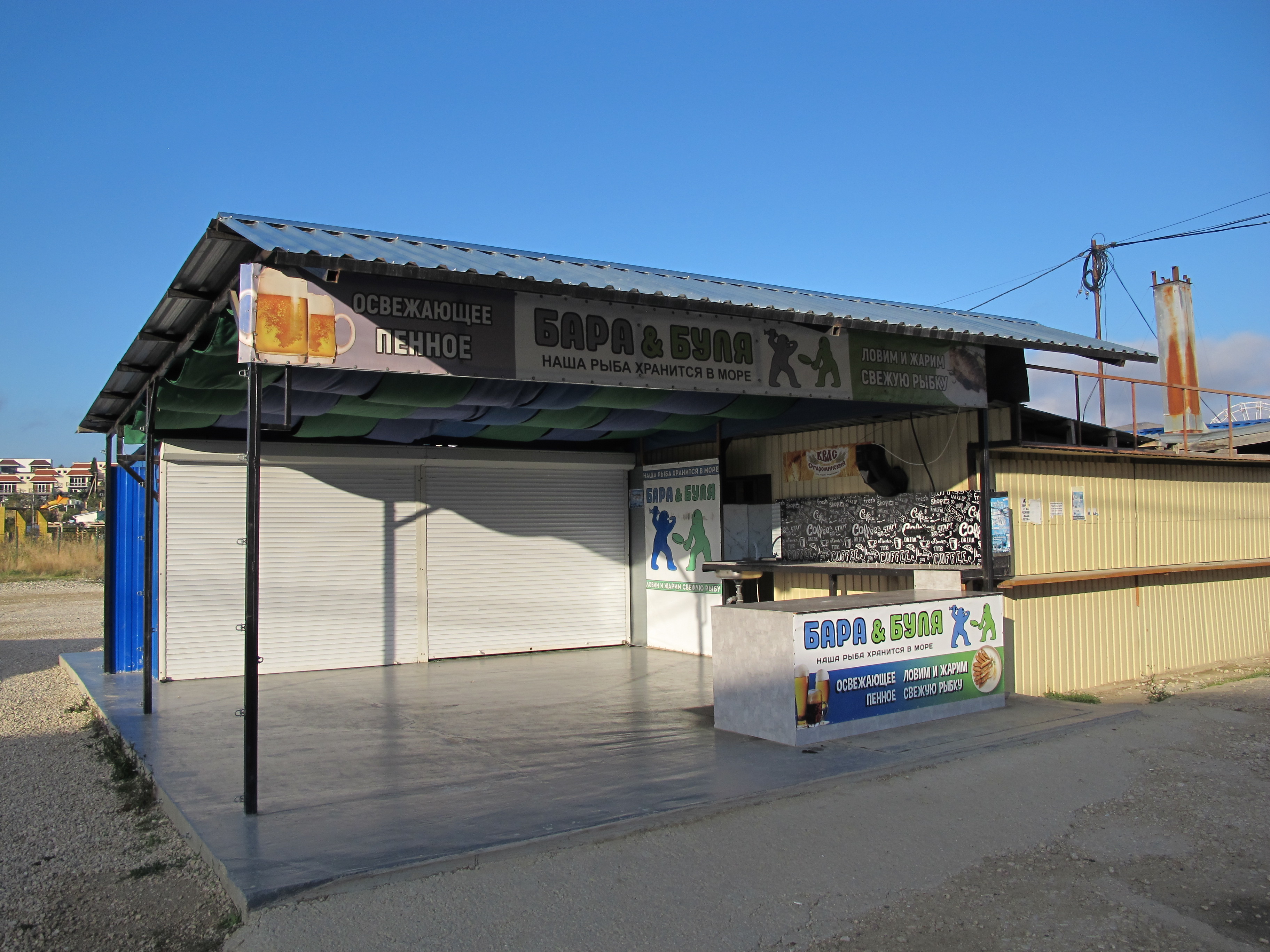 После заселения решил прогуляться по посёлку, а чтобы прогулка была с пользой, надо было подкрепиться. Ещё дома я определился с пунктами питания, и сейчас направился в один из них, под названием Бара-Буля. Шёл по треку, который завёл меня в дебри частного сектора с тропинкой шириной в метр... Но здесь навигатор меня не подвёл, и мы общими усилиями вышли-таки на улицу Приморскую, где должно находиться вышеупомянутое заведение. Кафе я нашёл, но, к сожалению, оно было закрыто, и по всей видимости, давно (), как и многие другие забегаловки на этой улице. Работал только небольшой магазинчик. Тогда я пытался выйти в сторону набережной, но повстречавшийся мужчина с собакой сказал, что на набережную мне не попасть - там идёт ремонт, всё перекрыто. Пришлось возвращаться на улицу Ленина, где работало единственное кафе с крымскотатарской кухней под названием «Тимур» - там я и отобедал.