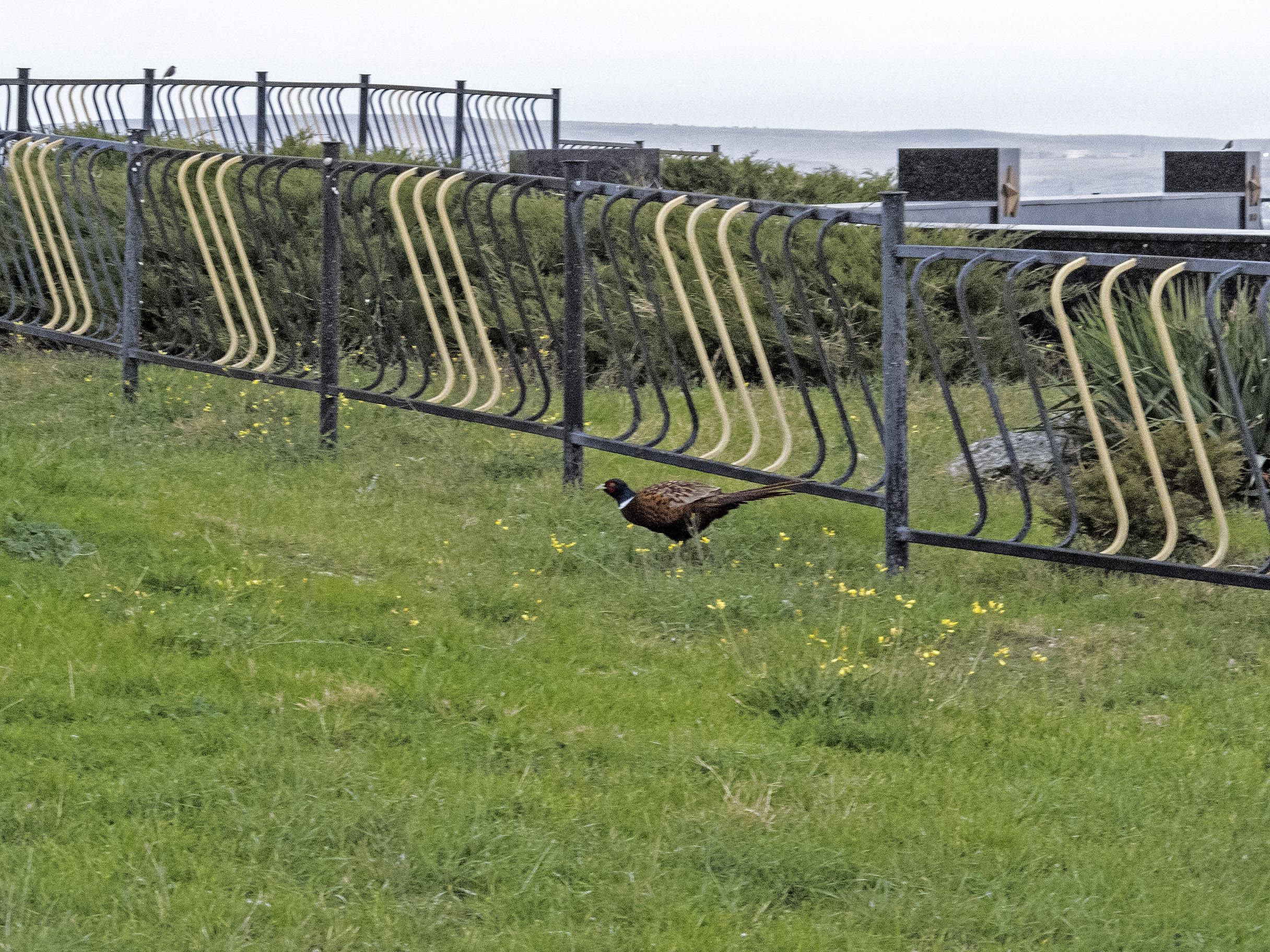 Утром, перед отъездом, решил ещё раз прогуляться на гору Митридат, чтобы встретить рассвет. В это раннее время подсветка лестницы ещё работала, что придало фотографии необычный колорит (). Согревающий марш-бросок по ступенькам - и я наверху. Там в такую рань никого не было, кроме... фазана, разгуливающего по травке (). Вообще-то это птица очень пугливая, но в этот раз мне удалось её запечатлеть, хотя и в невысоком качестве.