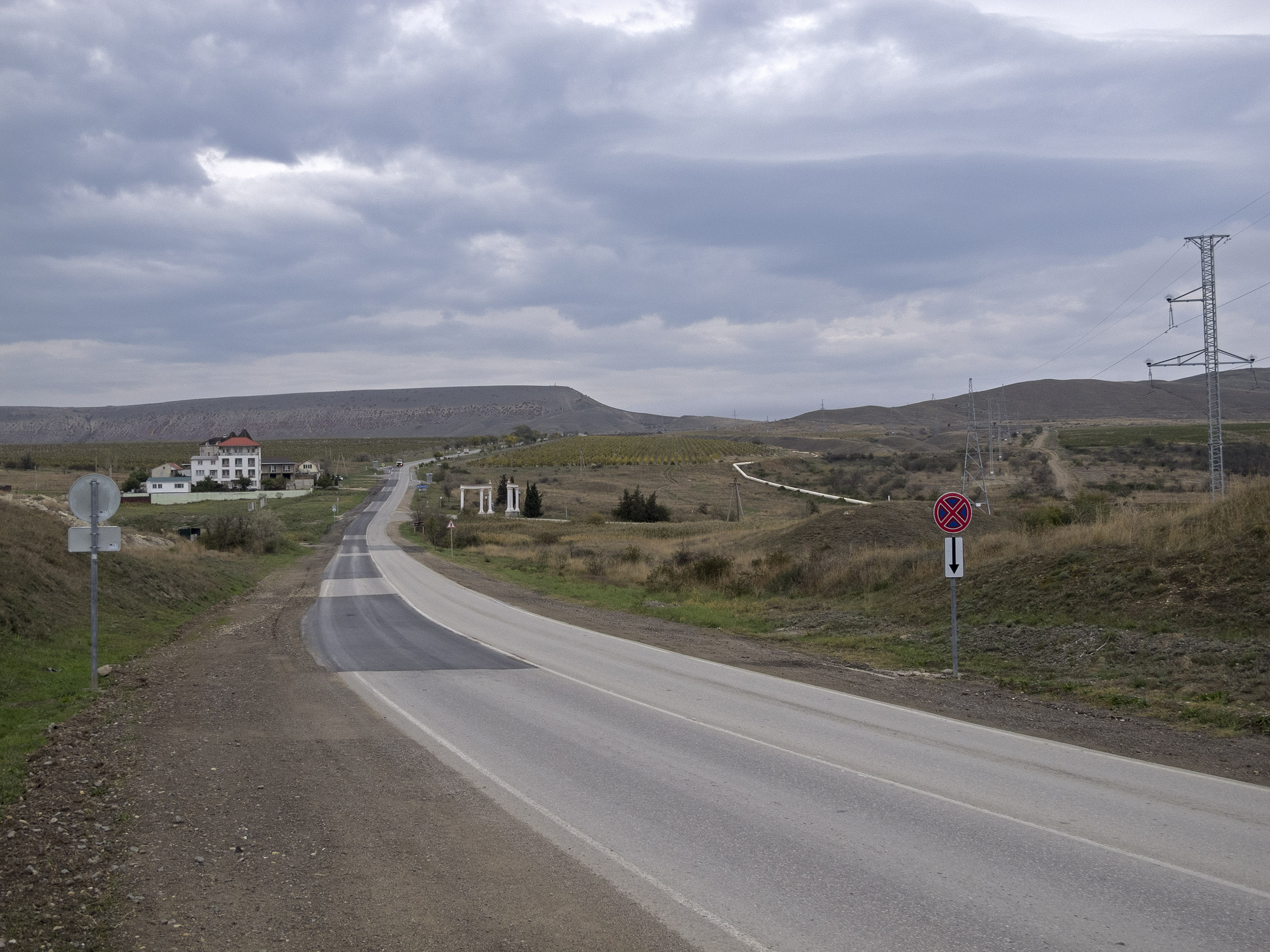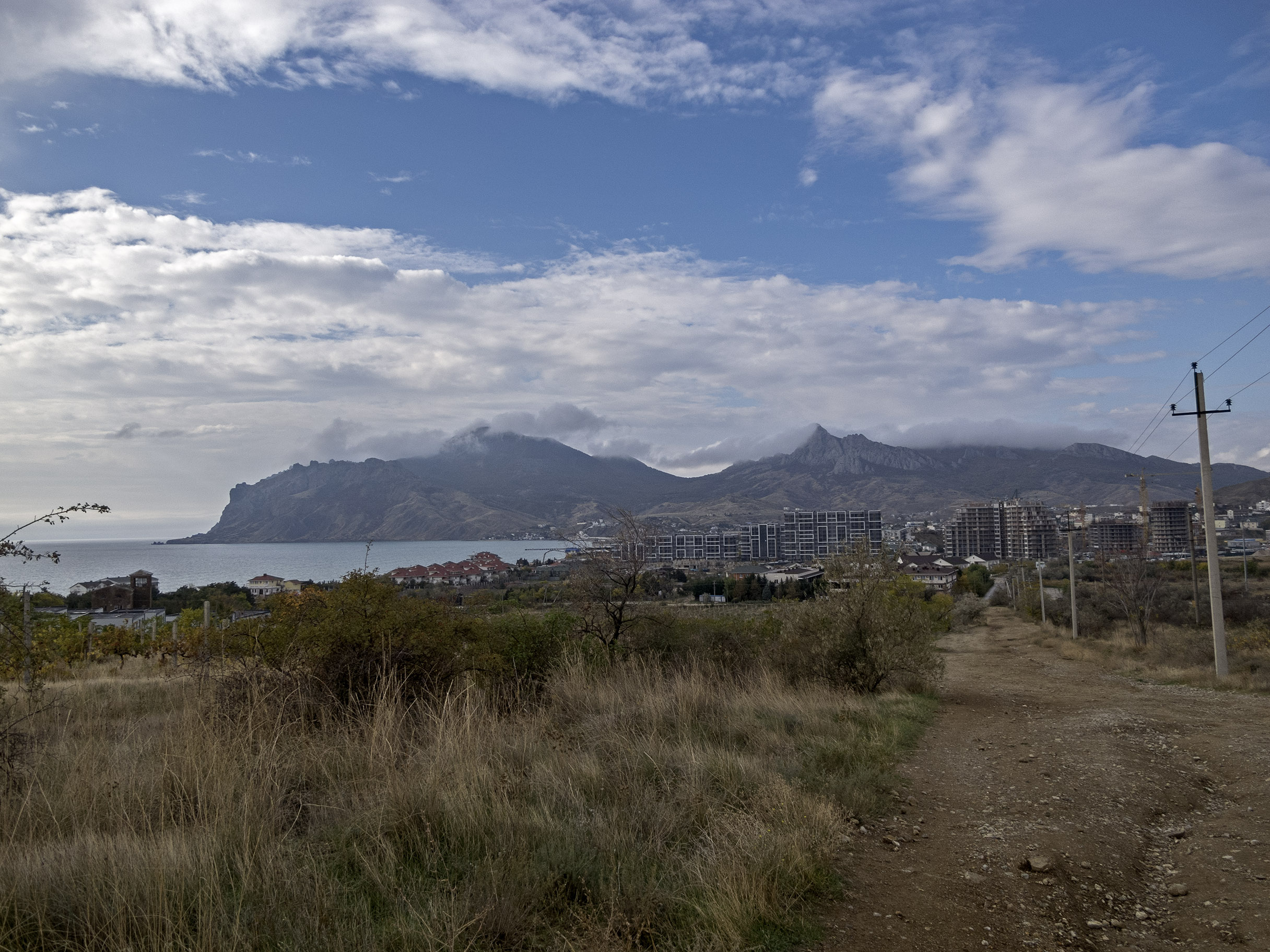 На случай, если мне не удастся попасть на Кара-Даг, был запасной вариант - посетить могилу Максимилиана Волошина, и, если останется желание и силы, прогуляться к мысу Хамелеон. Поэтому, с утра пораньше, вооружившись трек-палками и остатками вчерашнего вина, я отправился в путь. Дойдя по улице Ленина до конца посёлка, я не стал поворачивать к морю из-за жуткой грязи, которая образовалась из-за строительства многоэтажного комплекса (), и пошёл дальше по шоссе в сторону Феодосии (). Когда дошёл до поворота, на улицу Юнге, то почувствовал заметную усталость. Тогда привёл в рабочее положение свои трек-палки (до этого я нёс их в руках в сложенном виде) и почувствовал значительное облегчение в ходьбе.