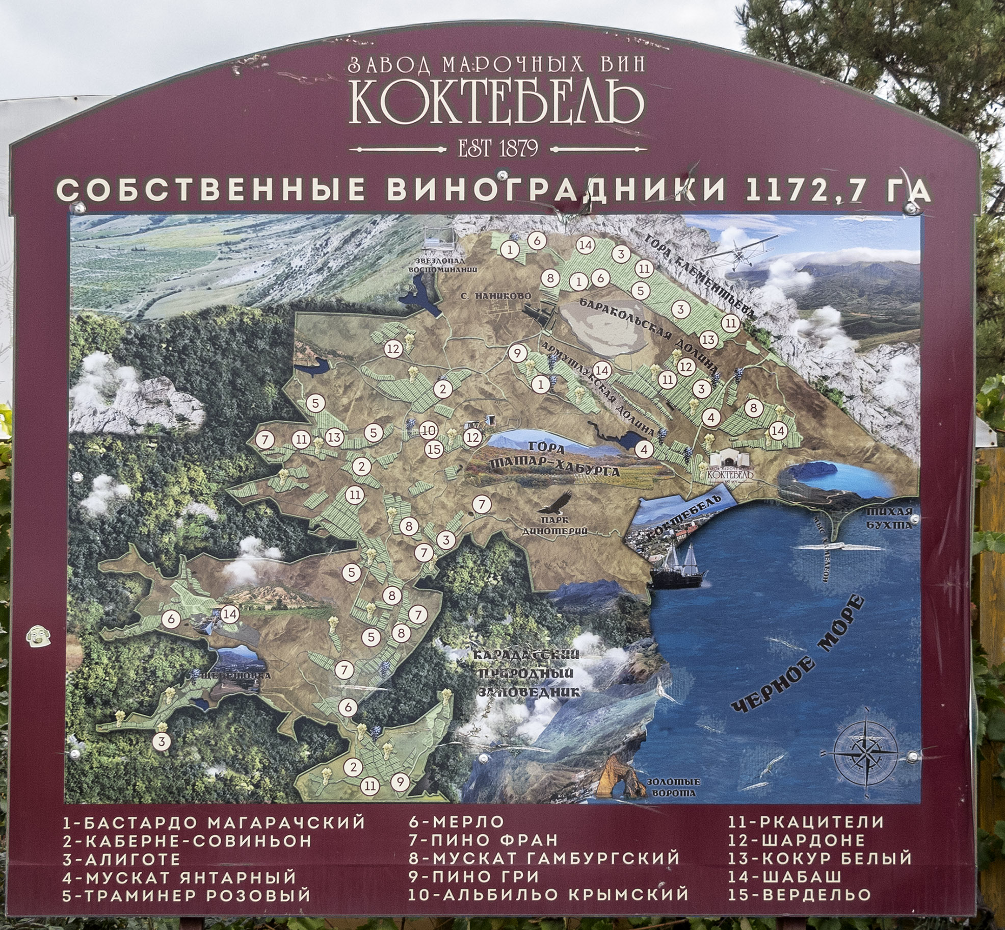 На одиннадцатичасовой экскурсии я был один... Но это не помешало экскурсоводу (молодой девушке, переехавшей в Крым на жительство из Подмосковья) провести экскурсию для меня одного, которая заняла по времени около часа (). Как выяснилось, завод перестал выпускать коньяки, чем и объясняется смена вывески по дороге в Коктебель: раньше была надпись - Страна коньяков, а теперь просто - Страна Коктебель (). В заключение она ознакомила меня ассортиментом вин в магазине, и на этом мы попрощались. После продолжительного изучения этикеток выбор пал на красное вино Гранд Купаж, которое пьёт сам директор завода - по словам экскурсовода.