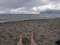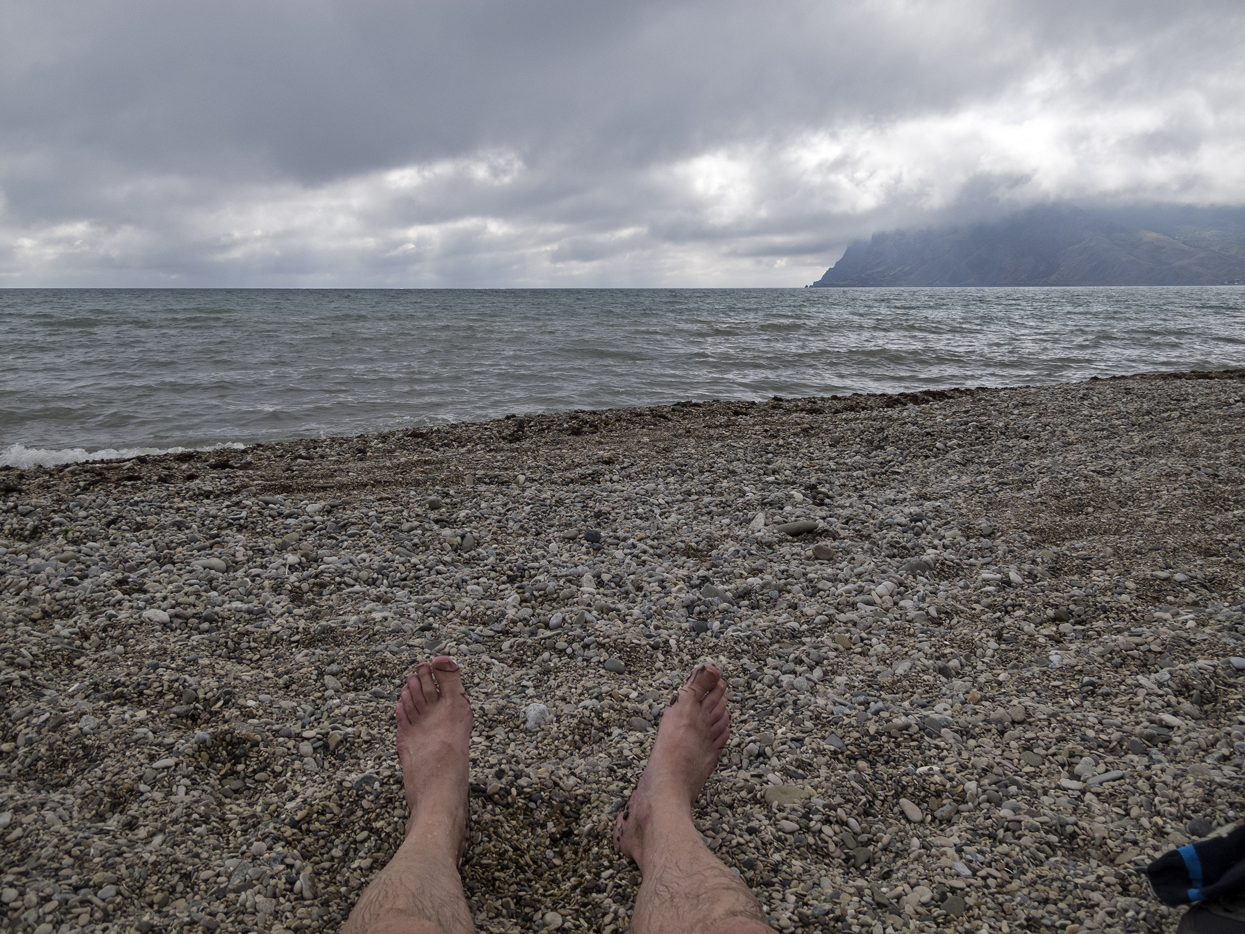 Поскольку погода вроде наладилась, решил пойти искупаться, благо до пляжа - рукой подать. Для этого я заранее надел плавки и взял термометр - для измерения температуры воды. На море был практически штиль, вода чистая, но прохладная: 17°C. Разделся, пару раз окунулся - и на берег (). Посидел полчаса и всё-таки решил подняться на гору Кучук-Енышар - туда, где находится могила Волошина. Хотя я и не являюсь почитателем его таланта.