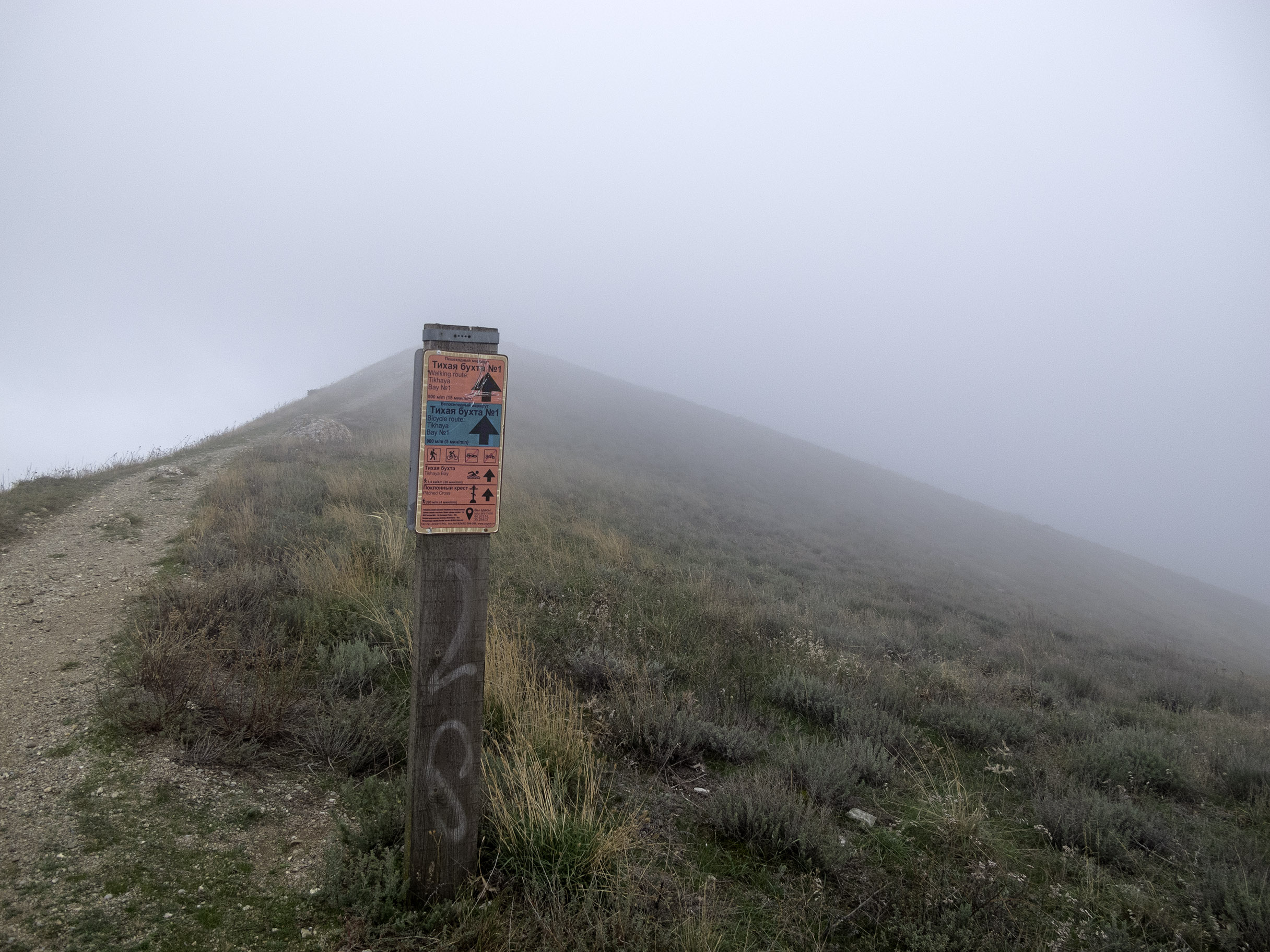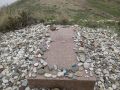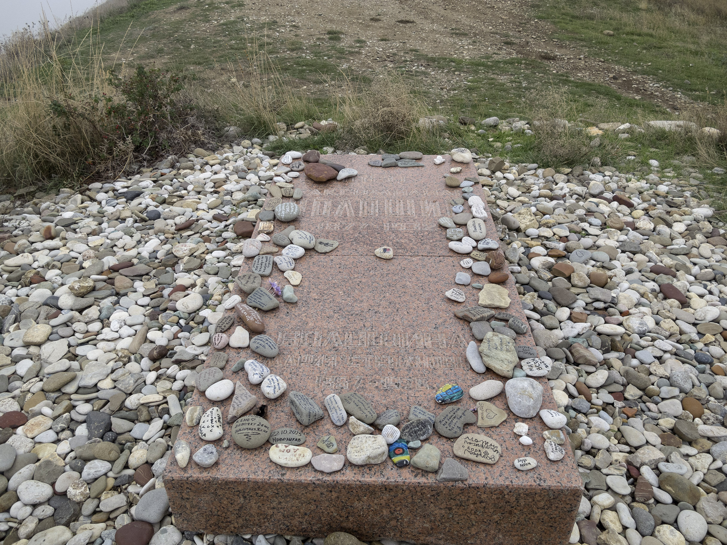 Несмотря на смехотворную высоту горы - 192 метра, подъём был изнуряющим, особенно последние сто метров перед хребтом. По гребню хребта идти было полегче, но с каждой минутой ухудшалась погода: поднялся сильный ветер, который гнал с моря туман и дождь. Было бы обидно из-за этого повернуть назад, и я в сплошной облачности дошёл-таки до могилы (). Чтобы окончательно не отсыреть, сделав несколько кадров (), я поспешил обратно, хотя ноги отказывались двигаться дальше. Разумеется, о посещении Тихой бухты и мыса Хамелеон речи быть не могло - до дома бы дойти...
