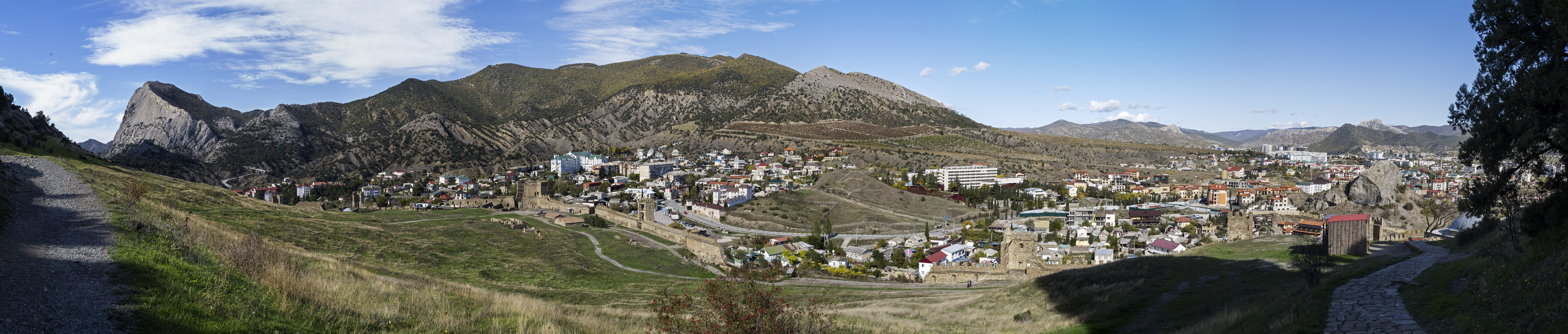 Накануне мне удалось выяснить, что до Судака ходит рейсовый автобус, хотя Яндекс-карты советовали мне доехать до Феодосии, пересесть на автобус до Грушевки, потом - на автобус до Судака... Поэтому утром встал пораньше (), из номера ушёл по-английски, оставив ключи в замке двери, и вышел на автостанцию. Погода была замечательная, и мне не хотелось тратить время на общественный транспорт, когда предлагают услуги такси. Таким образом, миновав Щебетовку и перевал Двугорбый Верблюд, через сорок минут я оказался в центре Судака ().