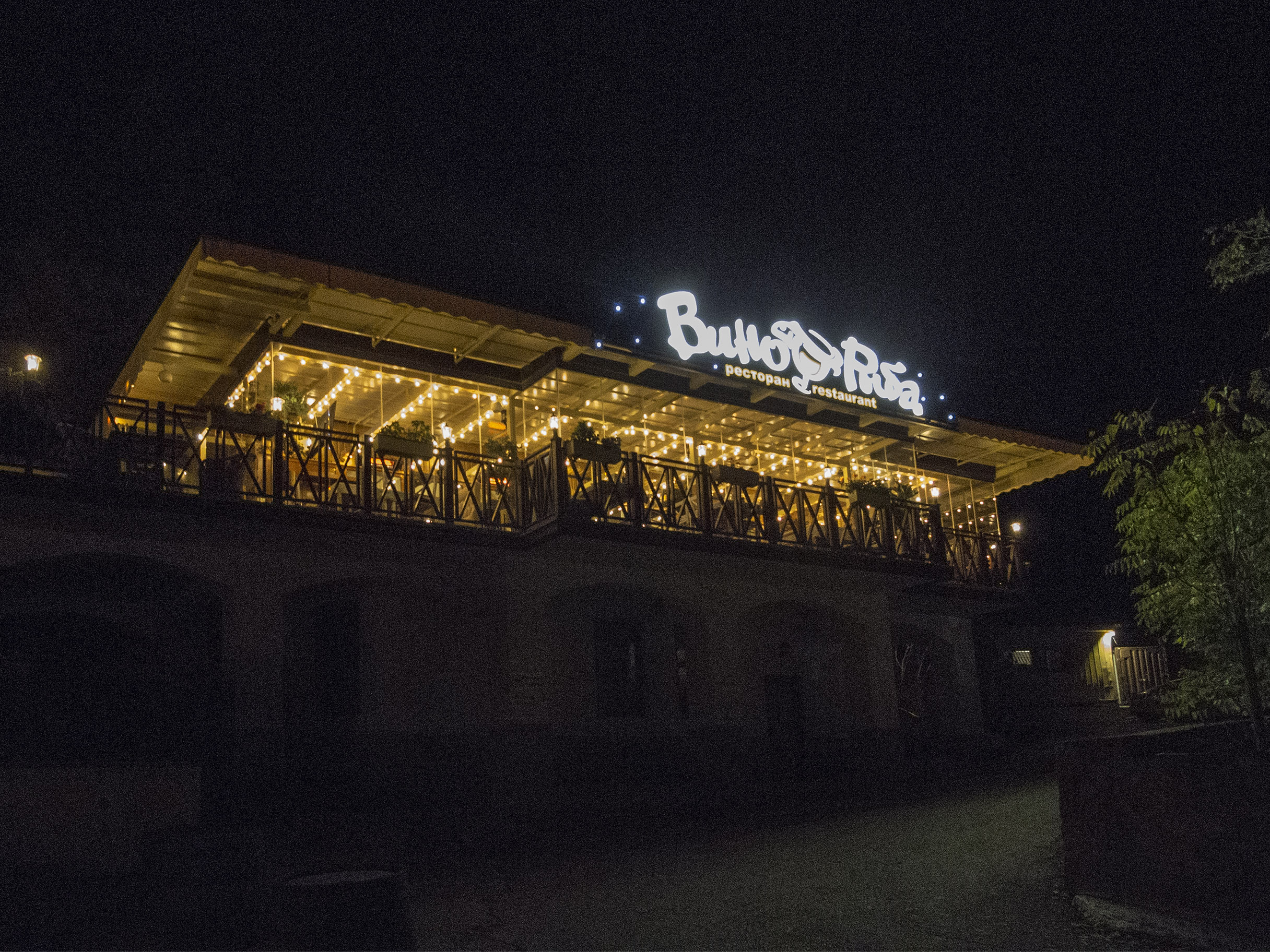 Наступало время ужина, и местом принятия пищи был выбран ресторан «Вино и рыба» - он находился рядом с проходной завода шампанских вин. Расположился на открытой веранде, с которой открывался прекрасный вид на море и гору Сокол (). Меню очень богатое, но я решил подналечь на рыбные блюда: креветки под соусом, жареная барабуля, салат с морепродуктами и, конечно же, вино. Официантка также предложила мне укрыться пледом, так как под вечер стало холодать, но я отказался. Так и просидел почти два часа за столиком, наблюдая, как угасает день.