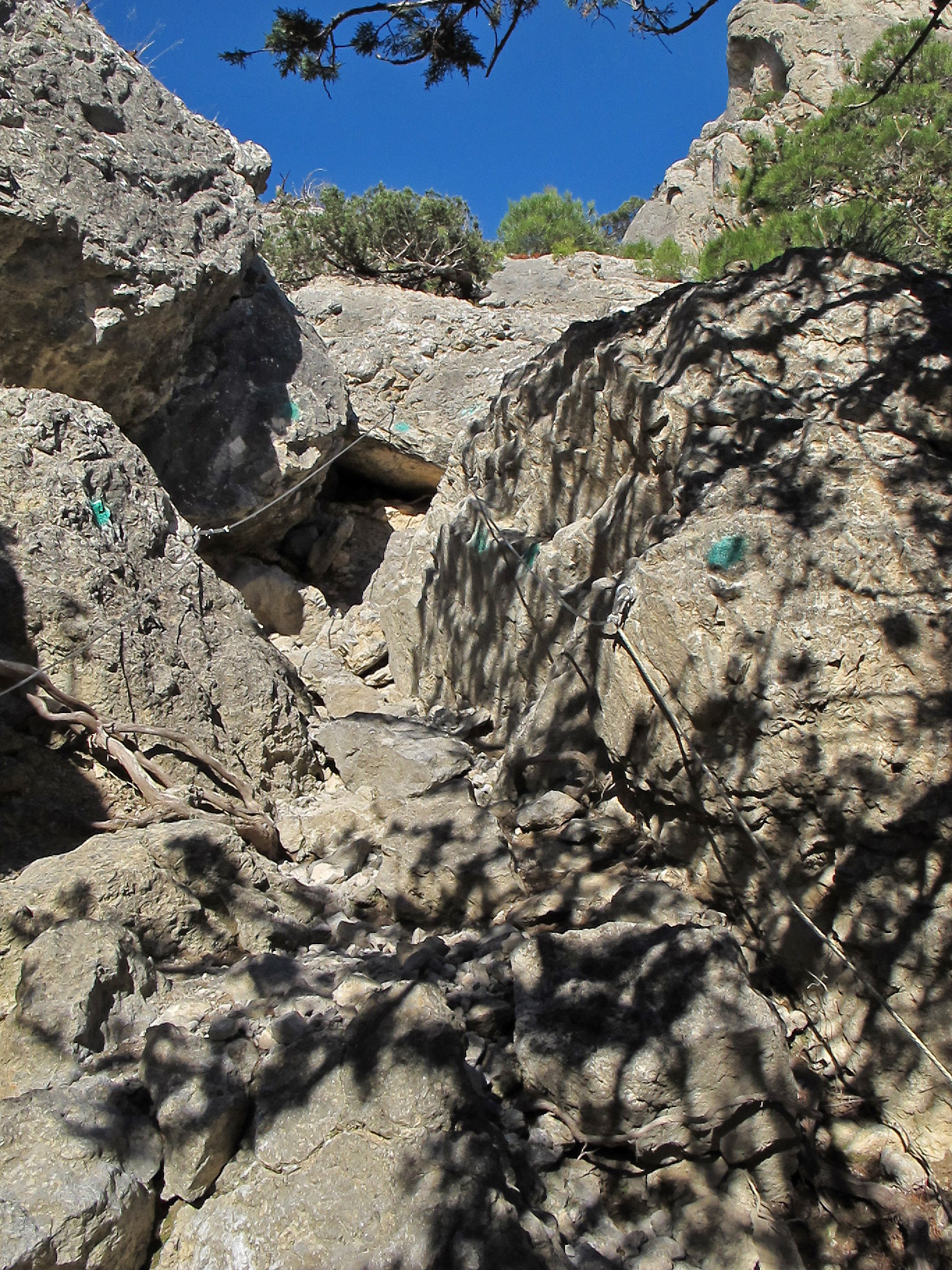 Мне оставалось пройти каких-то пятьсот метров, чтобы достичь поляны в долине рая, но дойдя до начала подъёма, я понял, что задача малоперспективная: впереди был хаос из огромных валунов, по которым надо было карабкаться, держась за стальной трос, натянутый между камней (). Немного подумав, я решил, что не готов к подобному геройству, и пришёл к выводу, что карабкаться здесь с велосипедом не имеет смысла... Если уж и придётся приехать сюда на велосипеде, то более разумный путь - через перевал у горы Сандык-Кая - там, если что, по хребту есть тропинка.