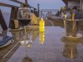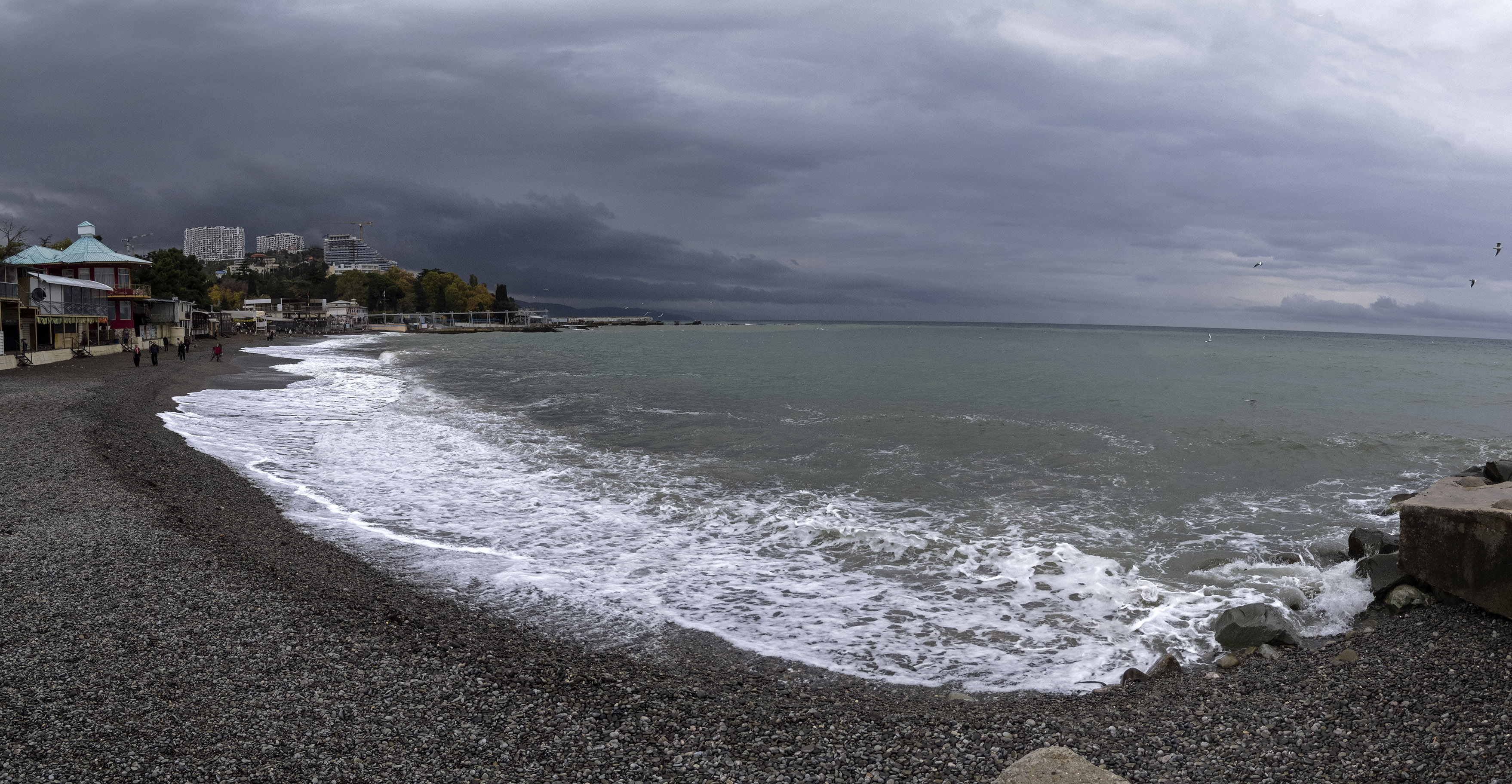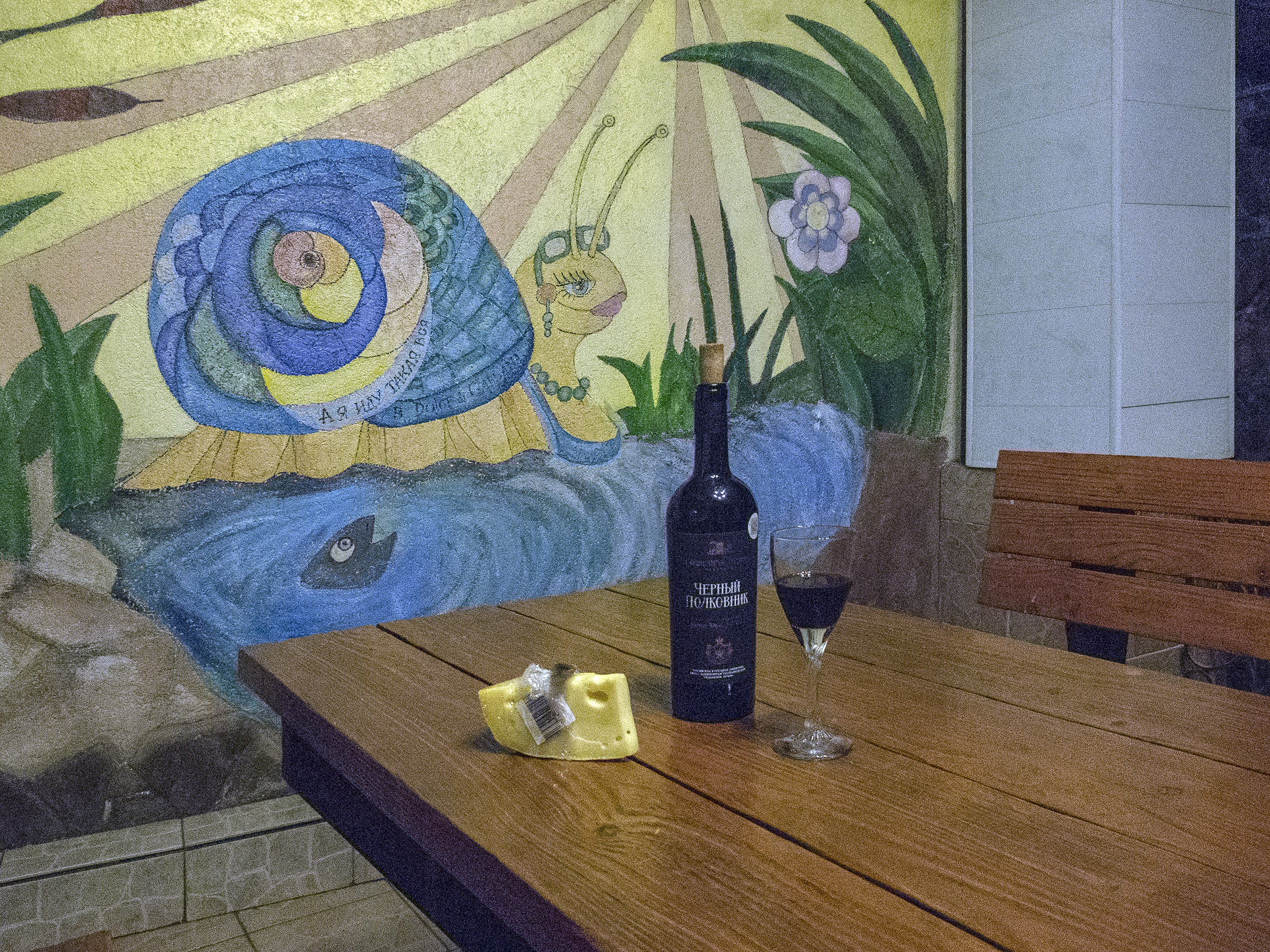 Вернувшись на Партизанскую, дом 3, я надел мембранную куртку и двинулся к набережной, планируя по мере возможности где-то перекусить. Кафе «Подснежник» было закрыто, зато «Барабуля» работала, и я не стал изменять традиции - заказал рыбное меню: ведро жареной рыбы, салат из креветок и пиво. Подкрепившись, вышел на променад. Погода не баловала: на море шторм, на небе - тяжёлые тучи (). Прогулка не задалась, поэтому я вышел к троллейбусному кольцу, узнал, как курсируют троллейбусы и по улице Горького пошёл на базу, зайдя по пути в Винторг. Попробовал разливного вина, не понравилось - купил Чёрного Полковника и Каберне - ну, чтобы два раза не бегать... С таким набором вернулся на квартиру, и коротал вечер вдвоём с полковником ().