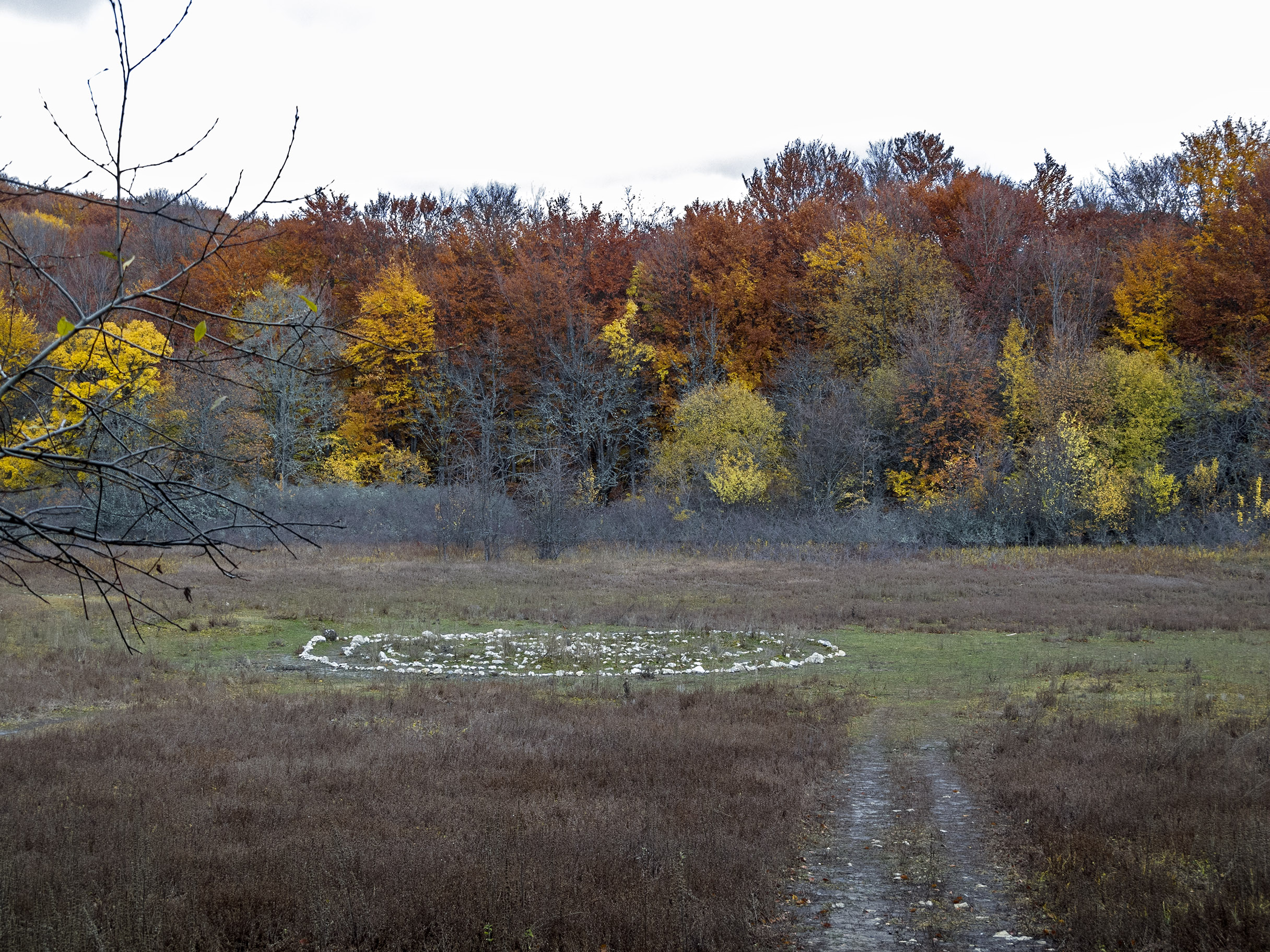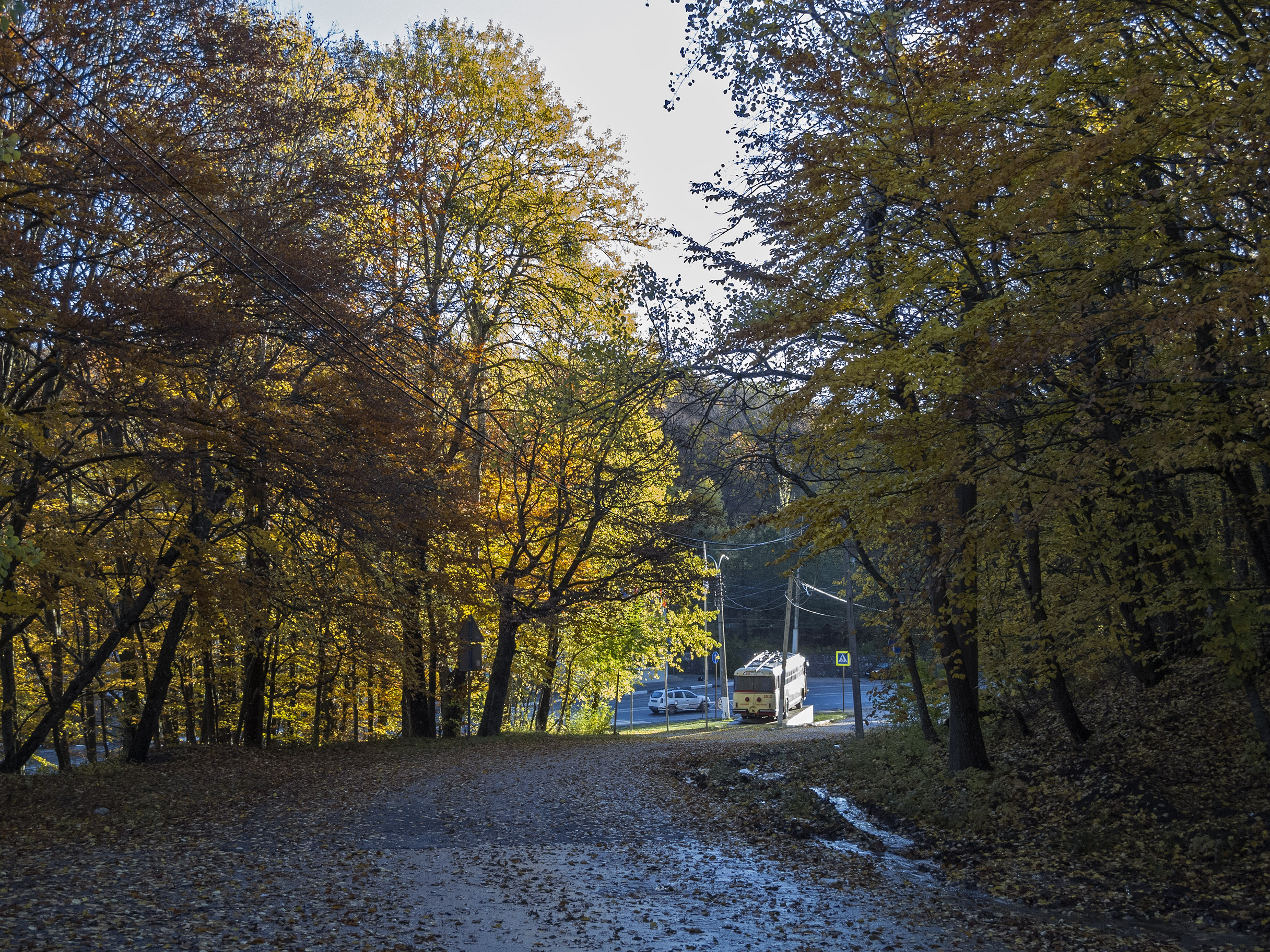 Через полчаса я продолжил движение: мимо рощи секвой () дошёл до места, называемом Кутузовским озером - как всегда, воды там не было (). Зато лес вокруг вовсю играл красками золотой осени. Стали встречаться люди: вначале группа школьников около озера, потом несколько грибников (грибы у них в пакетах были сомнительных сортов, но их было много!), и даже мужиков на внедорожнике. Но дорога здесь была хуже, чем через Буковую: более грязная, с обилием больших глубоких луж и колей. Я шёл уже на автопилоте, стараясь только аккуратнее выбирать место, куда поставить ногу. Таким неспешным шагом я добрёл до метеостанции.