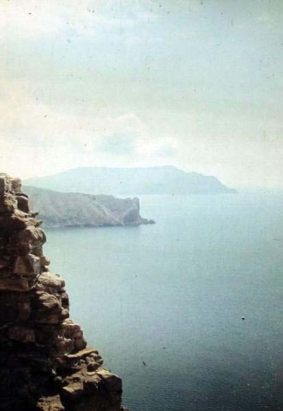 После ночной пьянки я проспал свое дежурство, и нам с Леной наспех пришлось готовить еду, причем примус мы разожгли прямо на балконе гостиницы. Погода наладилась, и прямо с балкона можно было любоваться Судакской крепостью. После завтрака ходили пешком в крепость и вдоволь налазились там. С Девичьей башни (Кыз-Куле) открылся хороший вид на мыс Алчак и гостиницу "Горизонт", где мы ночевали. Выехав в час дня из Судака, мы, миновав Веселое, скатились в поселок Морское, где и заночевали в устье реки Ворон. |