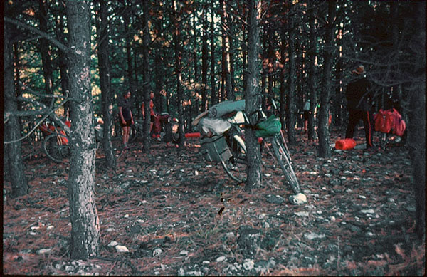 Встали мы в 7 часов, потом искупались в море и позавтракали. В 9.00 тронулись в путь, по пути позвонил родственникам. В этот раз мы не стали ехать по довольно унылому шоссе до Вилино (через которое мы ездили в 1986 и 1989гг.), а в Табачном повернули прямо на Отрадное, сначала был подъём, а потом крутой спуск в долину р. Альмы в Отрадном. Дальше дорога до Бахчисарая нам была хорошо известна. У водопроводного крана, что находился примерно на середине пути остановились в 13.26, помылись и набрали воды (см. фото). Дальше перед Бахчисараем Демидов, Жигалов, Кузнецов и Яковлев поехали в какой-то лес для сбора орехов и ягод, а я остался ждать Рыжикова и Громейко, у которых сломалось много спиц. Во время ожидания я занялся осмотром велосипеда и заменил сломавшуюся спицу на заднем колесе. Потом, когда все собрались, поехали в Бахчисарай, посетили магазины у вокзала, поели шашлык на главной улице и после дворцовой площади повернули в сторону турбазы, что на окраине города в сторону гор. Далее продолжили подъём (см. фото) к Чуфут-Кале и урочищу Бешик-Тау. На развилке Громейко, Демидов и Жигалов сходили на разведку дороги в сторону Баштановки, а после их прихода мы расположились на ночлег в уютном хвойном лесочке, рядом была балка с причудливыми «пальцами» (см. фото). На месте ночлега развели костёр, тут Рыжиков (он должен завтра нас покинуть) после выпитого спиртного по своему обыкновению начал нести свою большевицкую пропаганду. А где-то после 22 часов мы утихомирились и заснули.