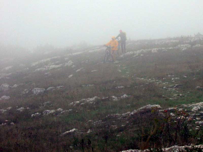 22 сентября: день пятый.Каллистон - метеостанция. 22,8 км.Наутро погода сжалилась над нами и осветила солнышком (). Пока завтракали и собирались, наступило половина одиннадцатого. Решили вернуться на Каллистон и поискать другую дорогу. Пешая разведка в северо-западном направлении, выше скал Шабладын, результата не дала: множество разных тропок, скорее звериных, чем человечьих, и везде круто. Поэтому решили спуститься по грунтовой дороге вниз и по прошлогоднему маршруту (только в обратную сторону) подняться на Малые Ворота. Спустились по крутой дороге на основную "трассу" и поехали по относительно ровной грунтовке, потеряв около 150 метров высоты (). Вскоре мы поравнялись с началом тропы на Малые Ворота. Тут неожиданно Илья, до этого всегда точно соблюдающий маршрут, предложил не поворачивать на узкую тропинку, ведущую к Малым Воротам, а ехать прямо по более накатанной и широкой дороге, в надежде на то, что она нас выведет прямо к Большим Воротам. Я с ним согласился, и как выяснилось позже, зря. Да, дорога была лучше невзрачной тропы, но это поначалу. А потом начался такой торчок, что мне приходилось затаскивать велосипед боком - чтобы удержать его от скатывания вниз (). Потратив полчаса на изнурительный подъём и поднявшись ещё на 170 метров, мы выехали на красивую поляну, где дорога благополучно закончилась (). Вдалеке, прямо перед собой, мы увидели грунтовку, ведущую на Большие Ворота - она поднималась со стороны Приветного - но между ней и нами была жуткая пропасть, пересечь которую с велосипедом было нереально. В довершение ко всему нас облепили мелкие мухи, отгонять которых было бесполезно - они тут же садились вновь () После десятиминутного раздумья решили вернуться на тропу. Макс воспротивился этому решению - он не хотел ещё раз сбрасывать высоту, для того чтобы вновь её набирать. И решил в одиночку лезть через хребет (). Я пытался его отговорить, но Макс был непреклонен. Его поддержал Андрей - он тоже решил вместе с Максом лезть напролом. Посмотрев на их решительные лица, я решил - пусть лезут, и они направились на штурм неприступной, на мой взгляд, стены, а мы вчетвером спустились до развилки и повернули влево, на Малые Ворота. ...Вот во что может вылиться пустяковое на первый взгляд изменение маршрута: мы потеряли час десять по времени, триста метров по высоте, но главное, - мы потеряли двух товарищей, с которыми мы непонятно где и когда встретимся… Перед подъёмом на хребет нам вновь пришлось разгружаться (). К счастью, наверху мух не было, и мы могли отвести пятнадцать минут на перекус. В качестве отдыха я прогулялся по тропе, ведущей к Каллистону: тропа действительно была - там даже маркировка сохранилась (). Сейчас я уже подумал - может, надо было идти по этой тропе, а не спускаться вниз - всего-то полтора километра: можно было за две ходки пройти.… Но что сделано - то сделано. Я-то ещё надеялся, что ребята, уперевшись в скалы, не полезут туда, а вернутся и догонят нас. Но они всё-таки и перелезут, и выйдут на мой маршрут, и пройдут его в точности по навигатору (), (). А мы пошли на Большие Ворота с другой стороны хребта. Дорога тоже не из лёгких, т.к. шла почти всегда на подъём. Перед самими Воротами Илья заметил свежие следы велосипедных покрышек, очень похожие на колёса Макса. Неужели они всё-таки перелезли?! (Как выяснилось позже, при наложении треков моего и М