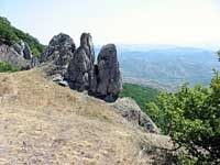 После прохладного и тенистого родника снова пришлось топать вверх и по солнцу. Но теперь оно светило сзади и не было таким злым, да и ветер хорошо обдувал. С этой высоты хорошо обозревались горы Куроча и Лапата, даже видна тропинка между ними (фото 11). Но мне предстояло подняться ещё выше - на гору Емула-Кая, высота которой составляет 1008 метров н.у.м.