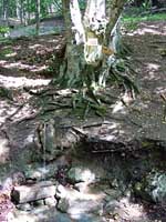 Итак, я пошёл по средней дороге, обозначенной на снимке красной стрелкой. Вначале она круто полезла вверх, причём по солнцепёку, израсходовав остатки воды, затем начался стремительный спуск по земляной сыпухе, такой крутой, что ноги едва держали. Приходилось несколько раз останавливаться, зацепившись за выступающие корни деревьев, чтобы дать напряжённым ногам отдых. 400 метров спуска измотали меня, как 4 км подъёма!