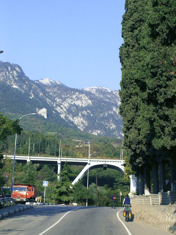 Собравшись около развязки, мы поехали назад, к Алуште, и очень скоро заметили уходящую влево дорогу рядом с автозаправкой. Пересекли трассу и начали медленный подъём по пустынному шоссе. К тому времени солнце уже сияло вовсю, и пришлось снять лишнюю одежду. Вдоль дороги росли яблоки и айва, и мы не пропускали возможность пополнить запас витаминов.