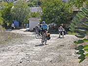 Для начала мы немного посидели в тени большого дерева, росшего у братской могилы. Часть людей начала подъём, другая часть наслаждалась поеданием дыни (фото 18). Наконец все тронулись в путь, и, как в прошлый раз, первые несколько десятков метров давались тяжело из-за крутизны и солнцепёка. Но потом дорога начала выполаживаться, и многие участки можно было въезжать. Я иногда умышленно шёл пешком: во-первых, не хотелось насиловать велосипед - он и так уже скрипел от старости, во-вторых, когда идёшь пешком, больше видишь вокруг, так как не надо постоянно смотреть под колесо, и, наконец, это разгрузка мышц.