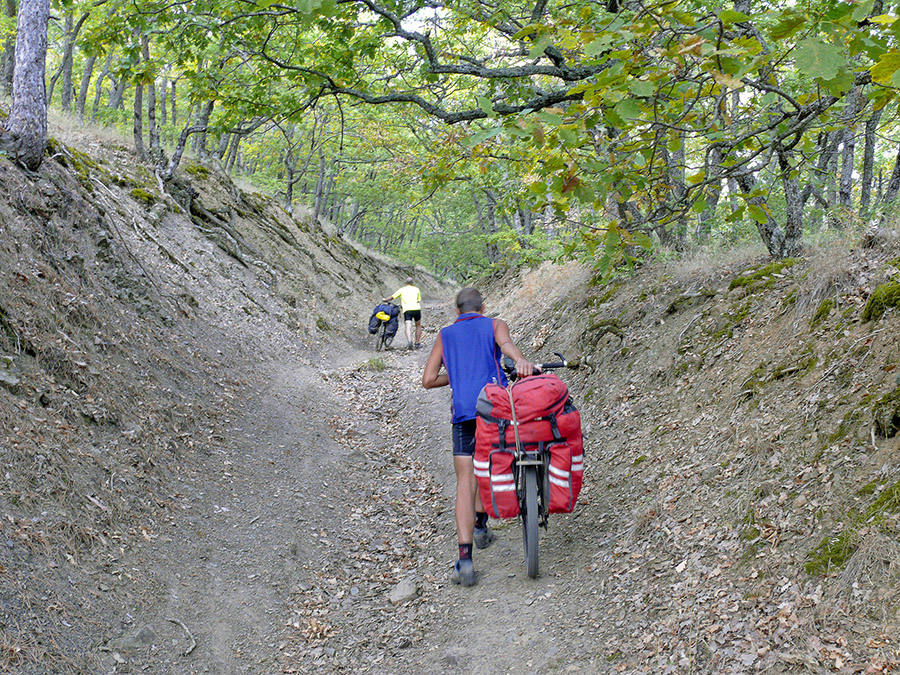 Здесь, у горы Сераус, нас ждал подъём, о котором я даже не догадывался. Нет, конечно, было понятно, что здесь будет подъём, но по сложности он превзошёл даже подъём на Чатыр-Даг. Мало того, что крутизна его была велика, да ещё кругом из земли торчали камни, коряги и валуны (фото 65). Поразмыслив, объединились в пары (благо, нас было чётное число) и стали заталкивать велосипеды наверх: сначала один рулит, другой толкает, потом наоборот. Таким образом, используя челночный способ, затолкали велосипеды до более пологой дороги, которая соединилась с дорогой от Горного озера. Здесь уже можно было ехать, и, дождавшись, пока все поднимутся, - поехали.
