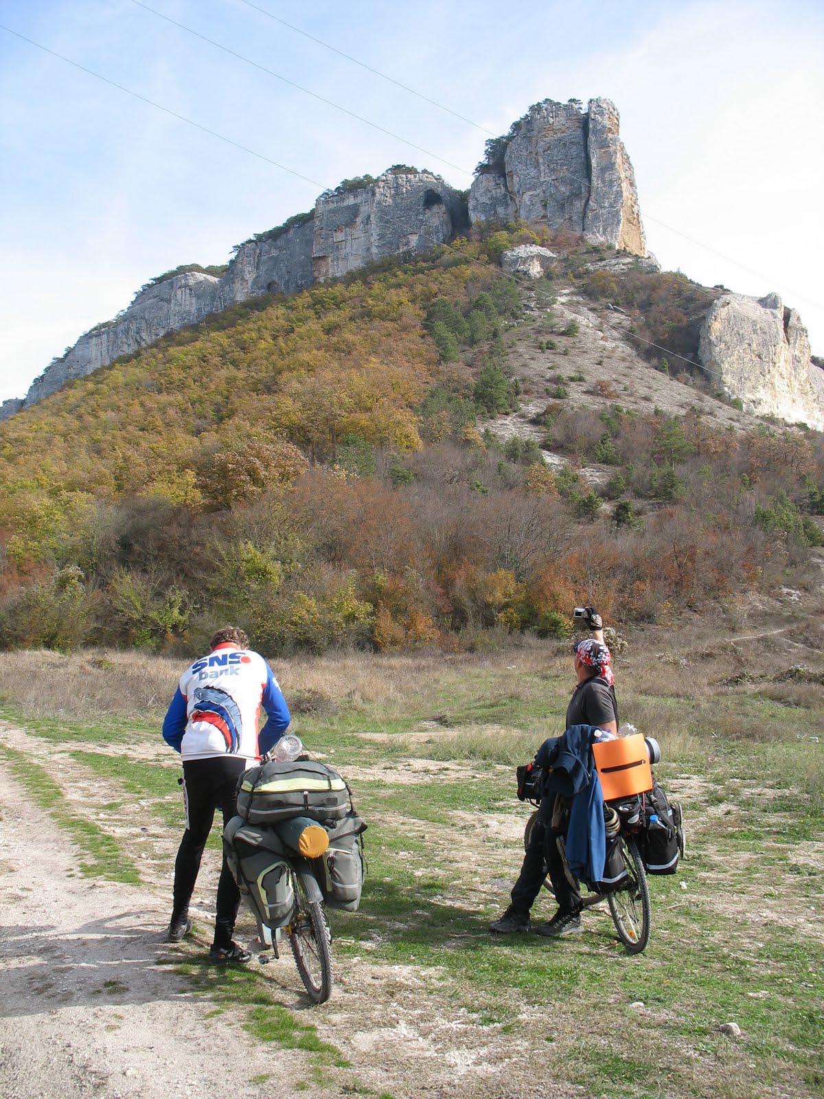 Ночью было холодно, но мы его особо не заметили, т. к. спали в каменном помещении. На этот день нам нужно было посетить Эски-Кермен, далее подняться по Змеиной балке и спуститься по балке Алимовой и доехать до Шелковичного или Финароса. В Залесном зашли в местный магазин (см. фото), потом по грунтовке начали подъём на Эски-Кермен. Пещерный город нас поразил (см. фото), но и тут мы увидели следы нынешней цивилизации, выражающиеся во всяких увеселительно - развлекательных точках и шашлычных (см. фото). Далее по грунтовке (см. фото) поехали на Красный Мак и потом по шоссе на Танковое. В Танковом купили продуктов и потом встретили ехавших налегке велотуристов из подмосковного Королёва, обосновавшихся в Бахчисарае. После этого, проехав ещё 2км, перед нами предстал вход (см. фото) в Змеиную балку (см. фото). Вход в балку был перекопан, но мы без особого труда перенесли свои велосипеды и продолжили движение. Дорога по Змеиной балке шла на подъём, но проехать можно было почти везде. Достигнув верховья балки, мы увидели великолепную скалу. Это гора Курбан-Кая (см. фото) или по-простому Кубышка. Далее до балки, называемой «Кислой» ехали по всхолменному плато, временами фотографируя прекрасные виды окрестностей (см. фото). Переправившись через Кислую балку, мы подъехали к турстоянке «Алимова балка» (см. фото) рядом с родником Качнедже. Далее начался спуск в низовья балки, тут мы осторожно перетаскивали велосипеды через камни (см. фото), помогая друг другу. Наконец, крутой участок кончился, и мы поехали по покрытой листьями тропинке и выехали в долину Качи напротив пещерного города Качи-Кальон (см. фото). Далее до моста через реку ехали по мокрой дороге, а кое-где даже был лёд. На этом участке я «приложился» велорюкзаком к дорожному покрытию. Переехав Качу, далее до Верхоречья ехали по шоссе. В Верхоречье зашли в магазин, я купил хлеба. Следующий магазин должен быть только в Изобильном. После этого решили сделать ночёвку на стоянке Финарос и поехали туда, свернув с шоссе на грунтовку. Некоторые участки дороги были настолько грязные после дождей, что к колёсам прилипло так много глины, что ехать было просто невозможно. К устью Финароса подъехали уже во время наступления сумерек, доехали до турстоянки, и при свете фонарей стали располагаться на ночлег. А рядом с нами встала группа туристов - пешеходников из Харьковского Авиационного института. Мы поужинали с принятием вина, а харьковчане разожгли хороший костёр, тоже поели и начали петь под гитару. Нам понравилось их пение, и мы решили присоединиться к их трапезе, предложив имевшуюся у Ромы Третьякова бутылку коньяка. Харьковчане согласились, и мы очень хорошо посидели с ними у костра (см. фото) под коньячок и пение старых русских и советских песен. А на следующий день в России праздник — День Народного Единства. Получается, что это народное единство было здесь в Крыму на Финаросе (см. фото). Только после 23.30 мы пошли спать.