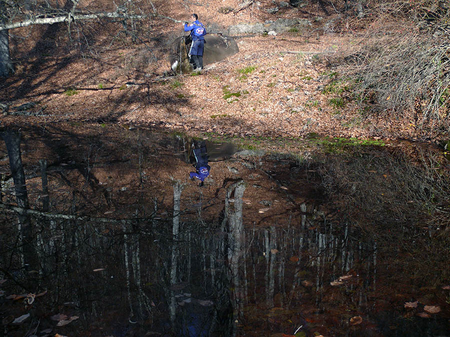 Ночь была на удивление тёплой для ночёвки в ноябре на высоте 1400м. Но, тем не менее тенты палаток пришлось сушить до 9.30. Как раз мы за световое время и собрались ехать дальше. По плану мы в этот день должны были спуститься через Диплу и Ай-Йори в Изобильное, а оттуда подняться на Чатырдаг и заночевать на Ониксе. Но в таком случае нам надо было в сумерках преодолевать Чатырдаг и ночью спускаться по крутому спуску к Ониксу. Тогда было решено на Чатырдаг не ехать, а от Изобильного ехать на Лучистое через Лаванду. Выехав с места ночлега, мы очень быстро доехали до развилки на Ламбат-Богаз и повернули налево, к Дипле. После проезда ещё какого-то небольшого расстояния более-менее нормальная дорога кончилась, и начался спуск через камни. На границе яйлы и леса спуск (см. фото) был особенно крут, здесь пришлось помогать друг другу при переноске велосипедов. У Диплы остановились (см. фото) и немного отдохнули. Далее пошёл спуск через лесоповал. А ведь мы в прошлом году хотели здесь подниматься вверх, хорошо, что пошли через Ламбат-Богаз. Нам навстречу поднимались туристы-пешеходники. У родника мы остановились, набрали воды (см. фото). Тут я обнаружил, что у меня пропала ветровка. Наверное, я её где-то потерял при спуске. А Рома Кузнецов около источника (см. фото) наступил ногой на листья, и его нога провалилась до колена. В этот день самочувствие у меня было неважное, я иногда терял ориентацию. Уже ближе к дороге, по которой мы шли в прошлом году, у меня после Орлиного начал стабильно приниматься Би-Лайн, я позвонил домой. Выехав на дорогу прошлогоднего похода, мы очень быстро спустились к источнику Ай-Йори и там набрали ещё воды. После этого поехали дальше и с хорошей поляны сняли отличный вид на Чатырдаг (см. фото). Дальнейший спуск к Изобильному происходил через балки, в одном месте мы даже чуть не попали в охотничью засаду. Уже перед самым шоссе переходили реку (см. фото), при переноске у меня оступилась нога, в результате чего немного промокли ботинок и низ велорюкзака. Проехав километра два по шоссе, мы короткой дорогой поднялись в центр Изобильного к магазину, где купили продукты. Потом встретили велотуристов из Казани и вместе покатили к трассе, потом наши пути разошлись. Далее был нудный пятикилометровый подъём по трассе до поворота на Лучистое. После поворота дорога пошла веселее: то спуск, то подъём, и где-то часов в семь вечера мы остановились в Лучистом у магазина, где купили продукты. Далее пошли искать место ночлега, в магазине нам предложили адрес, но там нам не открыли даже калитку. Потом один татарин предложил нам устроиться на территории конного клуба «Аллюр», и мы поехали туда. Доехав до очередной развилки, Рома Третьяков пошёл осуществлять рекогносцировку предполагаемого места ночлега, а мы остались его ждать. Здесь мы увидели внизу ночную Алушту (см. фото), сияющую огнями. Потом Рома пришёл с хорошей вестью, и мы пошли (ехать было очень круто) дальше, дошли до клуба и разместились за весьма умеренную плату в четырёхместном номере с душем, потом сняли вещи с велосипедов, велосипеды связали, а потом поужинали в местной столовой с принятием вина. После ужина пришли в номер, потом помылись-побрились и где-то после 22.00 заснули.