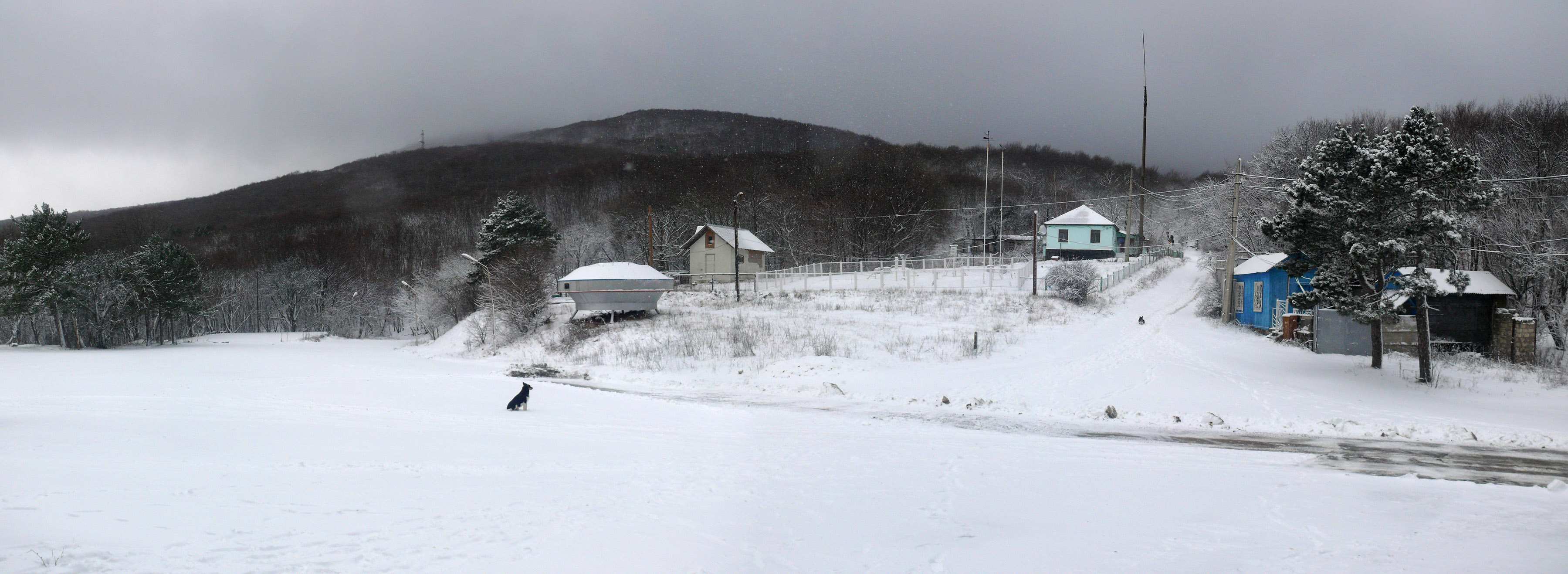 Вот и ЛЭП, которую я пересекал два дня назад, около Перевального (фото 24). Ещё одна группа проследовала в сторону хребта - выходной день, люди тянутся в горы… Миновал Школьную Поляну - наверное, летом здесь хорошо: вокруг лес, а на поляне столики, скамейки (фото 25). Появились следы от квадроцикла. Вскоре дорога выскочила на перекресток маршрута "Ангарский - Тисовое ущелье", и я зашагал вправо. Около 12 часов дня появилась метеостанция (фото 26), до шоссе оставалось рукой подать. В надежде чем-нибудь перекусить я направился к посту ДАИ, но там, кроме торговли мёдом и орехами, ничего съедобного не было. Лишь у одного дядьки был чай и кофе - я попросил чая на травах с мёдом, а также кусок хлеба. Одной порции чая было недостаточно, и я попросил ещё стаканчик.