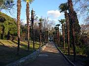 На такси я не поехал (100 грн!), сел на автобус, который шёл по нижней дороге, с таким расчетом, чтобы попутно посетить парк Воронцовского дворца. В автобусе, конечно, не так комфортно (почти всю дорогу пришлось стоять), зато дешево - 8 грн. Через 50 минут я уже вошел на территорию парка, посетил до боли знакомый туалет и пошел по аллеям, фотографируя направо и налево (фото 32 - 41). Погода стояла просто замечательная: яркое солнце, голубое небо, белые горы и зеленые лужайки парка. Вдоволь налазившись по многочисленным дорожкам, я вышел через главный вход и пошёл в центр города (фото 42). Здесь я снова ощутил всю тяжесть рюкзака: пока поднялся до площади Ленина, весь взмок.