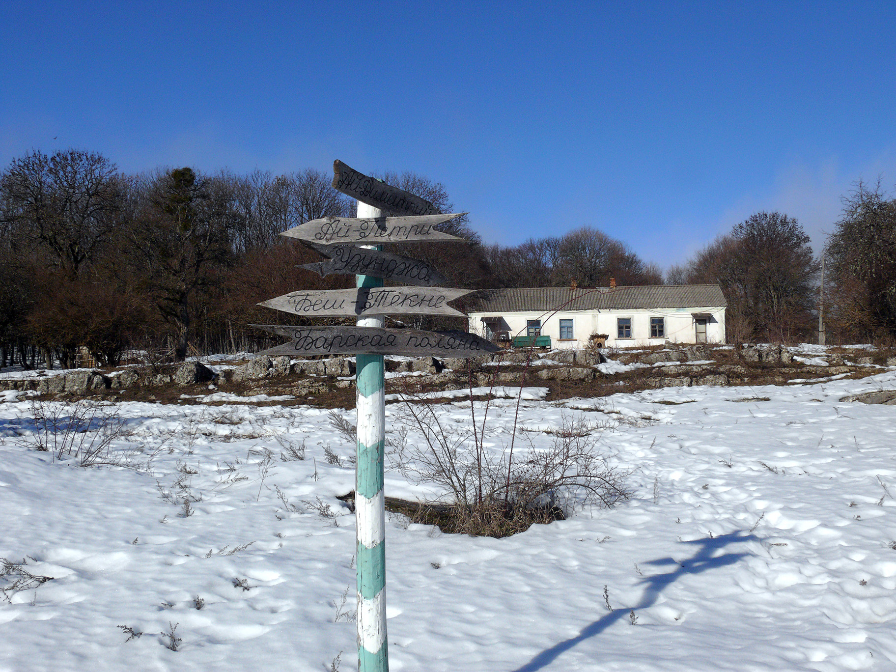 Вот мы дошли до Малого Бабулгана (фото 95). Здесь дороги разветвляются: основная и единственно накатанная дорога шла на Чайник; также должны быть дороги на Беш-Текне и Ай-Димитрий, но под снегом они не читались. Мы немного постояли здесь, на солнышке, погрелись, отдохнули, и снова тронулись в путь. До Чайного Домика оставалось около километра.