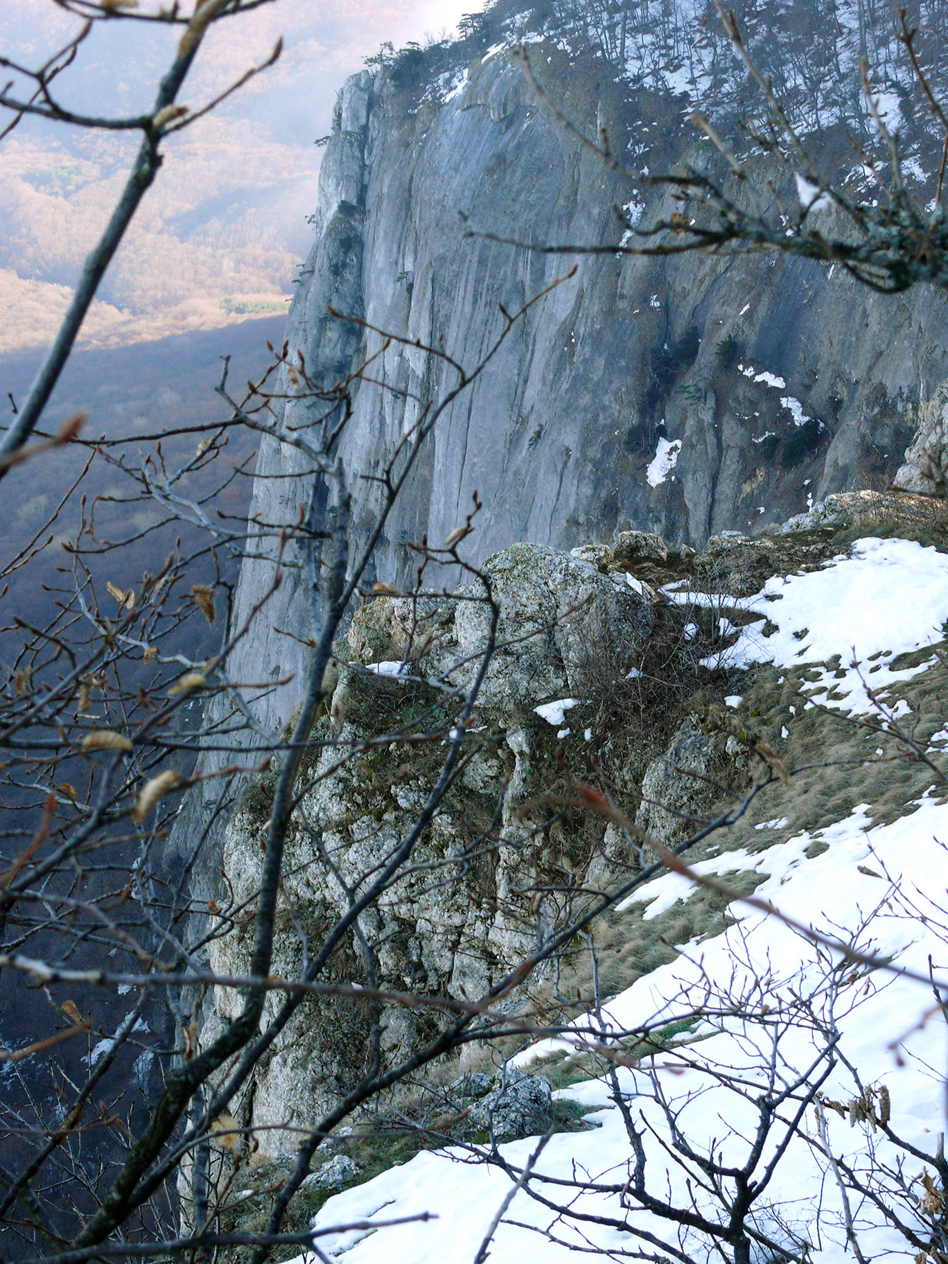 Поскольку времени до захода солнца было ещё предостаточно, я подумал, что неплохо бы разведать короткий путь от Барской (фото 119) к Каменному повороту. На одной из карт я видел слабо выраженную дорогу: нужно было удостовериться, есть ли она и насколько проходима. Поэтому я взял навигатор и фотоаппарат и пошёл на разведку этого пути. Он начинался как раз у того дуба с табличкой - в ту сторону даже вела колея, но она скоро кончилась, и мне пришлось идти по треку, который был нарисован очень приблизительно. Поначалу я немного заплутал при обходе скального участка и вышел на большую поляну с глубоким и рыхлым снегом и исхоженную кабанами. По GPS понял, что иду не туда, развернулся и начал искать обход скальника. Вскоре даже попалась чуть заметная тропка, периодически скрывающаяся то в снегу, то в листве. Похоже, что тропа вела как раз на западные обрывы, но идти по ней было непросто - кругом торчали камни, дорогу преграждали каменные ступени (фото 120) - навернуться с рюкзаком было проще простого. Даже налегке в отдельных местах перелезать через валуны было сложно. Возможно, где-то ещё была тропа лучше этой, только под снегом найти таковую было делом нереальным.