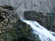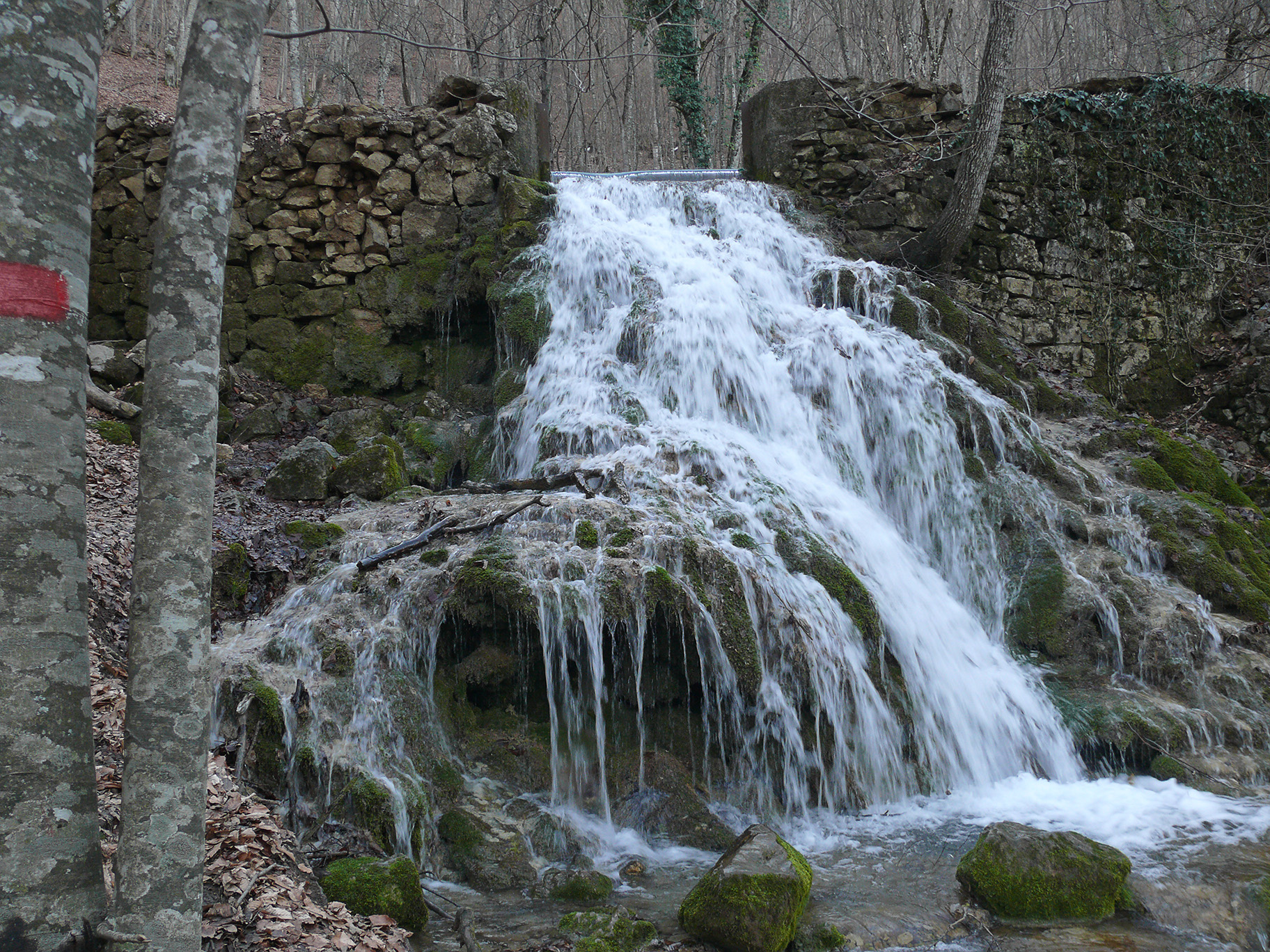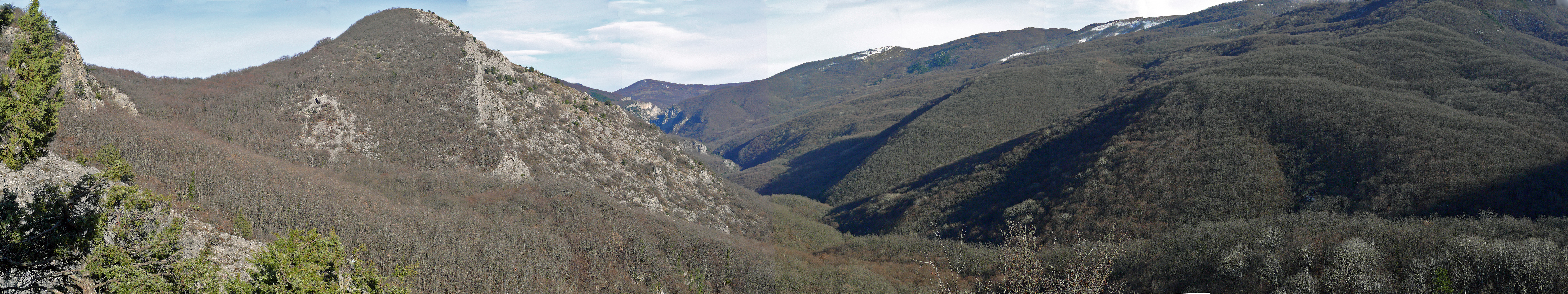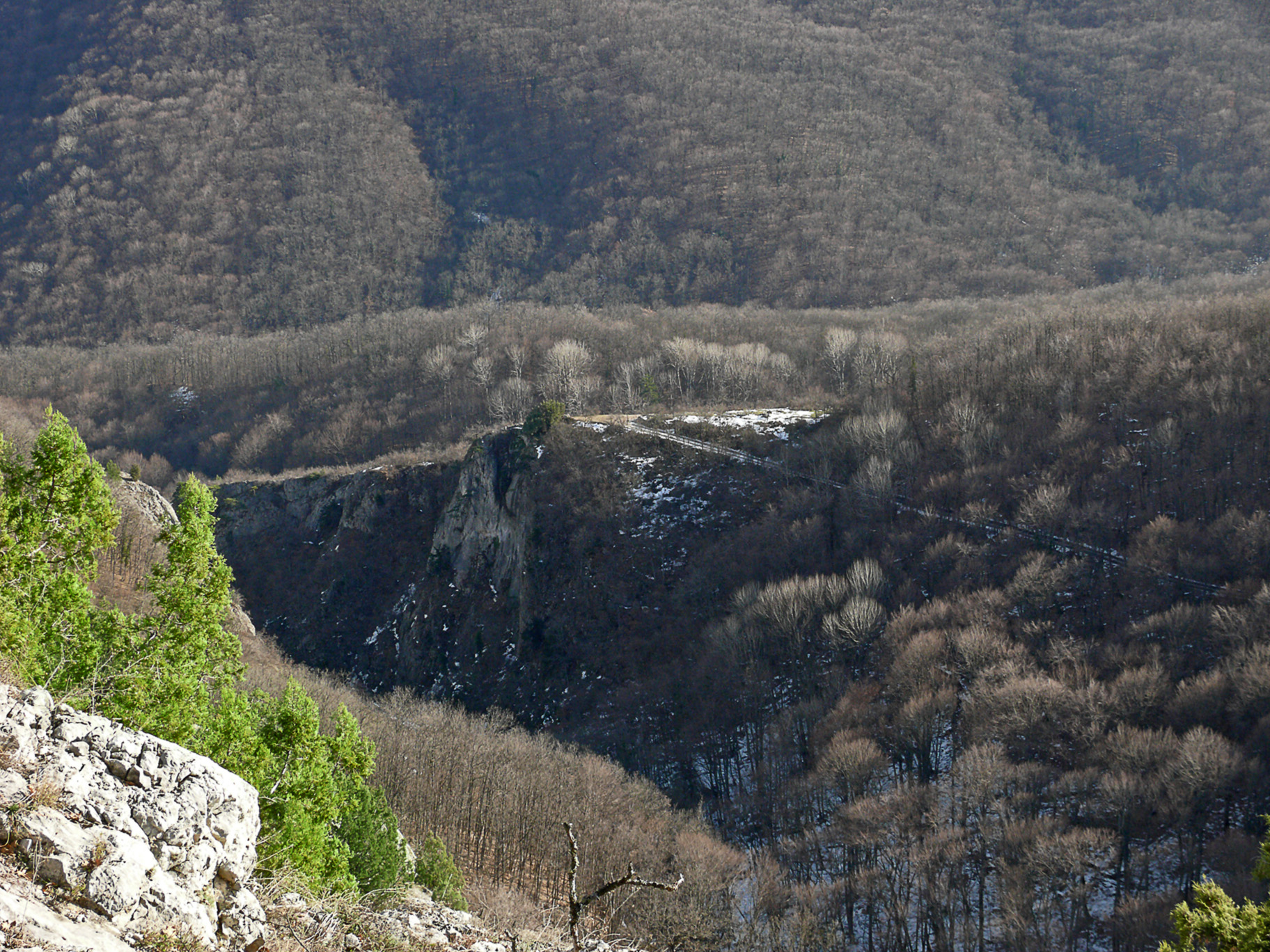 Как ни хорошо было сидеть и греться на солнышке, пришлось идти в тень. Льда пока не было, но стало заметно сырее. А когда мы ещё раз круто повернули, но теперь налево, вот тут и начался ещё один неприятный участок, где со льдом, где с лужами и грязью. Приходилось всё время лавировать между лужами и балансировать на скользком льду. Так продолжалось до самого Каменного поворота. На самом повороте ещё светило солнце, и, пользуясь возможностью, мы начали фотографировать всё и вся (фото 138). Вид здесь был немного похуже, чем от можжевельника, но зато в интересном ракурсе предстала скала Сююрю-Кая (фото 139). Также отсюда было видно начало каньона (фото 140). Наверное, летом здесь должно быть особенно красиво, а пока только чёрные голые стволы леса, покрывающего склоны гор. Где-то внизу, совсем недалеко, шумела вода, только разглядеть ничего не удавалось. По всей видимости, это шумела река Сары-Узень, низвергающаяся с Юсуповской плотины.