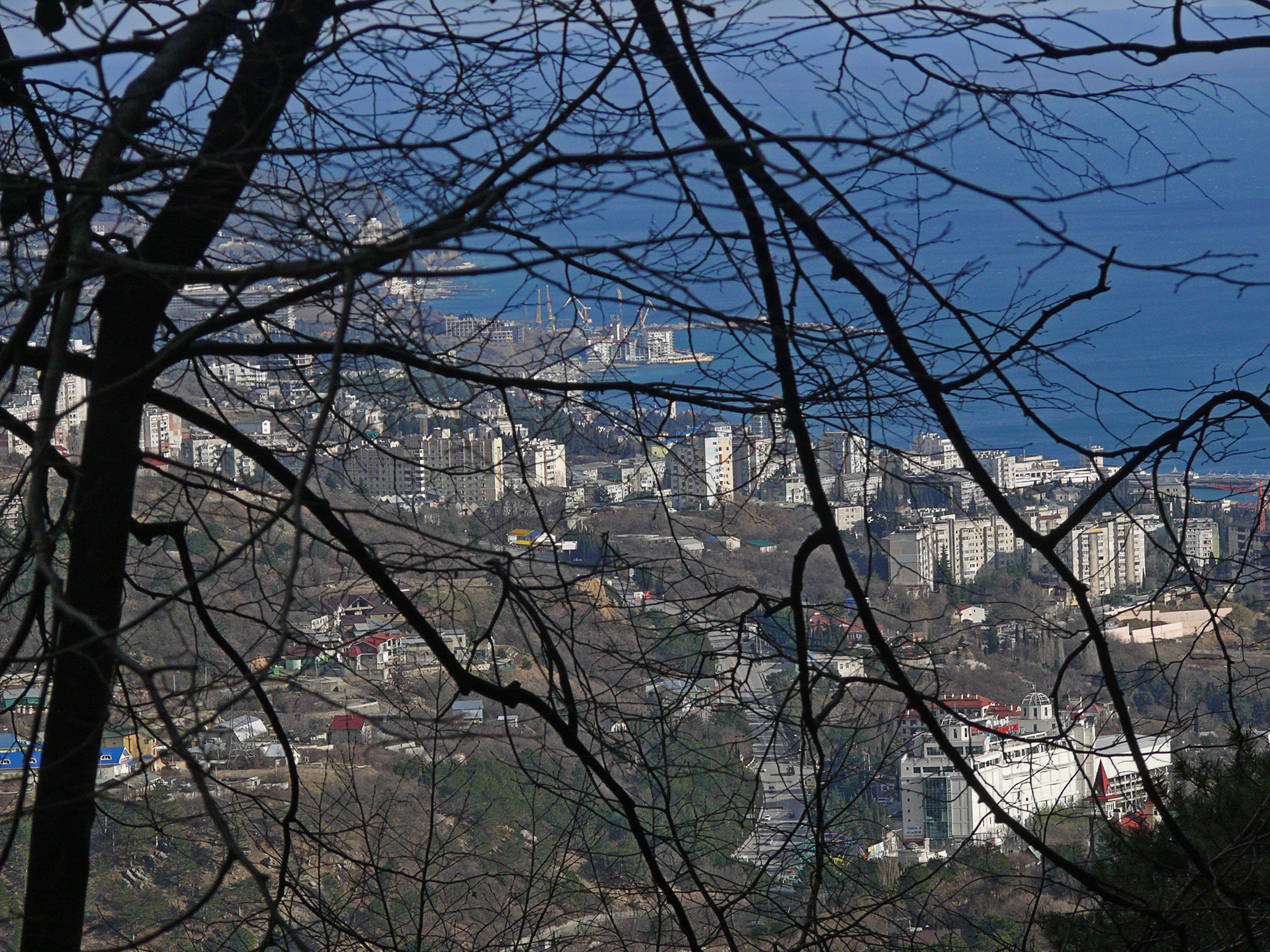 По дороге выяснилось, что наш водитель плохо знает южный берег Крыма. Пришлось включать GPS, чтобы заранее предупредить его, где надо сворачивать. Тут меня одолело любопытство - в каком состоянии сейчас находится водопад Учан-Су. Я попросил водилу остановиться - он был не против. Здесь, как ни странно, денег тоже никто не просил. Водопад был достаточно мощным (фото 191), но подойти к парапету всё-таки дал. С площадки перед водопадом даже была видна Ялта, обычно не просматриваемая в тёплое время года из-за листвы (фото 192).