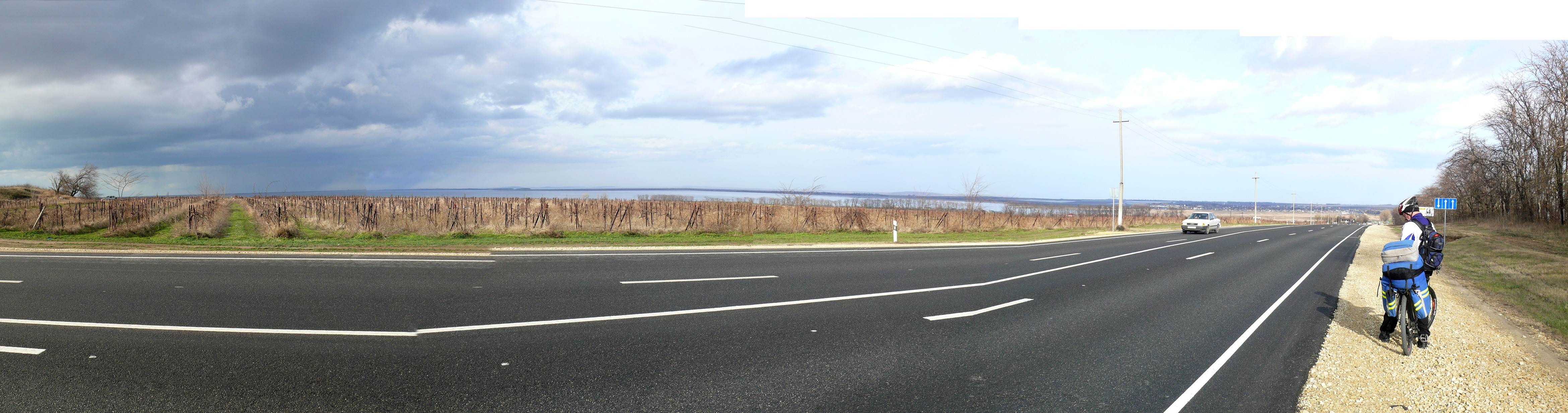 Оставшаяся часть дороги порадовала нас появившемся солнышком и отсутствием осадков (фото 6 - 8). Ехать стало веселее, хотя усталость уже чувствовалась - средняя скорость упала до 10-12 км/ч. В город мы не въезжали, а объехали по восточному краю и выехали на Ростовскую трассу. В станице Голубицкая нашли винный магазин, где купили несколько сортов коньяка производства Фанагорийского завода, а также несколько бутылок воды для ночевки. Теперь нам оставалось проехать станицу и спуститься к морю. Так как я в этих местах был впервые, стоянки выбирал с помощью сервиса “просмотр улиц” на Гугл-картах. Там я высмотрел неплохое местечко перед пересыпью, отделяющей Азовское море от лимана. С юга пляж был прикрыт высоким и крутым склоном, по которому проходила дорога, и имелся автомобильный съезд.