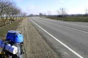 Как только мы вылезли по крутому съезду на шоссе (фото 12), я понял, что сегодняшний день будет непростой. Только до порта Кавказ было около 50-ти километров, и 40 из них нам предстояло ехать против ветра! Поначалу вроде бы нормально ехалось, да и погода была вполне сносная, но первая половина пути постепенно отнимала силы. До станицы Фонталовская шел медленный, но постоянный подъём, вдоль дороги - ни деревца, ни кустика - всё продувалось напором западного ветра, в результате чего скорость была черепашьей, и приходилось часто останавливаться на отдых.
