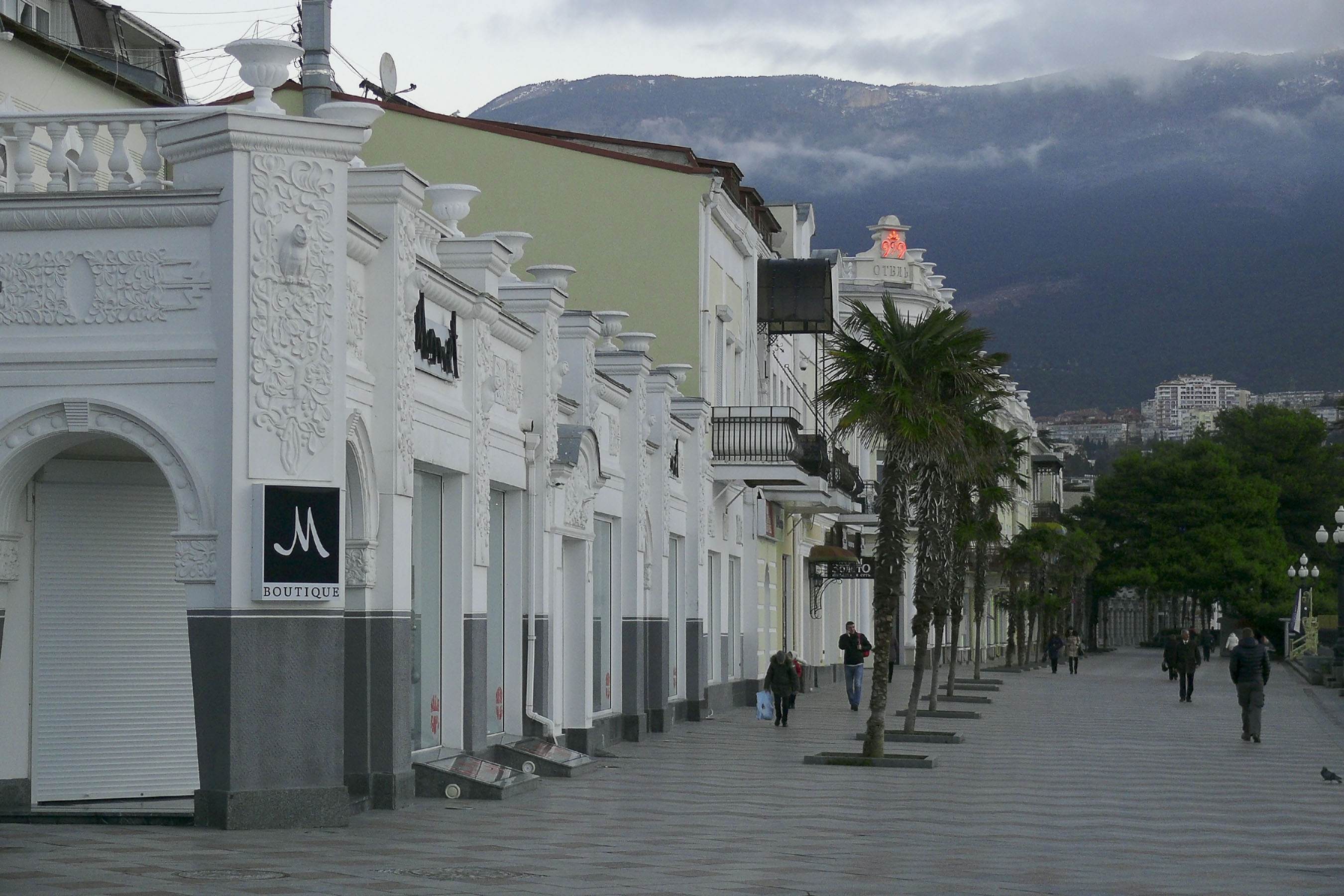 Спокойная прогулка без рюкзаков и велосипедов позволила мне поглазеть по сторонам и вдоволь пофотографировать (фото 106 - 108). Так, незаметно я дошёл до конца набережной, на площадь перед памятником Ленину (фото 109). Там мне повстречалась женщина, которая показалась местной жительницей, и по-видимому, никуда не спешила. Я расспросил её насчёт сбербанка. Оказалось, что филиалы в Ялте ещё не открылись, но деньги можно было снять в банкомате Русского банка, который находился поблизости. Но время было раннее - ни один банк ещё не работал, поэтому я решил отложить это дело до дневного времени, и пошёл в обратном направлении (фото 110 -112).