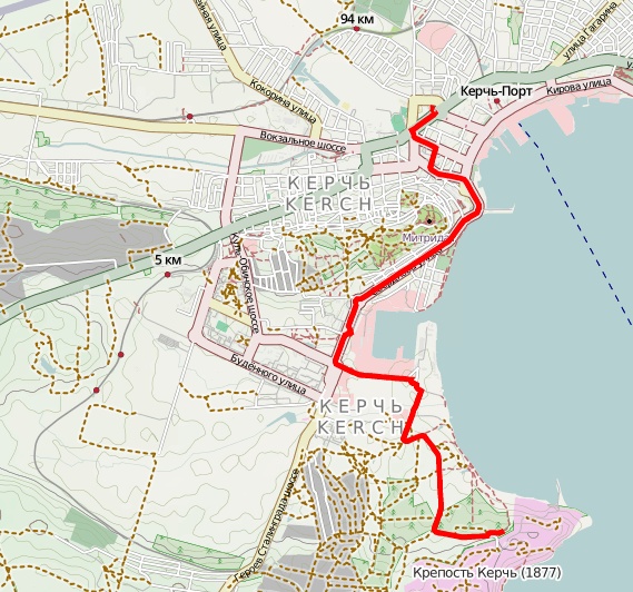 Итак, мы удалились от стройки и постепенно приближались к крепости Керчь. Место для ночлега я присмотрел ещё дома - это был небольшой лесок рядом с крепостью, прямо у берега Керченского пролива. Теперь требовалось найти более-менее ровное место, чтобы установить палатки. Мы шли по грунтовке и посвечивали в стороны фонариками - нигде не было площадок, везде кусты и непроходимые дебри. Но вот слева обнаружилась дорожка - мы свернули на неё: через несколько метров она закончилась какими-то непролазными кустами, зато была относительно ровной, хотя и узковатой. Решили, за неимением лучшего, вставать здесь - и так уже было около двух часов ночи... Поставили палатки в длину, друг за другом, после чего стали готовиться ко сну. И, поскольку пол-ночи мы не спали, то решили назавтра (точнее, на сегодняшнее утро) не торопиться с подъёмом - как выспимся, так и встанем.