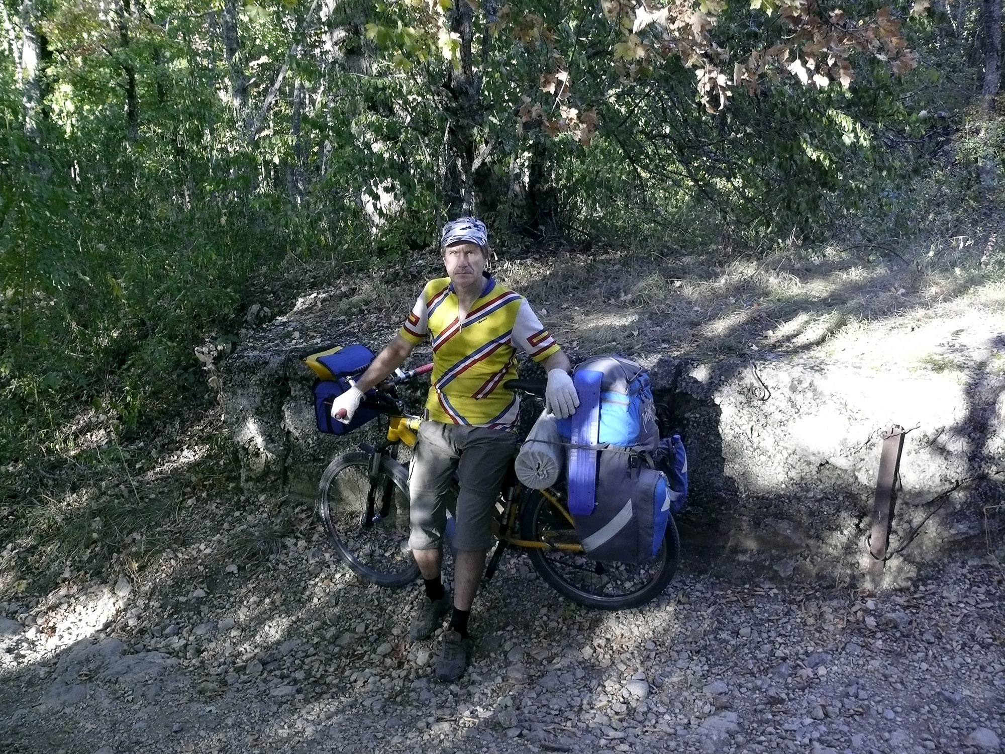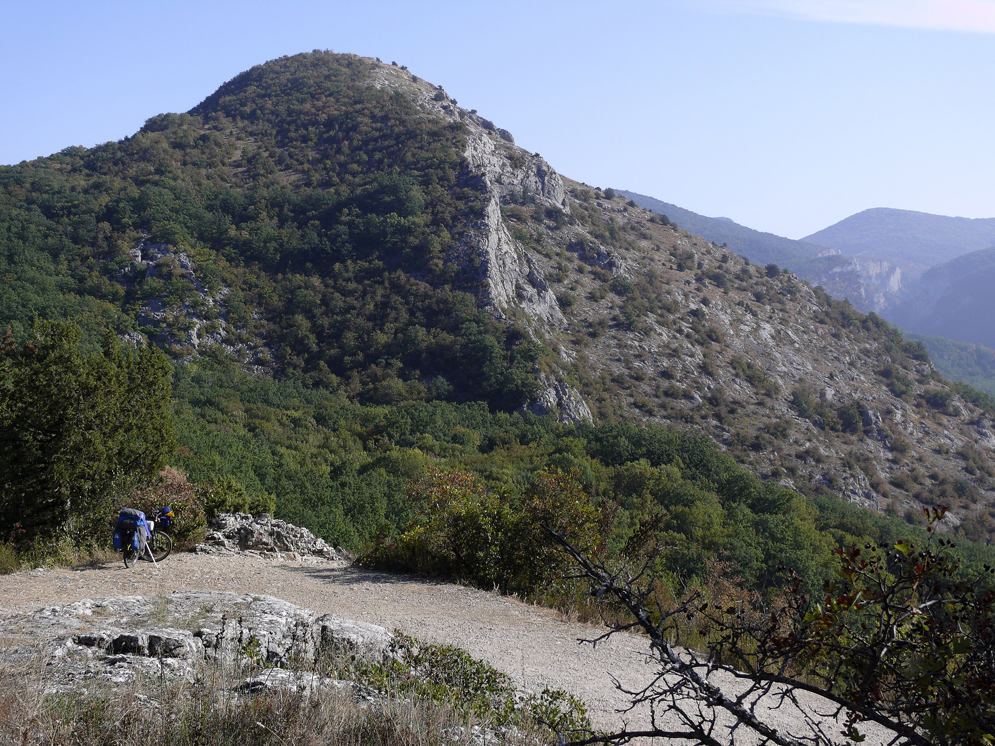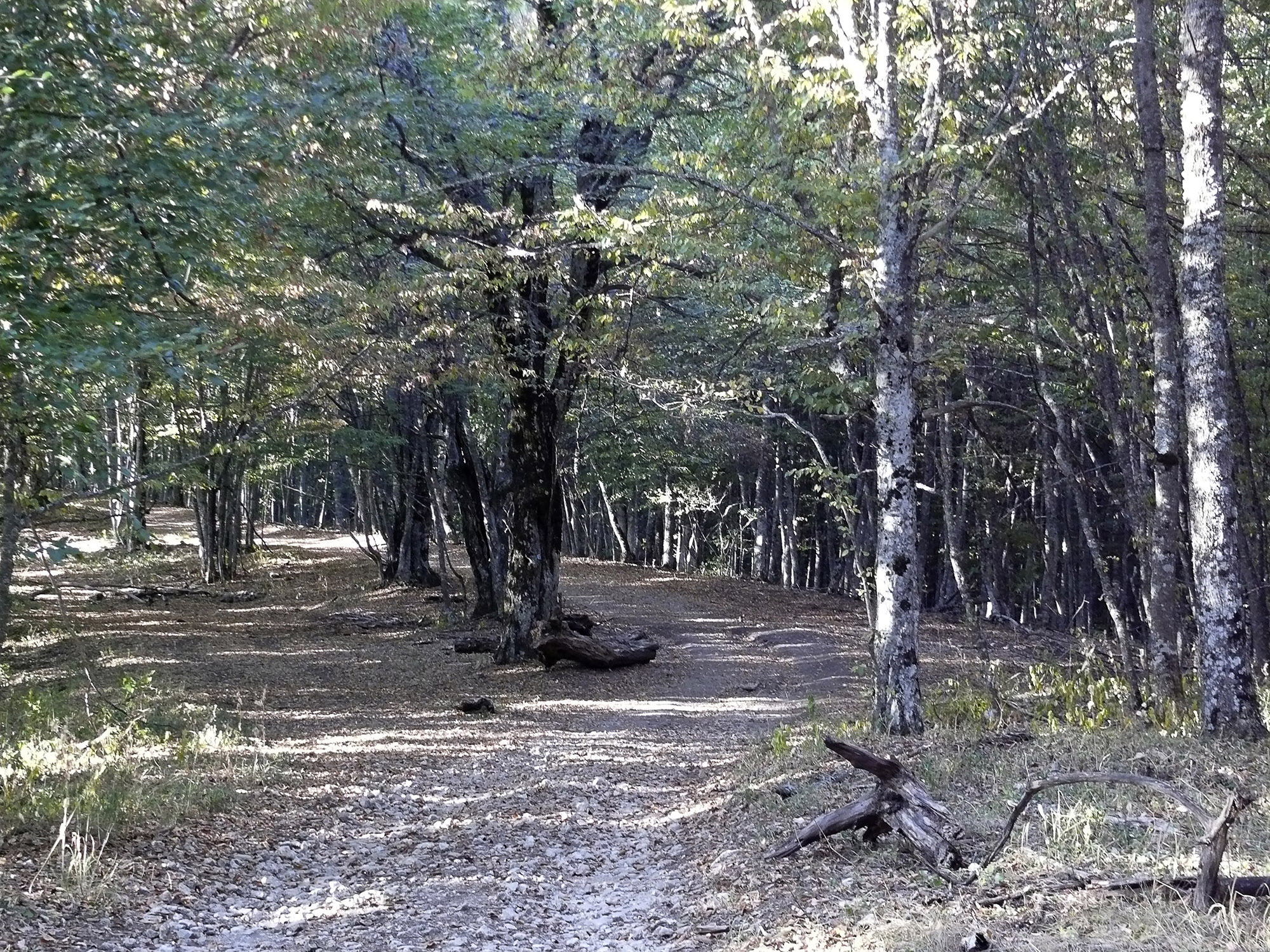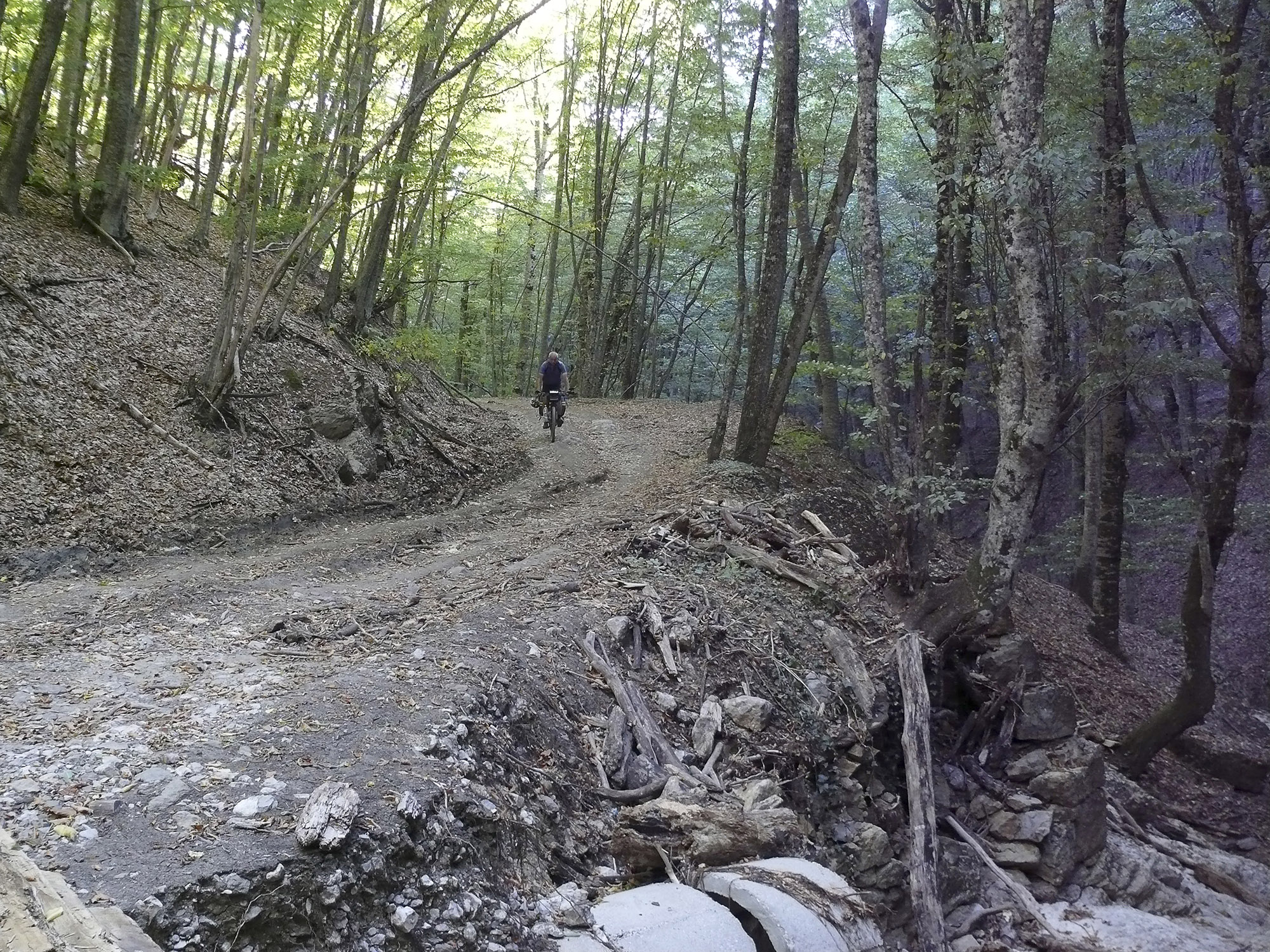 Для начала - пеший разогрев в гору, до поворота у бука. Ну а дальше, несмотря на каменистую и заваленную всяким лесным хламом дорогу, везде можно было ехать, поскольку основной уклон был вниз. По пути делали остановки, чтобы сфотографировать приметные места - поворот к Ай-Димитрию у трёх буков (фото 152), бетонный блок у дороги, где мы отдыхали в пешем походе 2014 года (фото 153), памятник с пещерой (фото 154) - в результате до Чайника мы добрались за час. А ведь ещё длинный спуск к Большому каньону... Чтобы сильно не задерживаться, решили сократить время на посещение местных достопримечательностей и поскорее выехать на шоссе. Тем более, что хотя дорога от Чайного домика шла всё время вниз, быстро ехать по ней не получалось - средняя скорость не превышала 7-8 км/ч (фото 155).