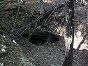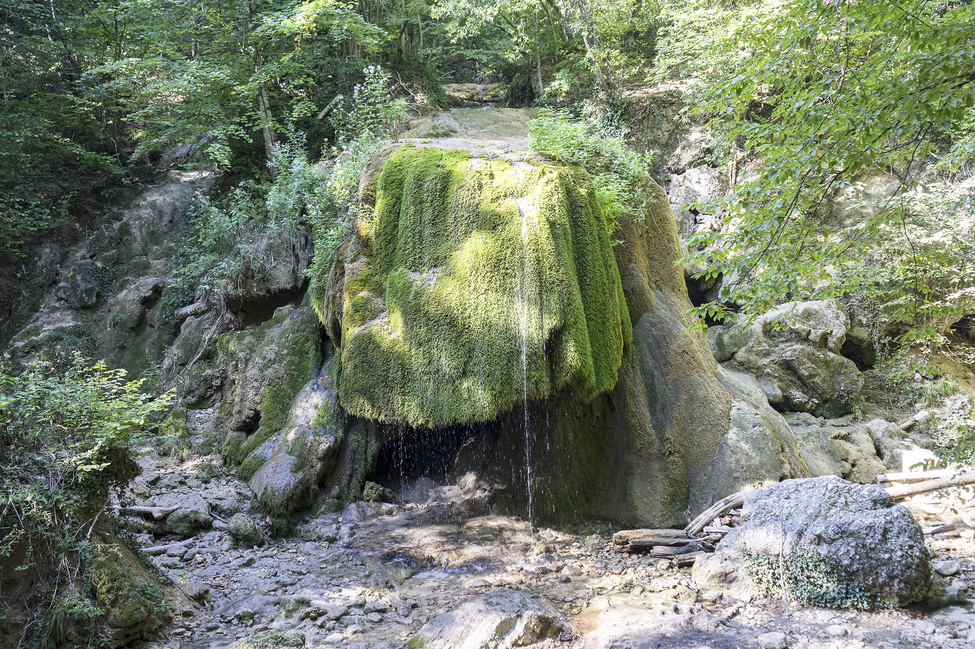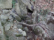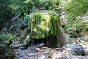 Почти два часа ушло на дорогу до Каменного Поворота... Но небольшой перекур был нужен - место достаточно зрелищное (фото 156). В отличие от Юсуповского озера, которое... было сухим до дна (фото 157), только небольшая струйка воды вырывалась из-под скалы и тут же уходила куда-то вглубь (фото 158). Водопад Серебряные Струи* , который питался от этого источника Врис, тоже практически не функционировал - об этом мне сообщил Виктор, который налегке сбегал по тропинке к водопаду и запечатлел его на фото (фото 159). Что ж поделаешь - осень, засуха. Конечно, зимой здесь было интереснее, на мой взгляд, только холодно и сыро.