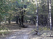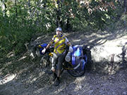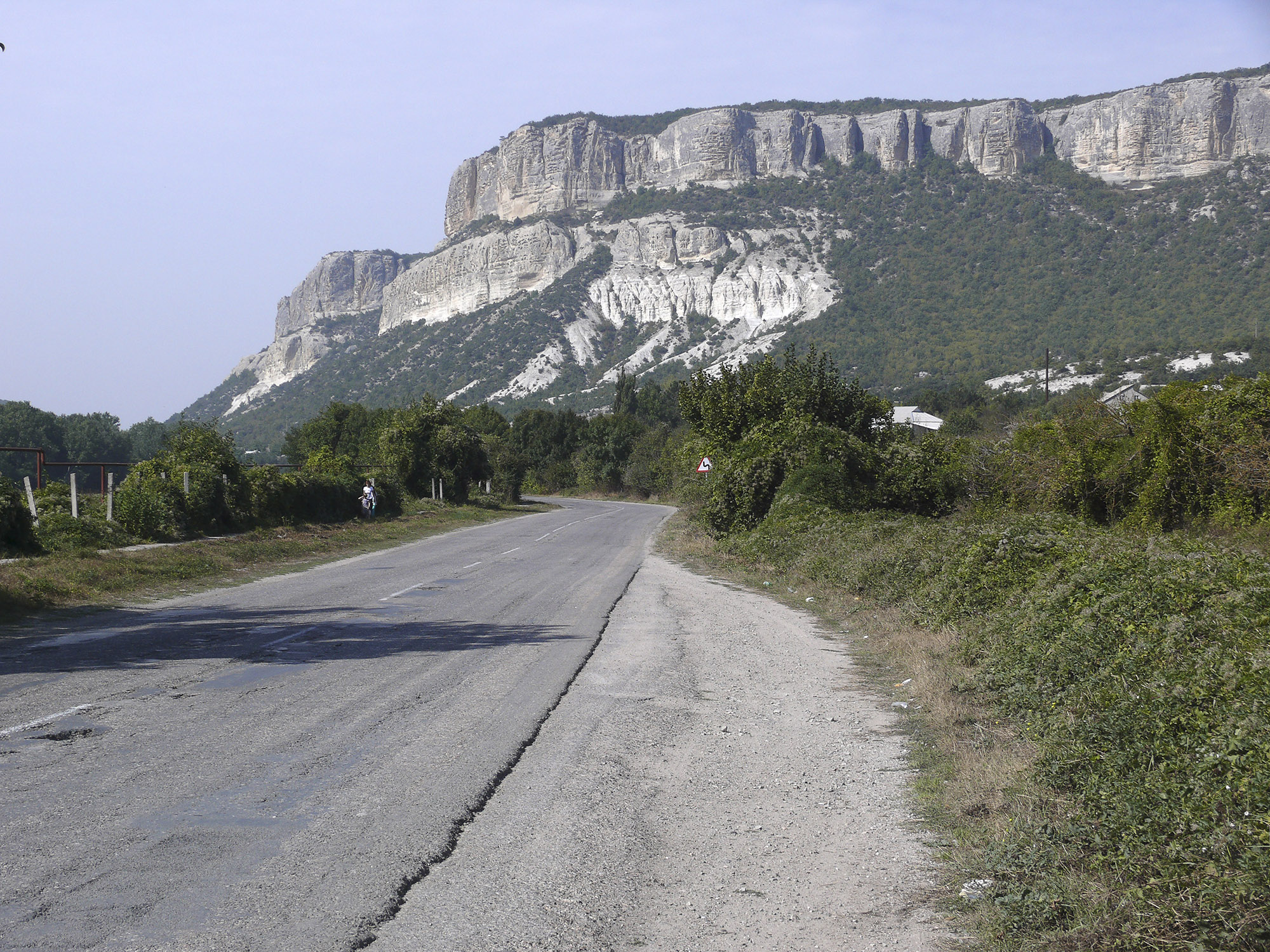 Поход Виктора к водопаду занял ни много, ни мало - полчаса. Надо бы уже и на асфальт выходить. Это торжественное событие произошло, когда на часах уже было начало двенадцатого. Я переобулся в велотуфли, и мы тронулись в сторону Соколиного. Дорога была знакомой, только сильно разбитой вплоть до Соколиного - видимо, никому не нужно ремонтировать дорогу, по которой мало кто любит ездить, кроме велосипедистов. Зато после села качество полотна заметно улучшилось: многие участки сверкали новеньким асфальтом; дорогу расширили в этих местах, а нетронутое старое покрытие вполне было пригодным для езды. Мы достаточно быстро долетели до Танкового, остановившись лишь перед Малым Садовым, чтобы сфотографировать для отчёта обрывы Внутренней гряды в районе урочища Медведь (фото 160). Заодно набрали яблок, таких кислых и твёрдых, что съесть даже одно было мучением...
