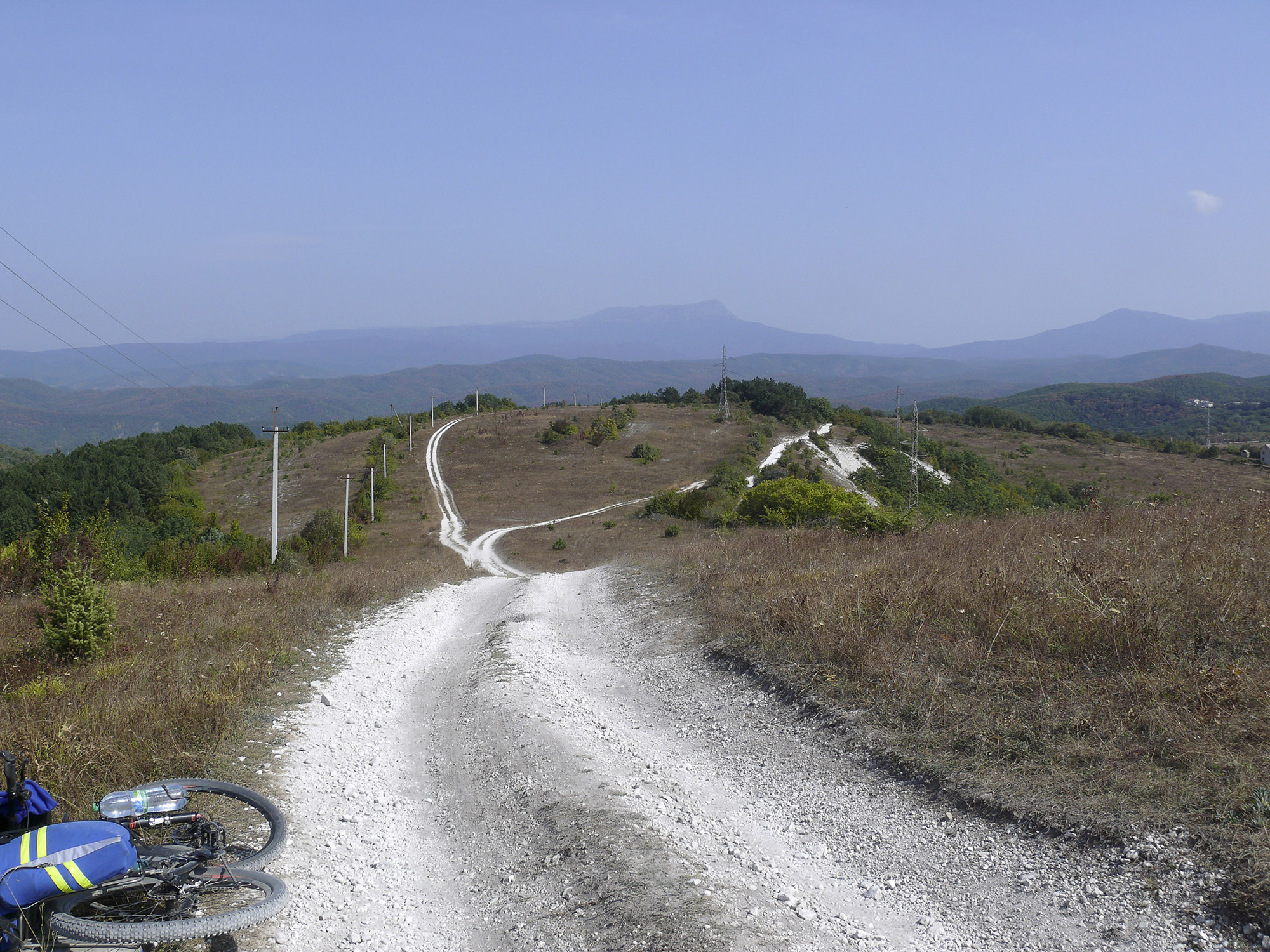 После развилки на Прохладное дорога повернула вправо и начала потихоньку подниматься по склону в сторону Сель-Бухры. Как я понял, колея была проложена по нитке газопровода; здесь же проходила ЛЭП. В общем, обычная лесная дорога, местами довольно разбитая, из-за чего приходилось идти пешком. И, если бы не деревья, которые создавали хорошую тень, нам пришлось бы изрядно попотеть - ведь уже наступил полдень, и солнце жарило на полную катушку.