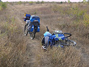 ...Которая привела нас на маленькую полянку со старым кострищем, где и благополучно закончилась... Снова оставляю велосипед и пешком, но уже без навигатора (тут он только будет мешать) пытаюсь найти тропу. Через двести метров продирания через крючковатые ветки удалось выйти к свету, а если быть точнее - на край балки Бжава. Здесь - о, счастье! - нашлась тропинка, которая бежала вдоль самой кромки крутого берега балки, и вроде бы в нужном направлении. Принимая желаемое за действительное, я вернулся к велосипедам и заскучавшему Виктору с этой новостью. Хватаем велики и с новой энергией начинаем форсировать поваленные деревья, чтобы побыстрее выбраться из этих дебрей. И вот мы на тропинке - казалось бы, всё нормально, но что такое? Тропа опять растворилась, подумав, наверное, что мы, аки вóроны, парящие над нами, сейчас тоже разбежимся и взмоем ввысь над этими холмами... (фото 30)