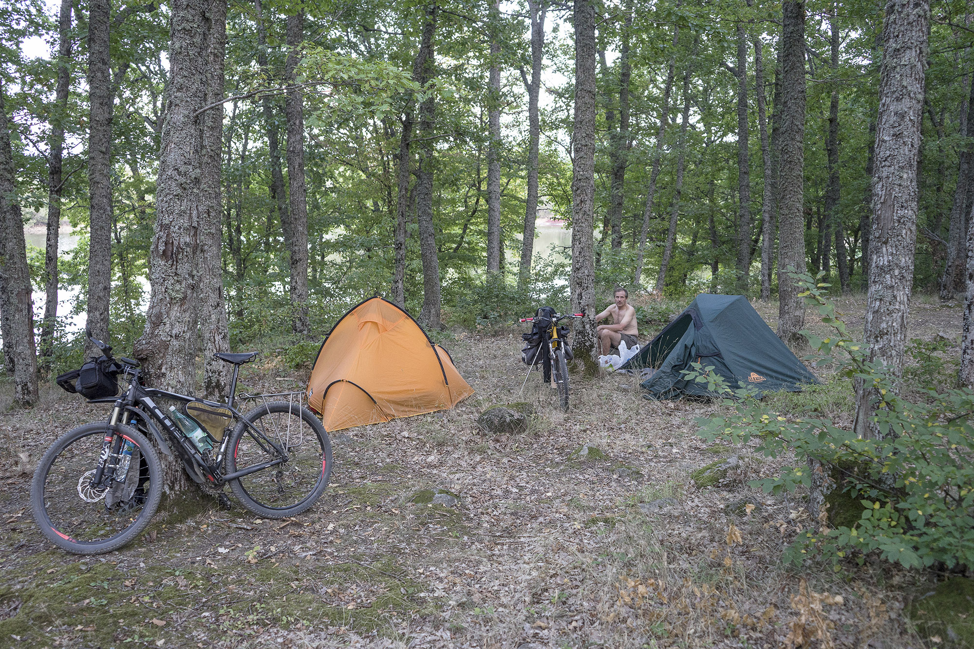 Пока ходил туда-сюда, туча рассосалась, ушла куда-то, так и не пролив на нас ни капли дождя. Это было хорошо, поскольку дорога наверх оставалась сухой и твёрдой. Сидеть около беседки уже надоело, поэтому мы переместились на противоположный берег (фото 83, 84), чтобы начать готовиться к ночлегу. Выбрали полянку подальше от дороги и воды - если вдруг опять кто-то приедет ночью жарить шашлыки или рыбачить, быть от них подальше (фото 85). Несмотря на обилие дров и наличие кострища, огонь не разводили почему-то. Кстати, и лосиных мух здесь, к счастью, было немного, несмотря на лиственный лес вокруг. Да что говорить - место для ночёвки отличное, даже источник воды есть. Странно только, что, несмотря на конец рабочей недели к озеру не прибыли отдыхающие - место располагает... Только по дороге проскакали несколько всадников, и всё - тишина. Только рано я радовался - гости всё-таки появились...