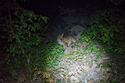 В этот вечер мы легли позже обычного - пока ужинали, пока гонялись за лисой, - время прошло быстро. Пустая банка от тушёнки продолжала стоять в стороне от палаток, но, как только мы выключили фонари, лиса вернулась и всё-таки утащила её - мы даже не успели среагировать... Ну уж теперь она успокоится - думали мы, и, наконец, после вина и чая с мятой, разошлись по палаткам. Двойная доза мяты подействовала быстро и неотвратимо - я плавно погружался в царство Морфея, и уже почти заснул, как вдруг услышал какой-то шум, возню - блин, опять эта лиса! Чего ей теперь-то нужно? Я посветил фонариком из палатки - она стояла в пяти шагах от меня и не думала убегать... Тогда я заорал на неё, что подействовало - рыжая развернулась и убежала, но сдаваться она не собиралась! Я опять забрался в палатку, но сон уже был сбит, я просто лежал и прислушивался, что будет дальше. Опять шаги, шорох и шум - теперь уже у палатки Виктора - нет, там уже идёт борьба! Так дело не пойдёт! Пришлось одеваться и вылезать из палатки. Виктор тоже вылез и безуспешно пытался найти свою сандалию... Я стал светить вокруг себя фонарём, и обнаружил на тропинке какие-то разноцветные мешки. Оказалось, это были чехлы от Викторовых вещей... Также невдалеке нашёлся мешок с колышками. А где же ботинок??? Тут уж начались широкомасштабные поиски. Ботинок нашёлся, но в противоположном от тропы месте. Не было только чехла от палатки и спальника. Ночные поиски результата не дали, решили утром поискать. А Виктору пришлось оставшиеся вещи запихивать теперь уже внутрь палатки, чтобы сохранить то, что осталось...