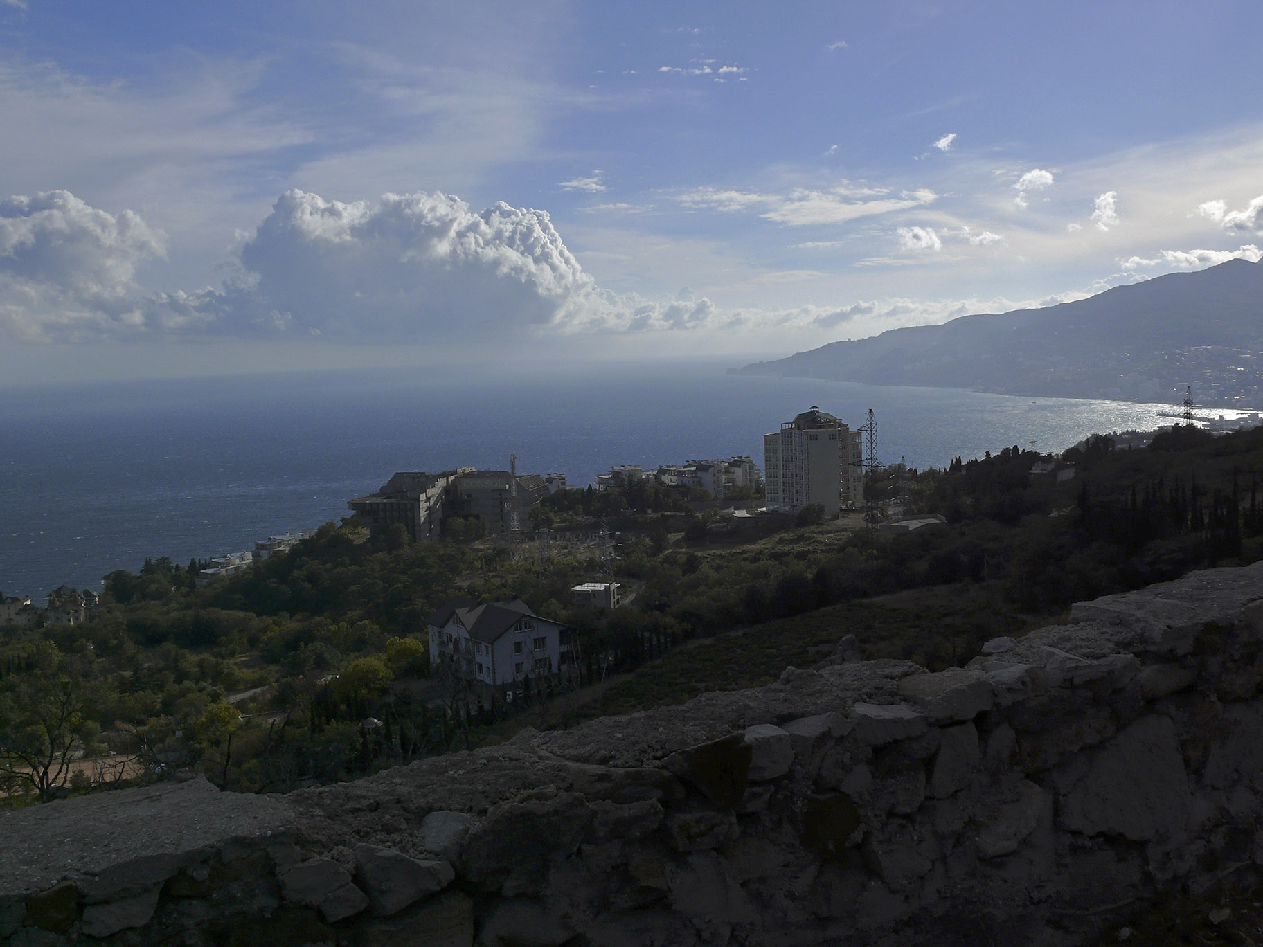 Засняв для отчёта виды: строящегося здания на месте приюта (фото 106), Вид на Ялту (фото 107), памятник партизанам (фото 108) и пейзаж со скалой (фото 109), я пошёл разведать насчёт обеда. Зная, что цены здесь кусаются, я поосторожничал: заказал порцию лагмана с лепёшкой и бокал вина. Вино принесли сразу, а лагман ещё доваривался; бокал же ушёл быстро... Попросил ещё один, и теперь цедил его подольше. Наконец, принесли лагман. Нельзя сказать, что он был невкусным или неправильно приготовленным, но, что мне не понравилось - он был слишком острым, да и мясо жестковатое, и за этот нехитрый и не особо обильный перекус мне пришлось выложить 700 рублей... Ай-яй-яй! Бюджет тает на глазах... Уже половину запасённой суммы истратил, а ведь только четвёртый день пути!! Надо будет умерить свои желания...