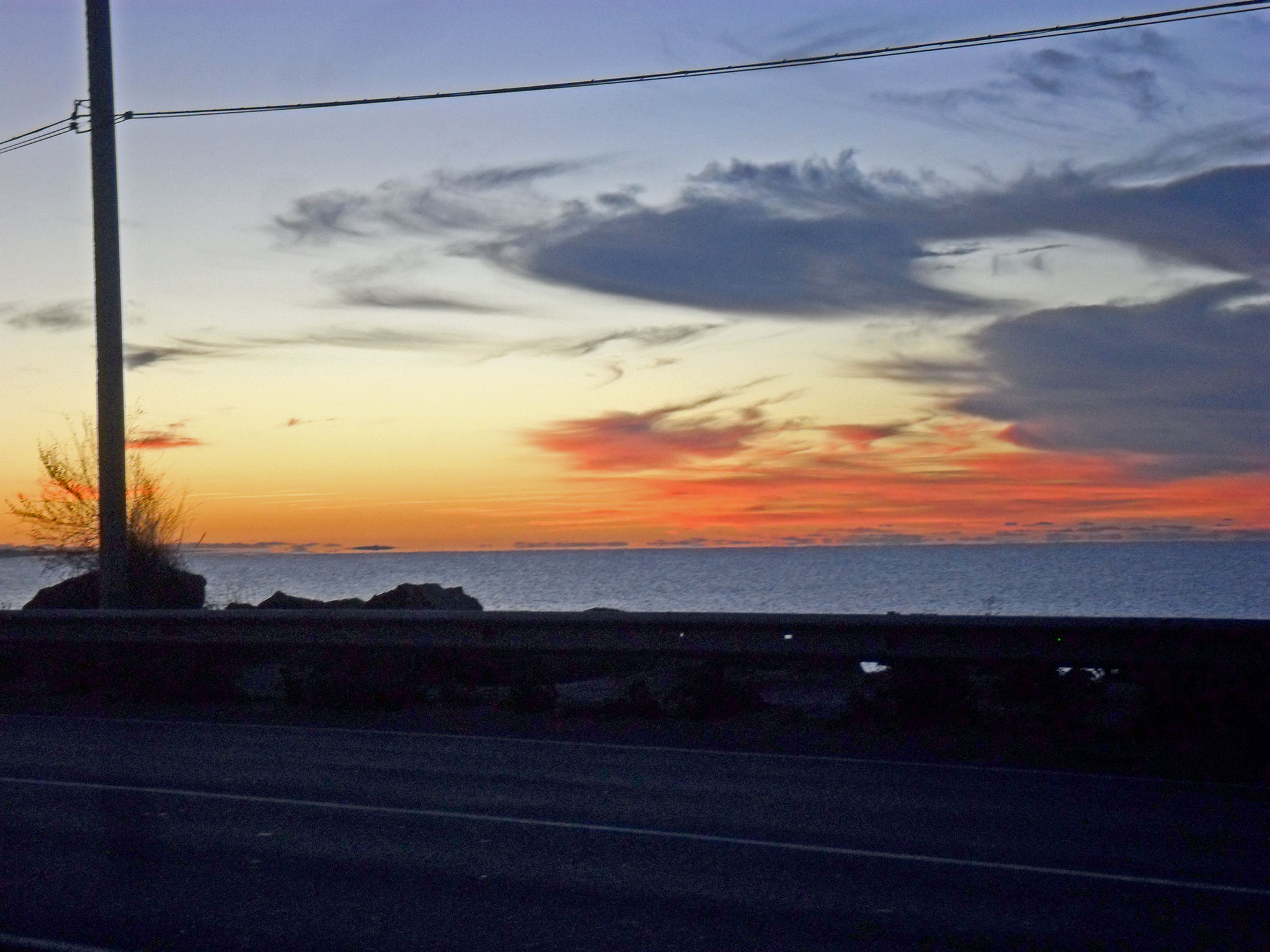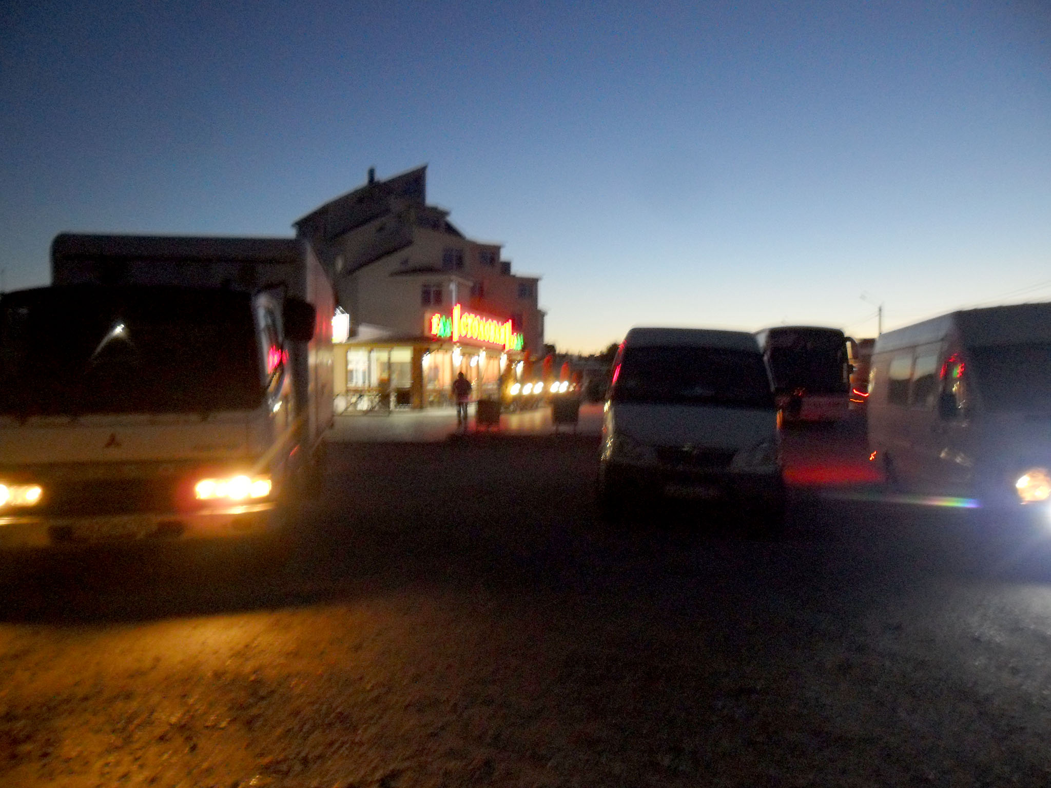 В Береговом сделали остановку: Водитель пошёл перекусить (фото 7), пассажиры разбрелись по кустам справить малую нужду. Уже начало светать: над морем заалел восток. Поскольку мой кофр с фотоаппаратом находился в велорюкзаке, который находился в багаже, я пытался снять восход на мыльницу, но освещение было слишком слабым и кадр вышел смазанным (фото 8). В кафе я не пошёл, поскольку в пакете у меня были пряники, купленные в Ростове, и бутылка с чаем, который я приготовил ещё в поезде. Утро, как и ожидалось, было холодное; немного размявшись и подышав крымским воздухом, я полез в тёплый автобус.