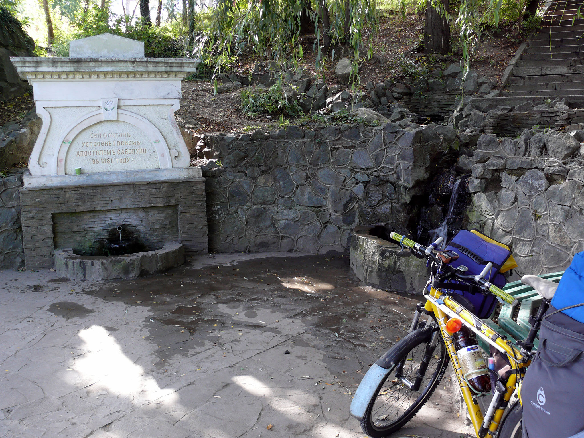 Сборы заняли полчаса, и, поскольку дорога была знакома, не особо мешкая, я тронулся в путь. В Симферополе у меня было запланировано два места, которые надо было посетить: это родник грека Савопуло и магазин "Вертикаль" за газовыми баллонами. Родник находился в самом центре города, за памятником Екатерине II (фото 9). Я без труда нашёл его и заполнил баклажку. Потом поехал к жд вокзалу, но бес попутал, и на Советской площади свернул не туда... Пришлось делать крюк, возвращаться и выходить на запланированный трек.