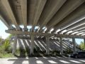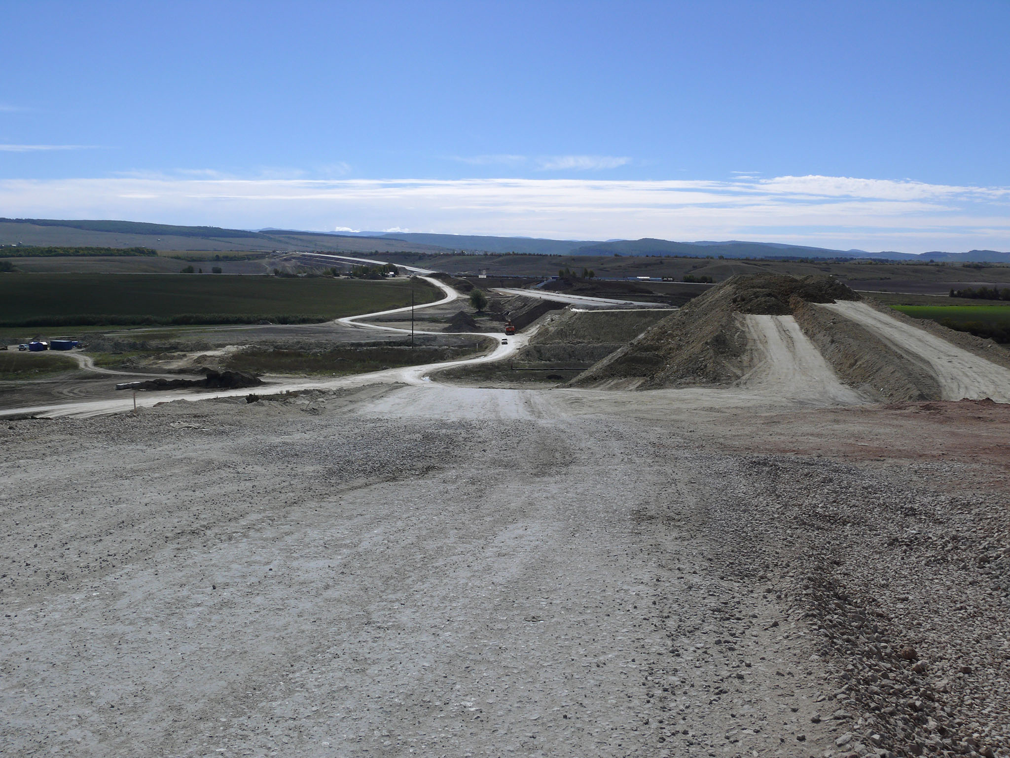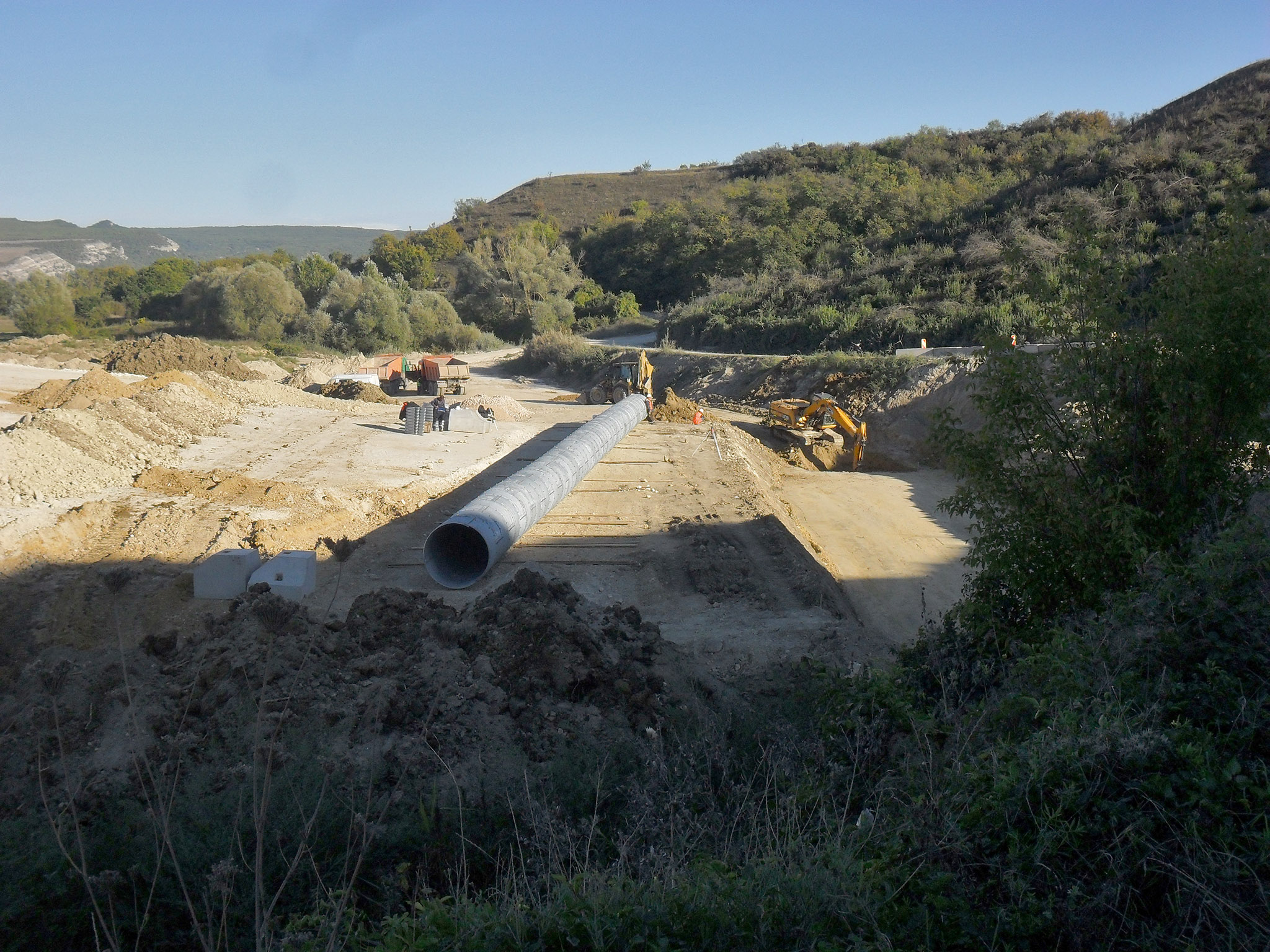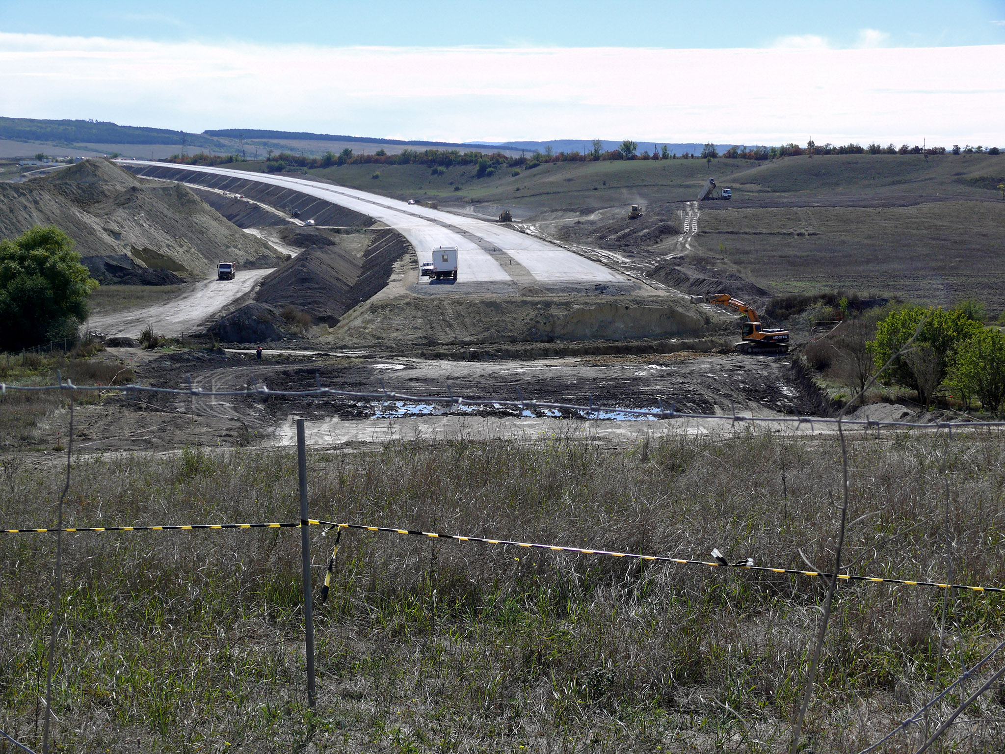 Доехав по Николаевской трассе до строящегося объезда Дубки-Левадки (фото 11), я повернул налево и некоторое время ехал по щебнистому участку трассы до начала асфальта. Почему-то никто не занимается строительством путепровода и соединением Николаевской трассы с новым объездом... Зато асфальтированный кусок - это просто фантастика (для Крыма) - широченная проезжая часть, идеально укатанный асфальт, и, главное - ни одной машины (пока!). Этот участок, вплоть до реки Западный Булганак практически готов, только остались мелкие работы по ограждению и освещению. Я наслаждался ездой по хайвею, а рабочие приветственно махали руками... (фото 12) Наконец я своими глазами увидел Выемку - это была раньше гора, которую срыли до основания, чтобы сгладить профиль дороги. К сожалению, трасса в трёх местах ещё не достроена: у вышеназванной реки прокладывают газопровод (фото 13), у Трудолюбово были проблемы с отводом земель под строительство (фото 14), и пока не готов мост через жд ветку на Севастополь. Так что после лихого спуска мне пришлось сворачивать на старую дорогу через Чистенькое. Но я ещё немного полюбовался видами строящейся магистрали, а также переложил некоторые вещи в рюкзаке, которые лежали не на своём месте.