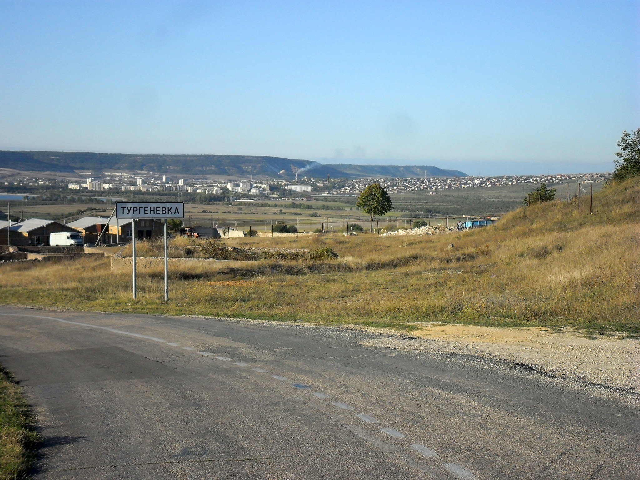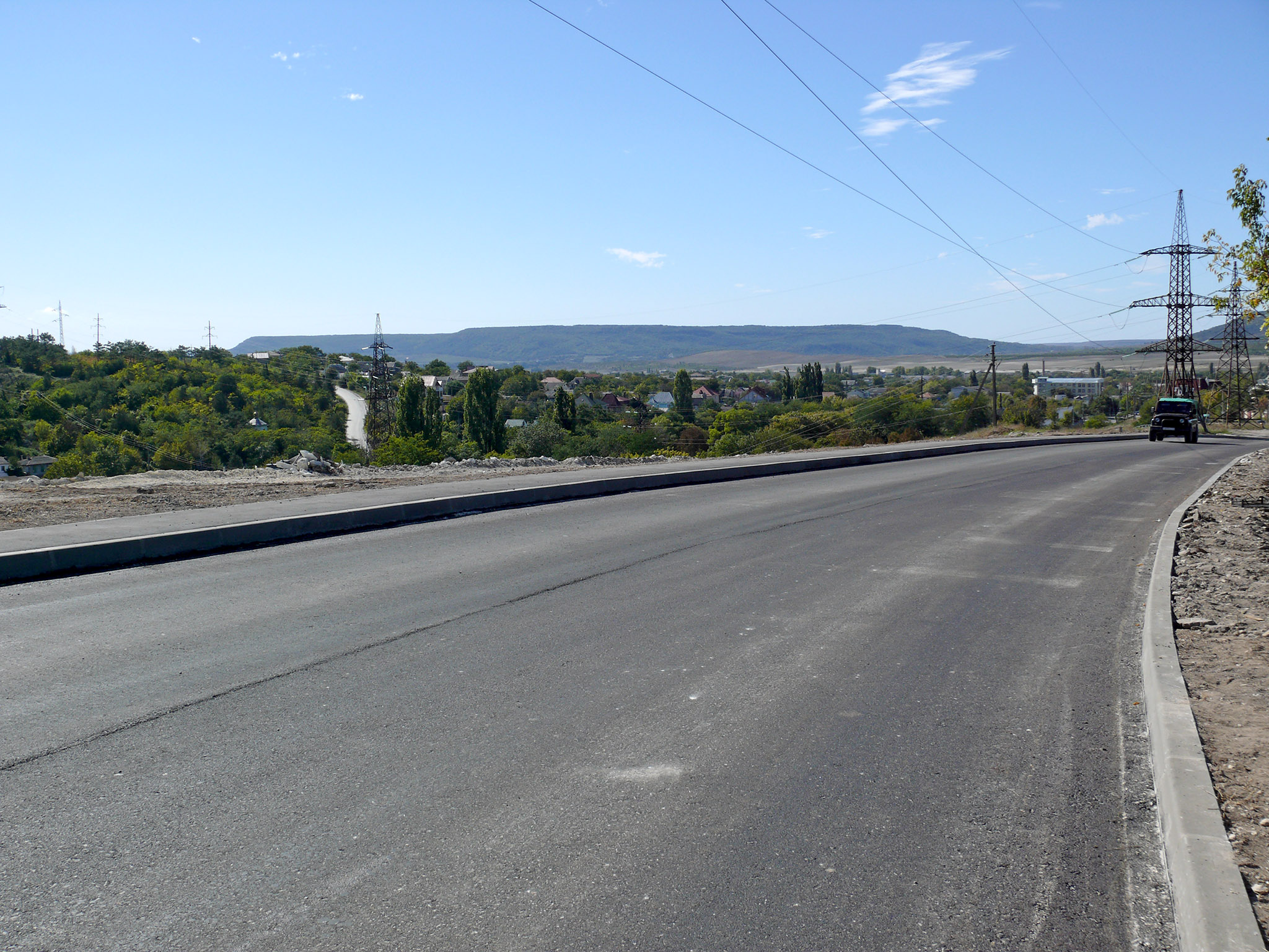 Теперь самое время свериться с графиком. Конечно, из-за опоздания автобуса у меня было отставание. Надо было немного сократить сегодняшний маршрут. Решил не ехать на менгирную балку, т.к. там сложный рельеф, а сразу ехать в Бахчисарай. Так или иначе надо было выезжать на действующую трассу Симферополь-Севастополь и следовать в общем потоке машин. Вот здесь я попал конкретно... Нет, вначале ещё ничего было - дорога была более-менее свободная - до Севастьяновки я доехал нормально. А вот после начался кошмар: здесь полным ходом шла реконструкция дороги, справа шла отсыпка, укатка нового полотна, а старую дорогу сузили, да ещё поставили бетонные блоки по краю, так, что на обочину не съехать. Особенно тяжко приходилось на подъемах: моя скорость падала, а идущие сзади грузовики из-за узости не могли меня обогнать, и приходилось несколько раз останавливаться, прижимаясь к бетонному ограждению, чтобы пропустить вереницу большегрузов..