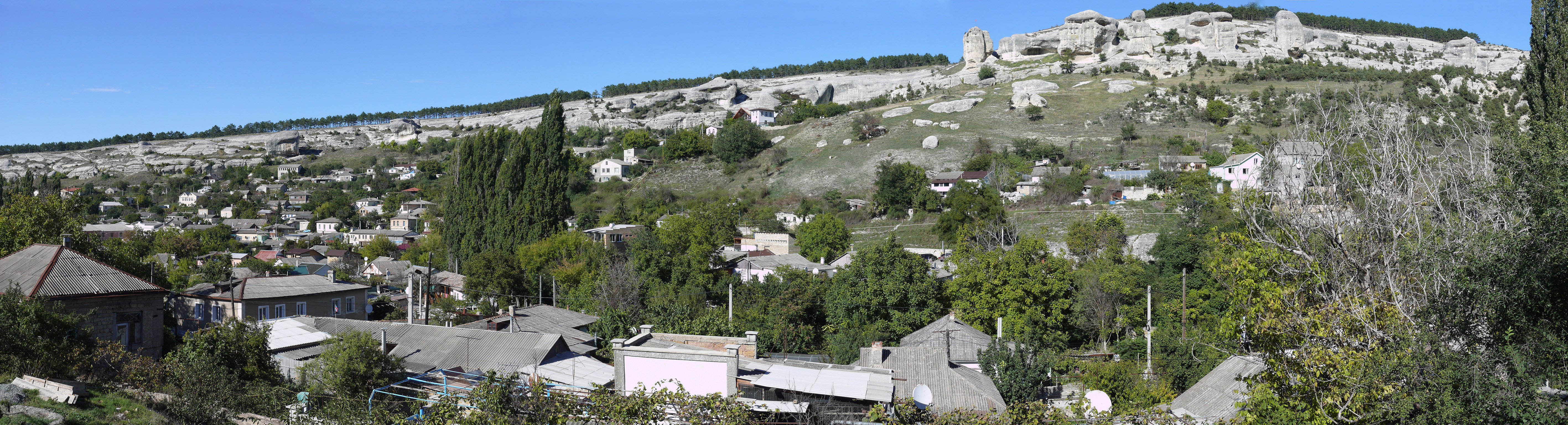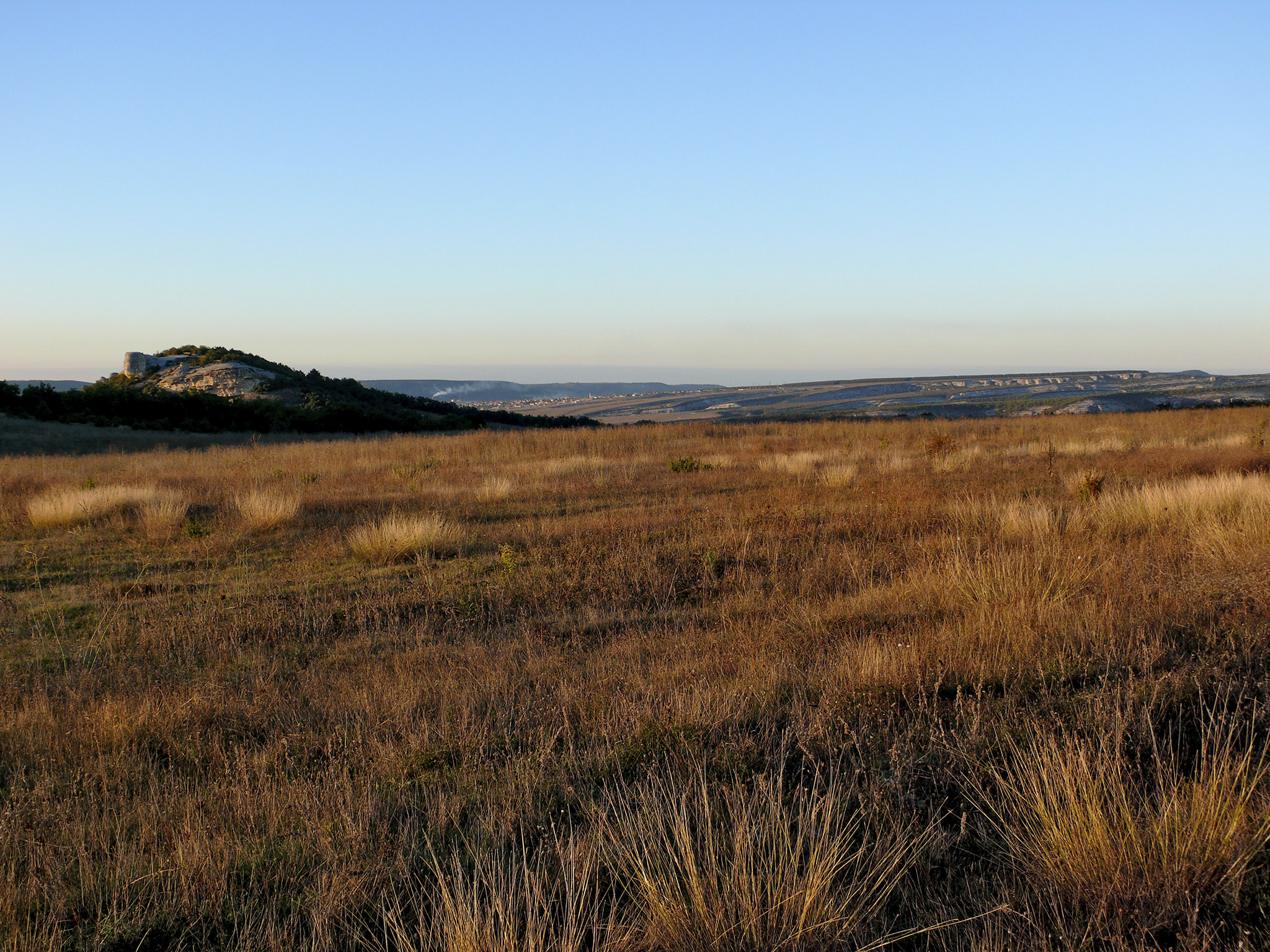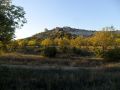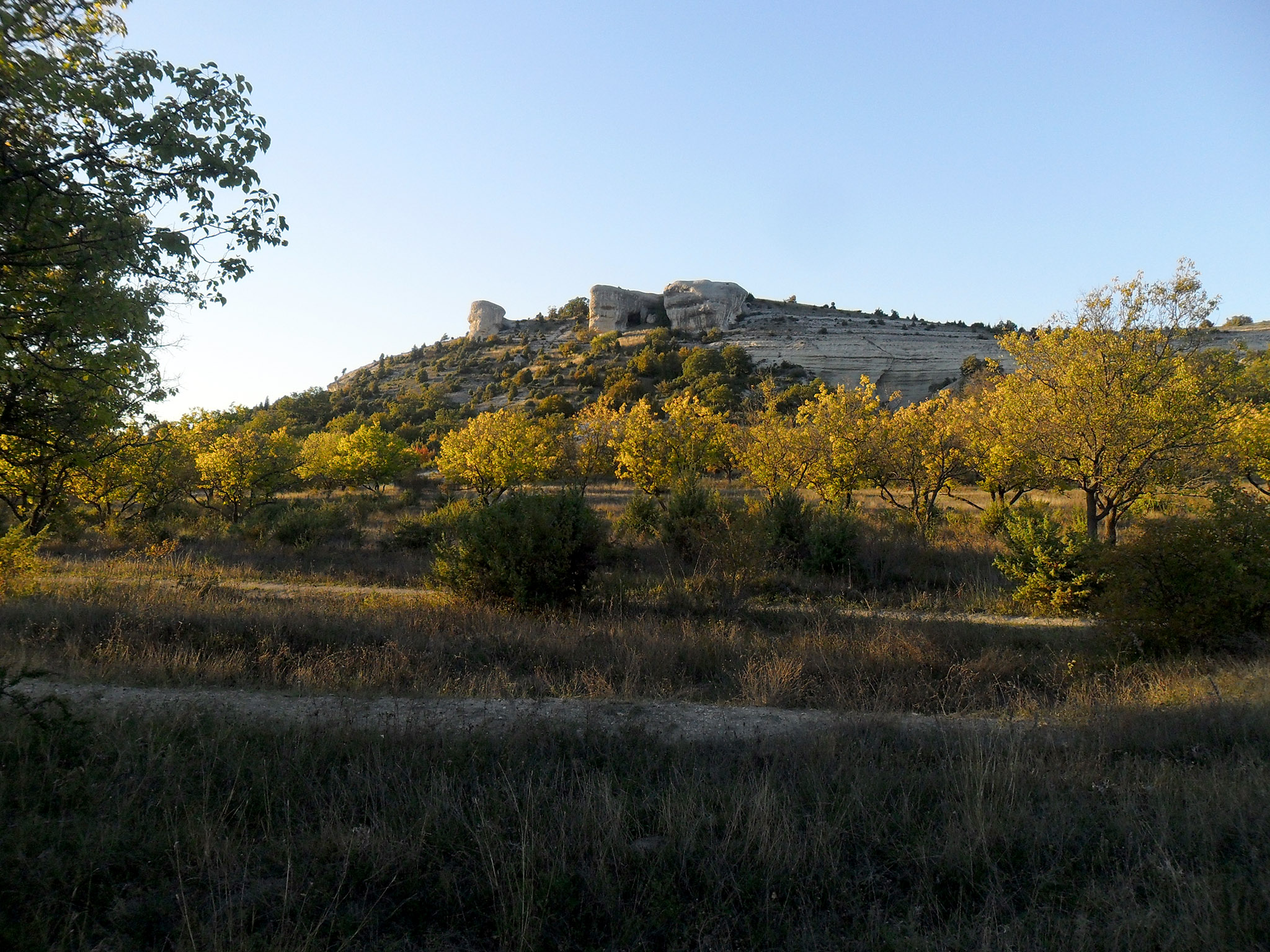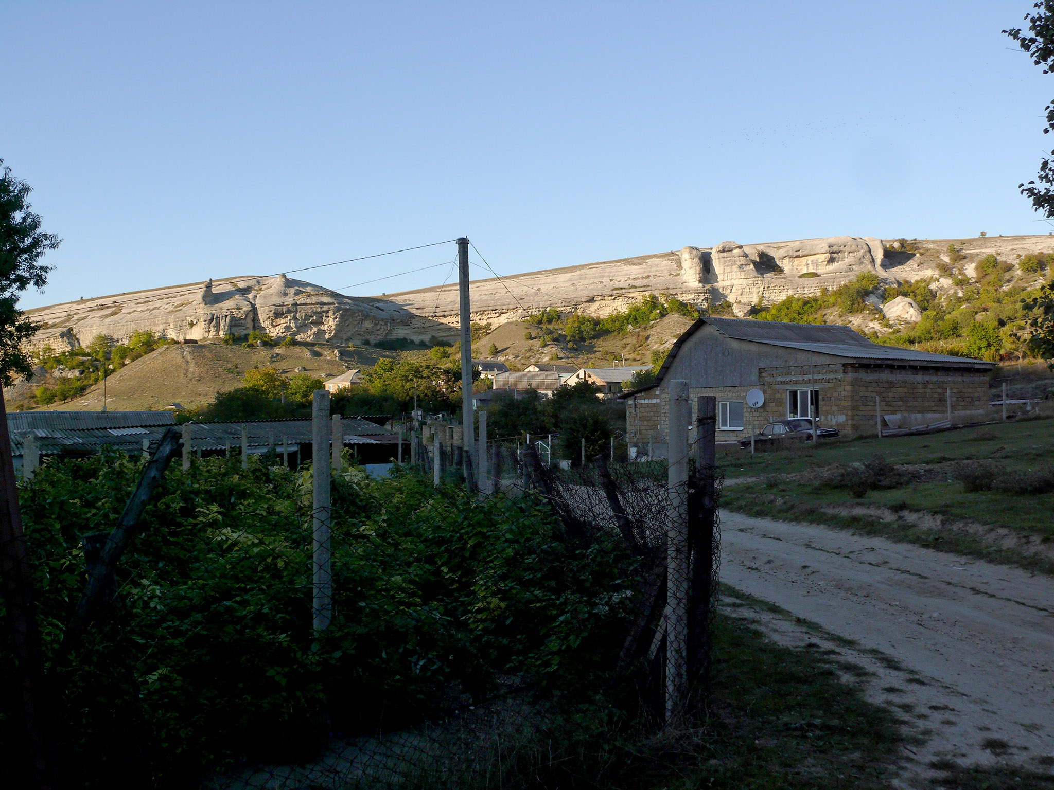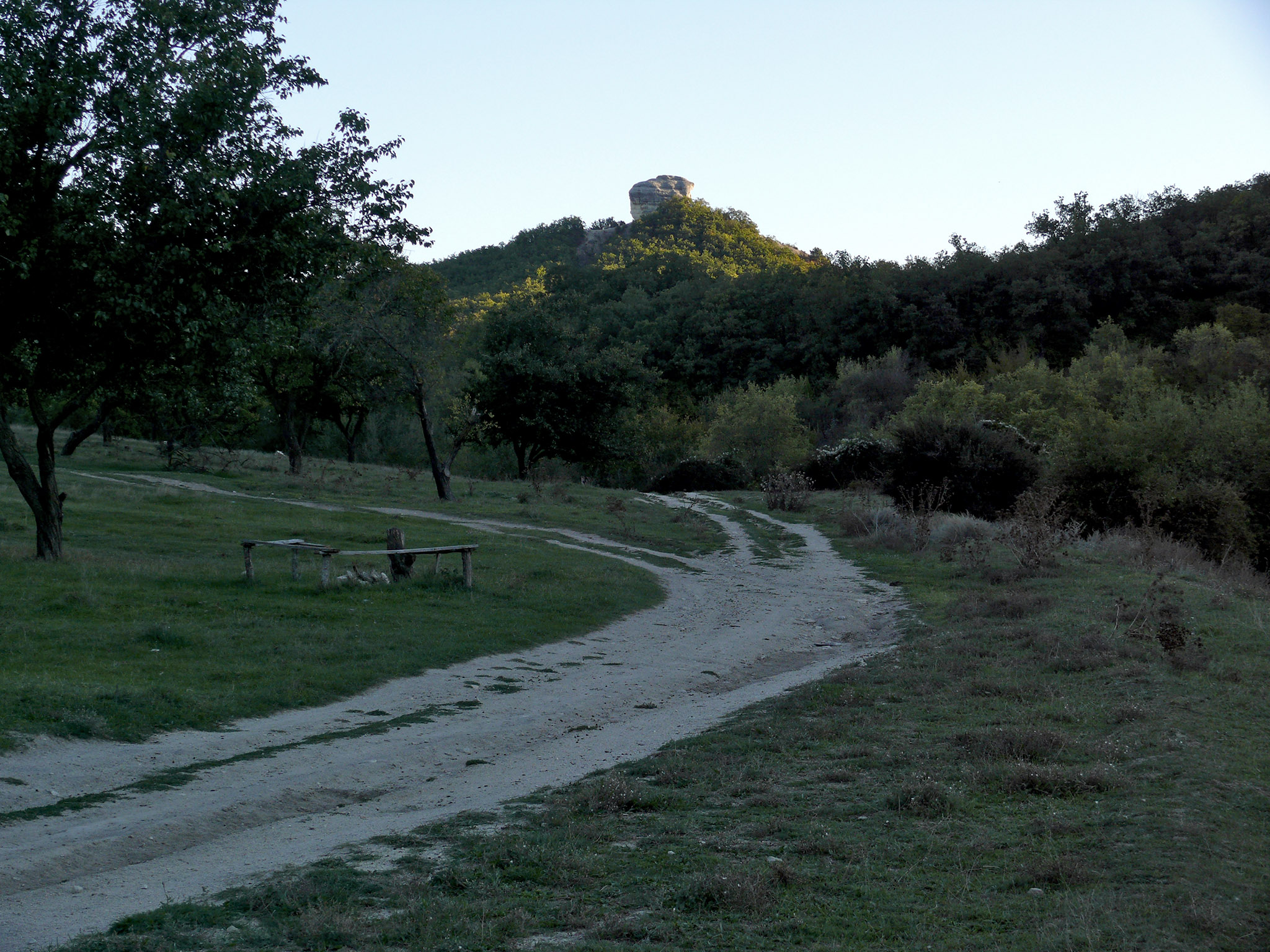 До конечной точки сегодняшнего пути мне предстояло проехать ещё два села - Тургеневка и Белокаменное. В Тургеневке (фото 24) увидел магазин, в котором купил минеральной воды. День подходил к концу, силы мои также были на исходе, поэтому часть оставшегося пути шёл пешком, в расчёте на то, что даже при скорости 5 км/ч я смогу добраться до ночёвки перед наступлением темноты. К тому же можно спокойно наслаждаться вечерними пейзажами: вот справа - Курбан-Кая (фото 25), слева в лучах заходящего солнца - скала Шапке-Кая и Уч-Кая... (фото 26)
