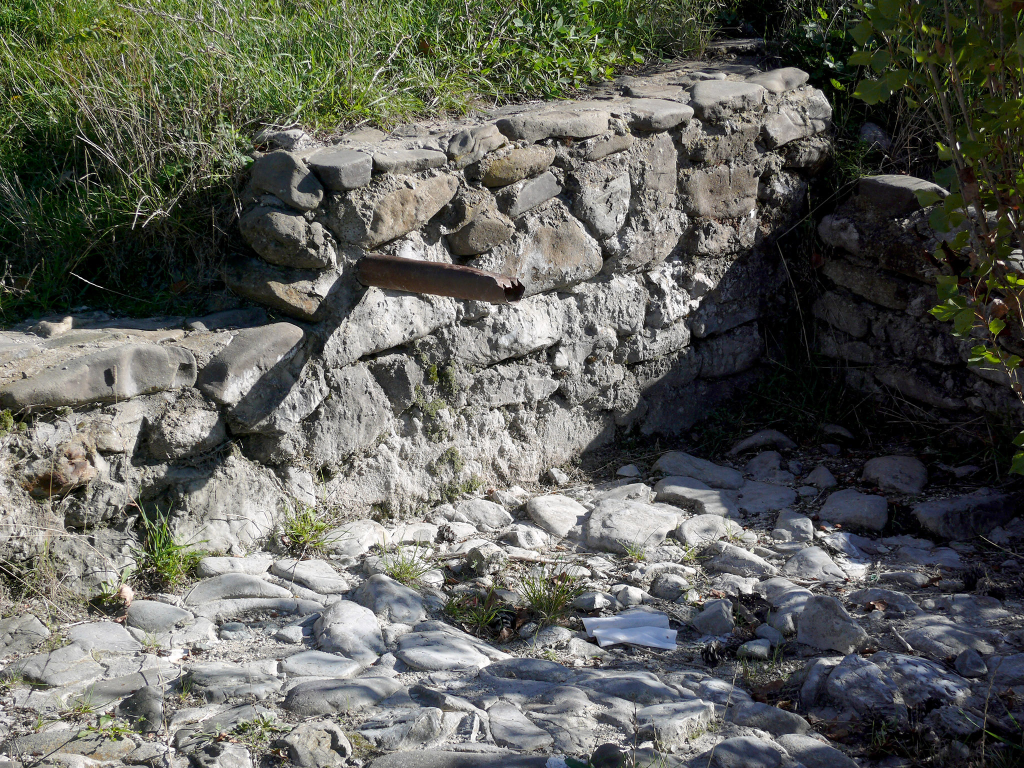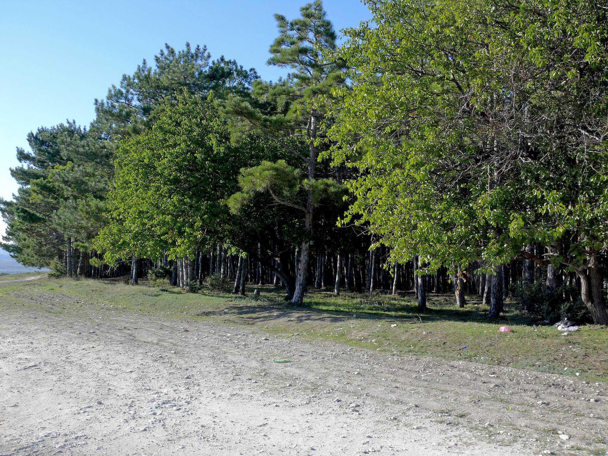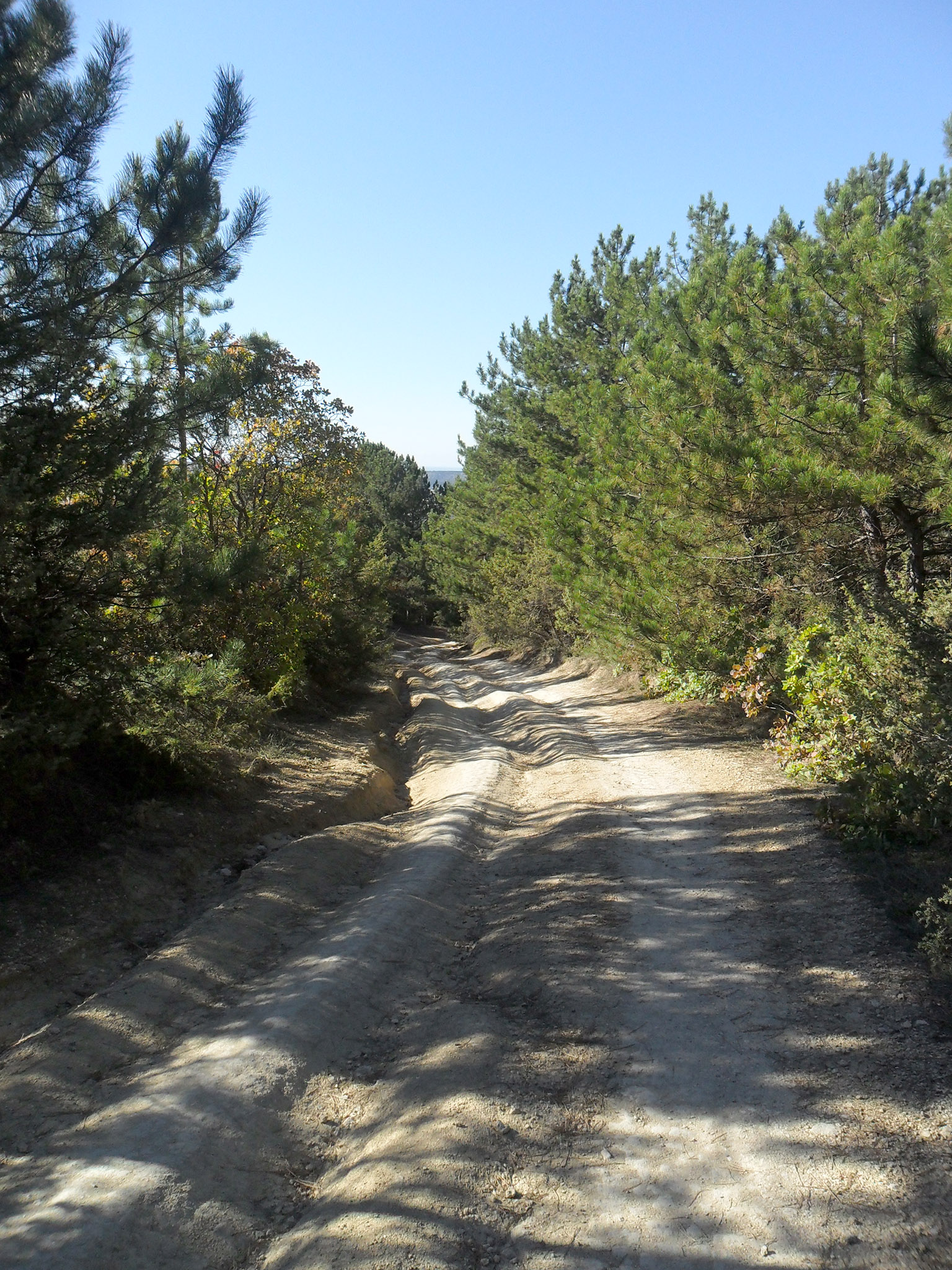 Последние сто метров перед перевалом были особенно трудны: даже идти приходилось с остановками (фото 18). А ведь сегодня надо на Алимову балку залезть. Но вот, наконец, подъём закончился, я подъехал к Юсуф-Чокраку, но родник был сух, то есть абсолютно, ни малейшего признака воды (фото 19). Стоянка довольно обширная, есть столики, скамейки, но повсюду мусор и грязь, я бы здесь останавливаться не стал. И даже задерживаться здесь не имело смысла, и, после глотка вина, я развернулся и проследовал к скалам у балки Первой (странное название).