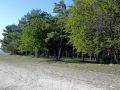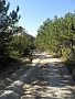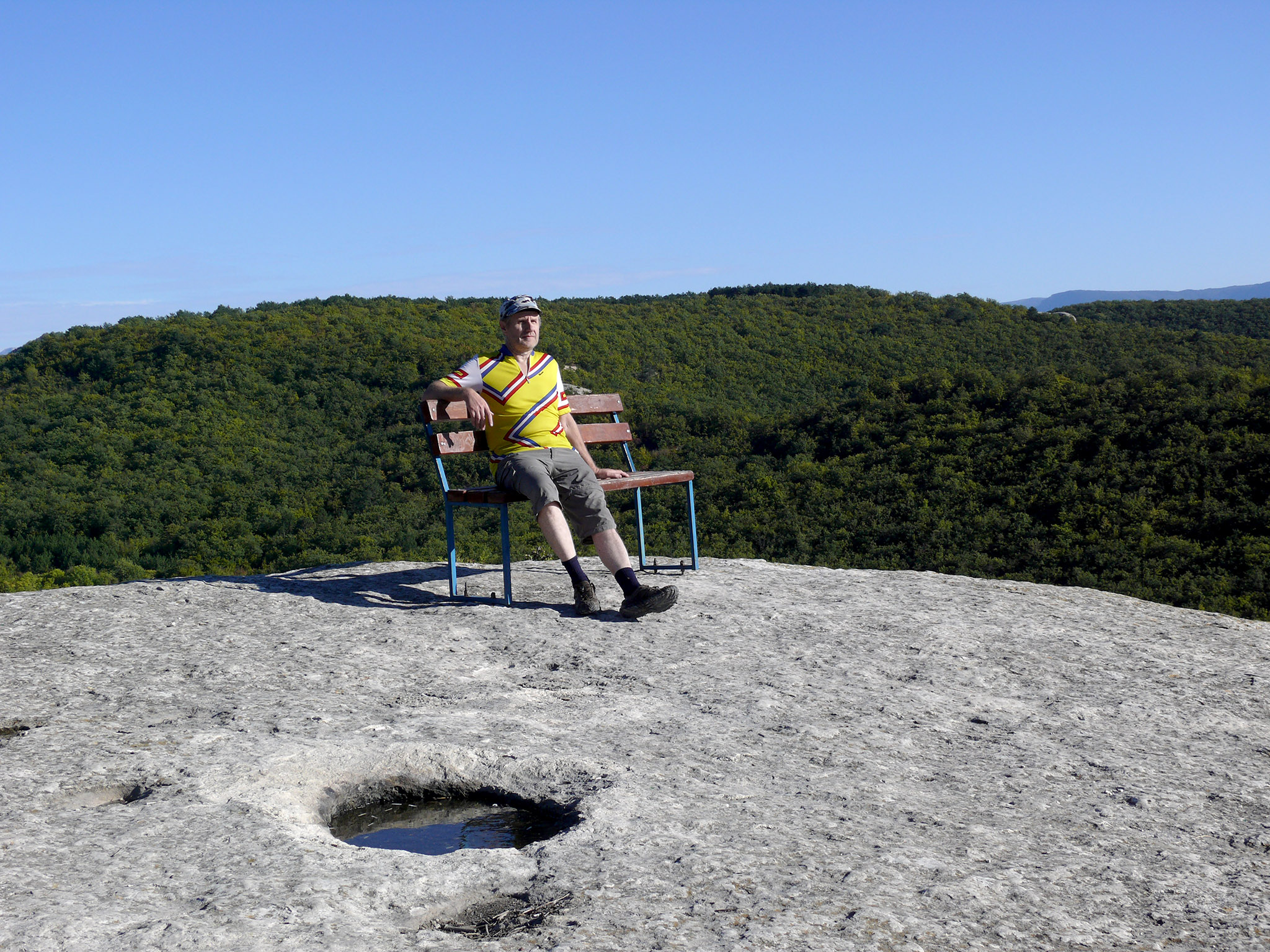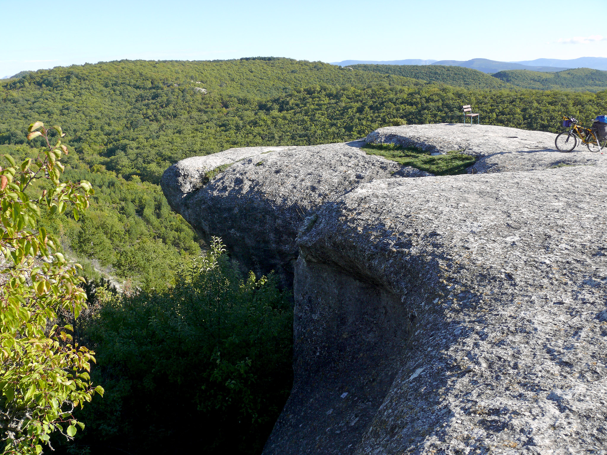 Здесь, на скале, нововведение - поставили скамейку. Так как в округе кроме меня никого не было, то фотографироваться пришлось с помощью автоспуска: велосипед ставил на ногу, фотоаппарат - на рюкзак, нажал на кнопку - и бегом на лавочку (фото 20). Главное, не споткнуться, а то вниз можно улететь (фото 21). Вспомнился сентябрьский поход 1990 года: где-то в этой рощице мы ночевали тогда... (фото 22) Красивое место, нечего сказать! И погода на славу. После фотосессии - небольшой расслабон: вниз, на трассу!